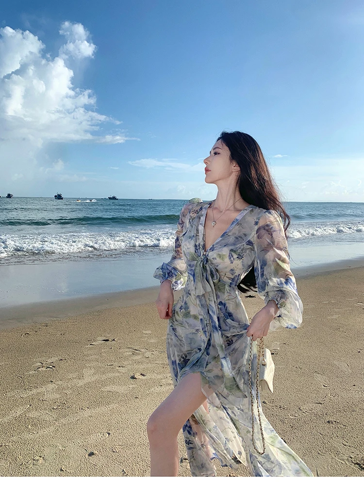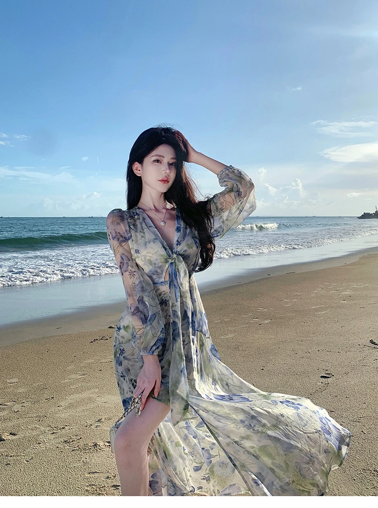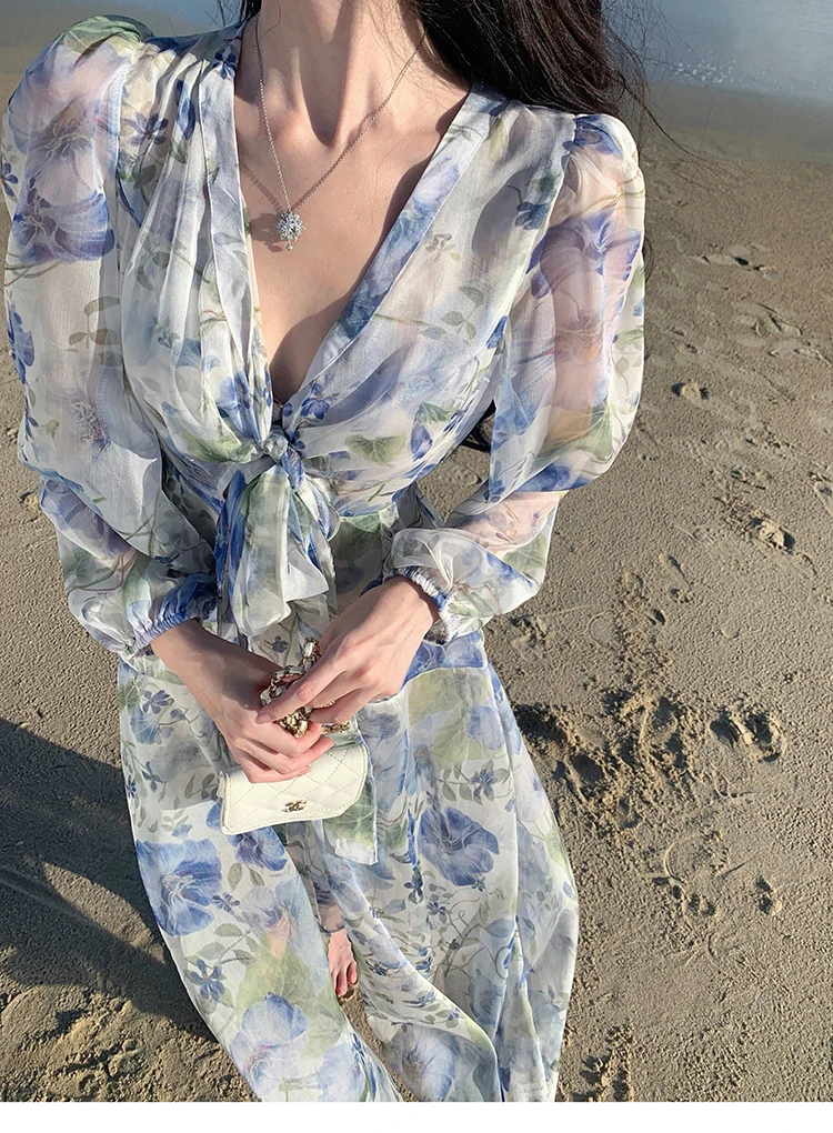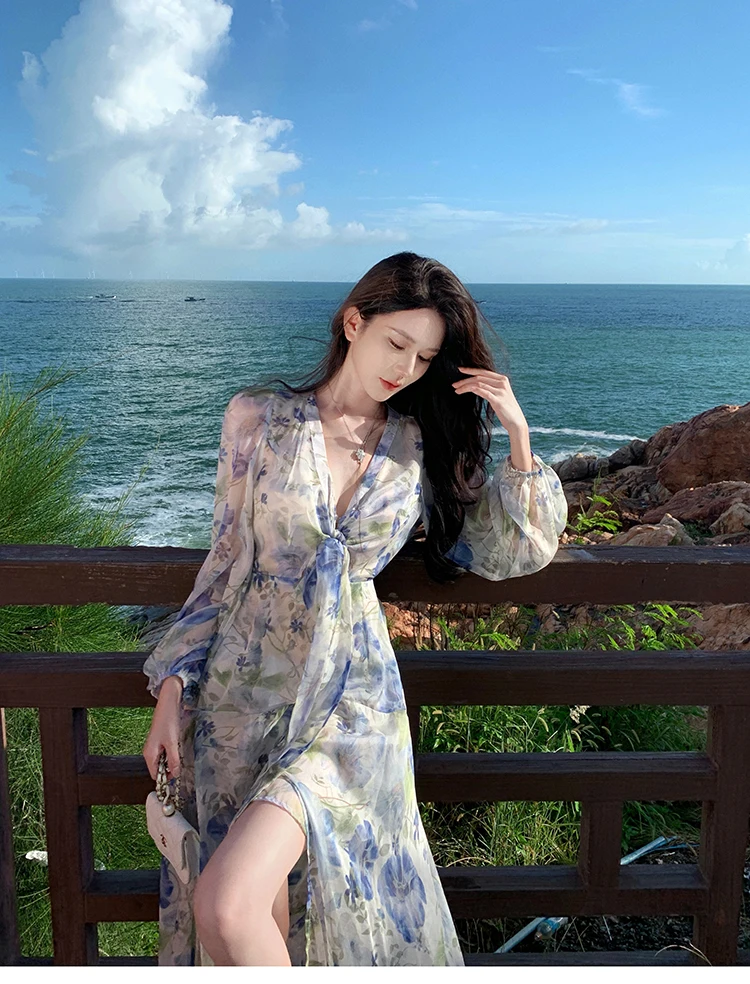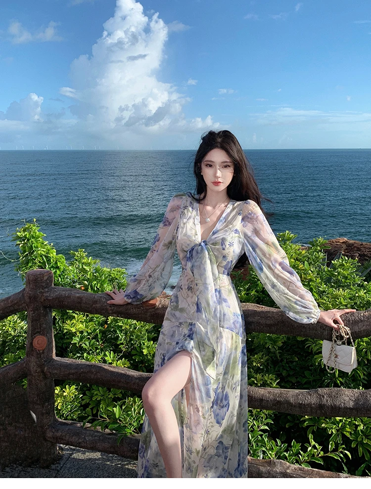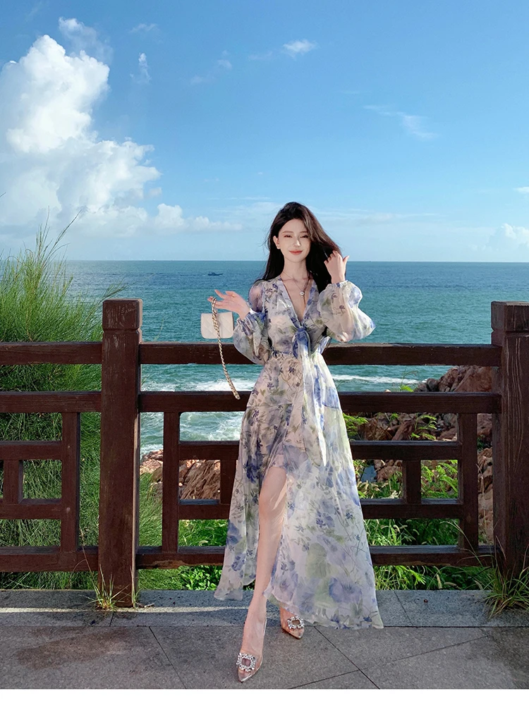 LBSFY -French Chiffon Print Dresses For Woman Summer V-Neck Slim Waist Elegant Long Dress Fashion Split Holiday Basics 2025 New Vestido