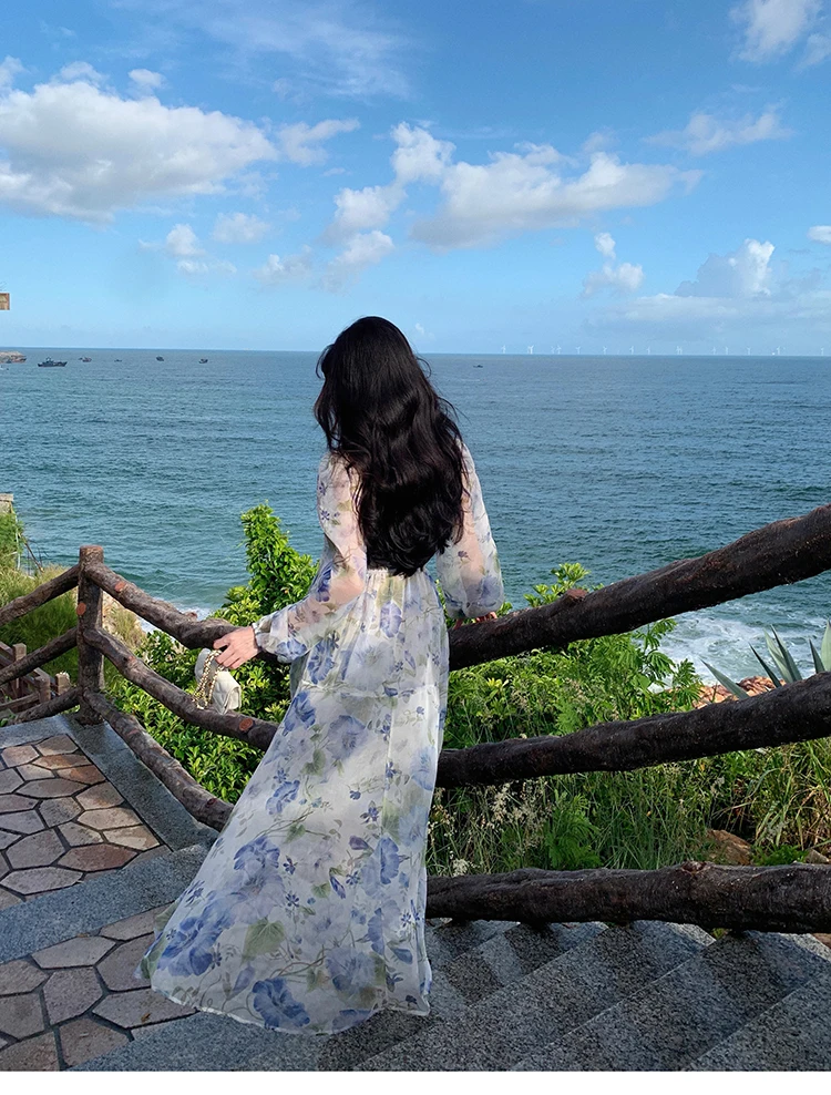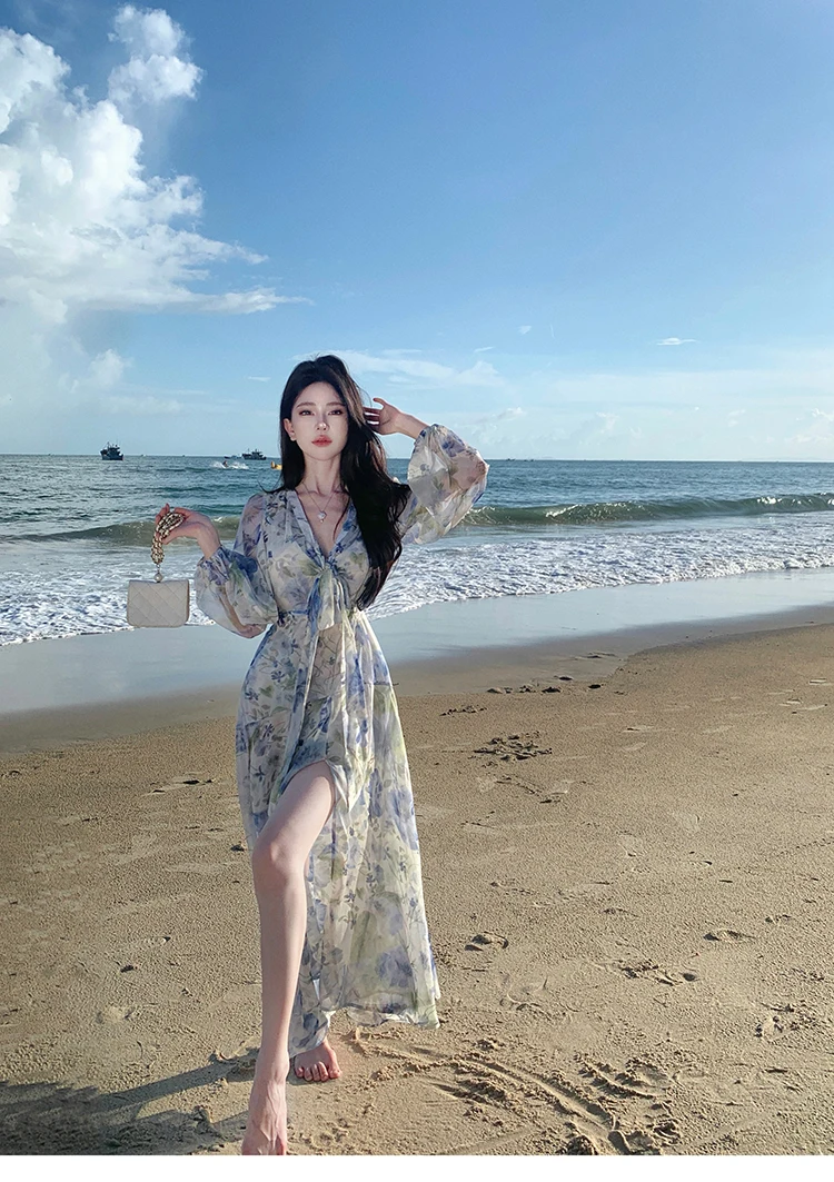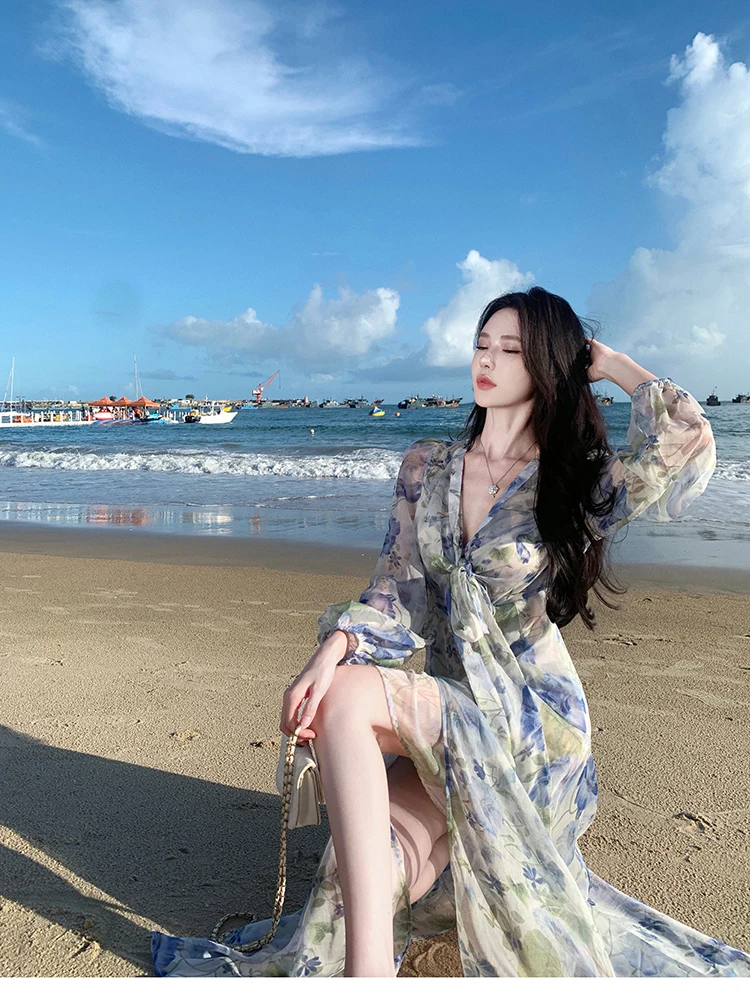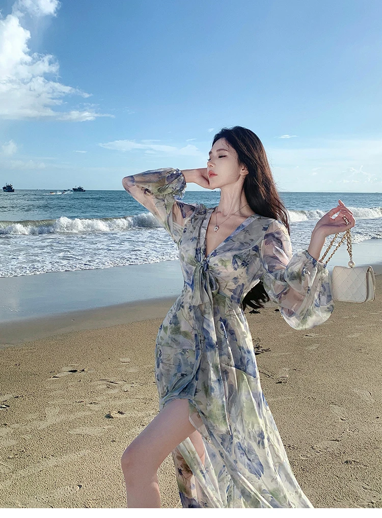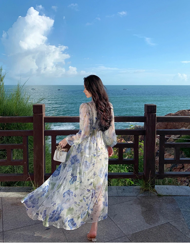 LBSFY -French Chiffon Print Dresses For Woman Summer V-Neck Slim Waist Elegant Long Dress Fashion Split Holiday Basics 2025 New Vestido