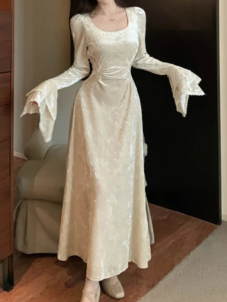 LBSFY -French Flare Sleeve Velvet Evening Dresses for Women Elegant Slim Waist Party Prom A-Line Vestidos Fashion Female Long Robe New