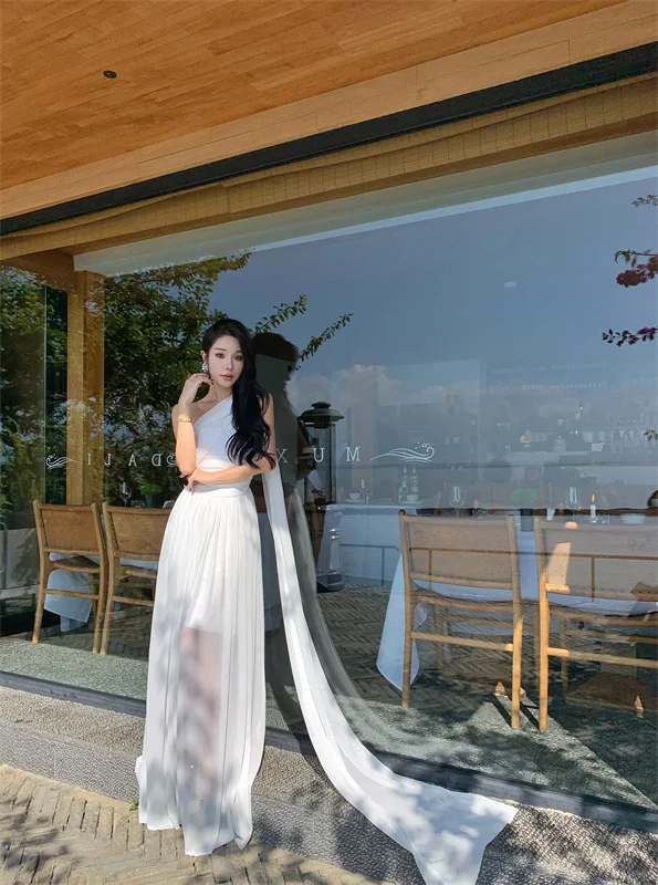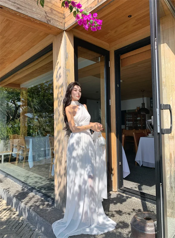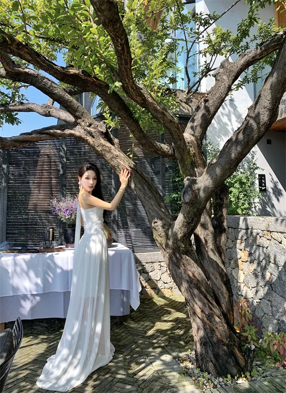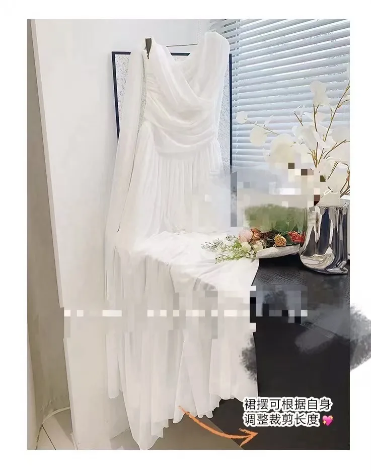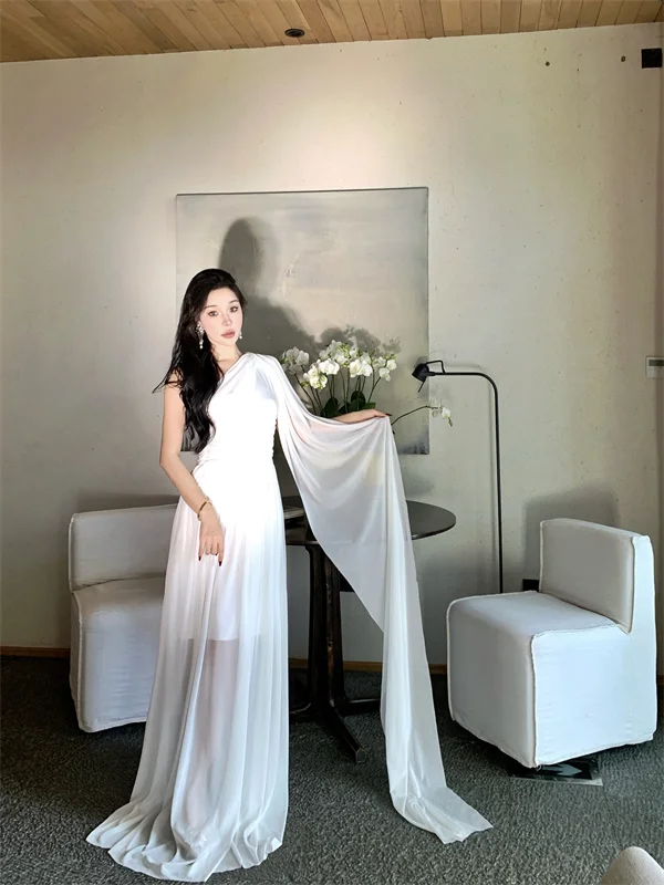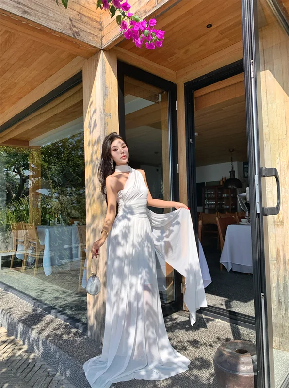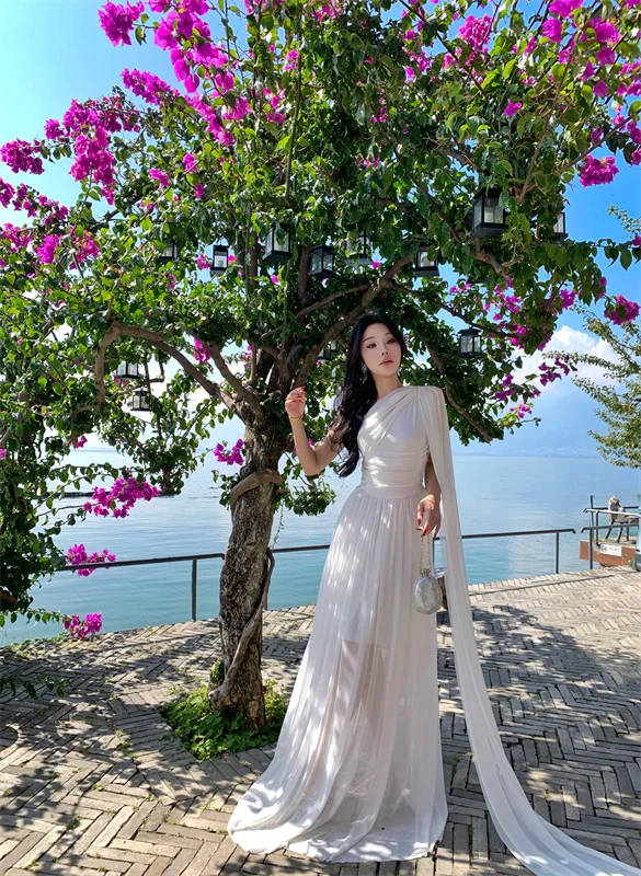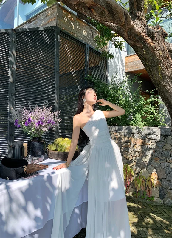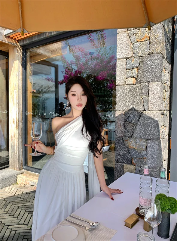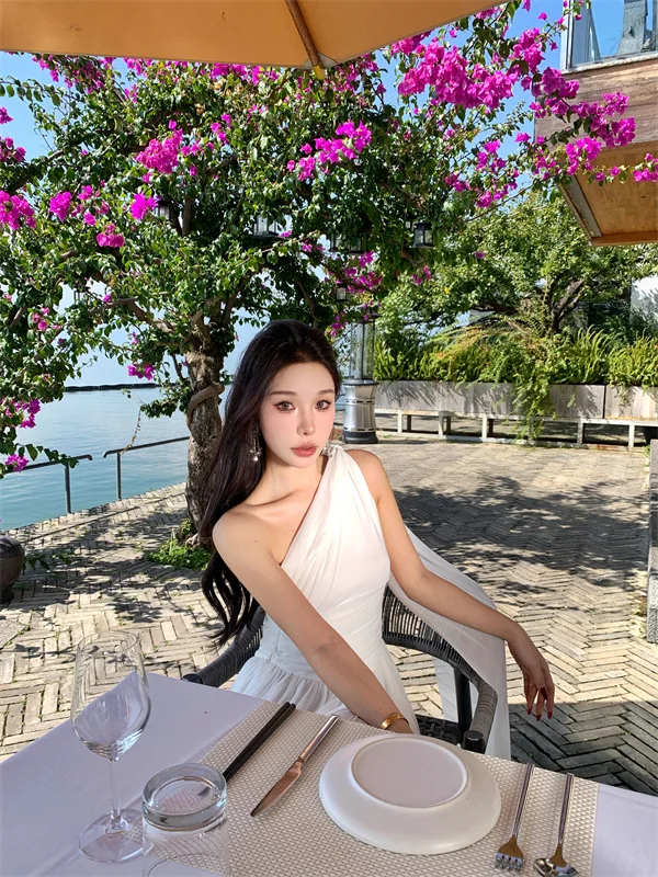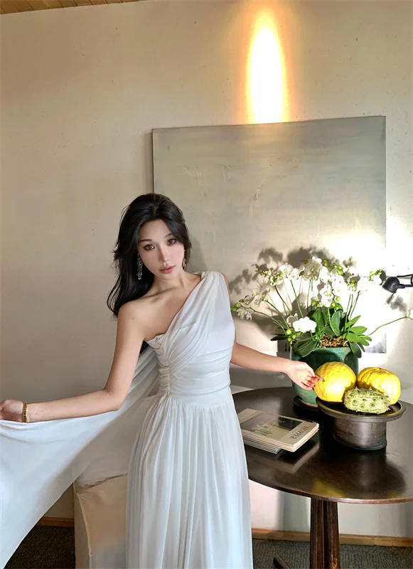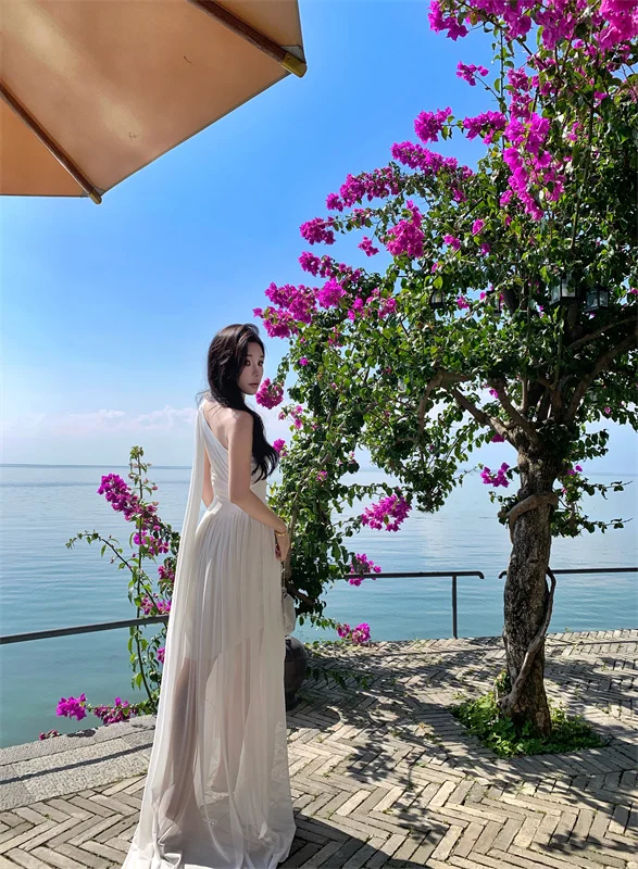 LBSFY -French Retro Goddess Elegant Dresses For Woman White Single-Shoulder Flowy Strap Long Dress Fashion Vacation Holiday New 2025