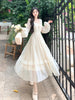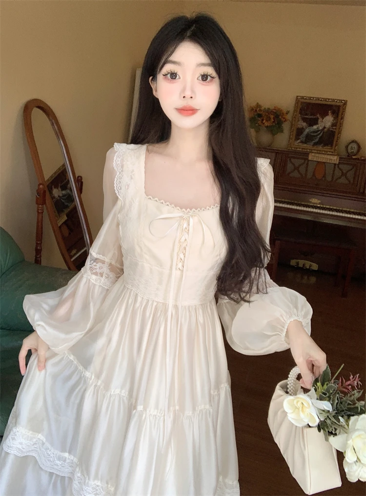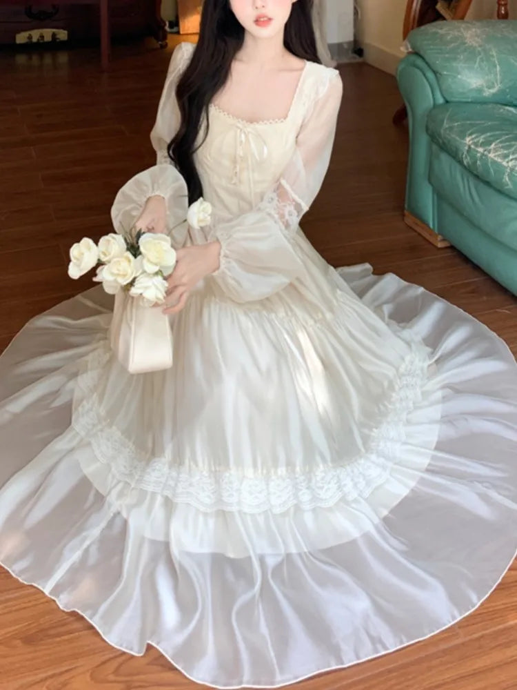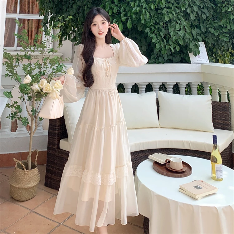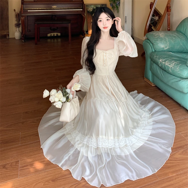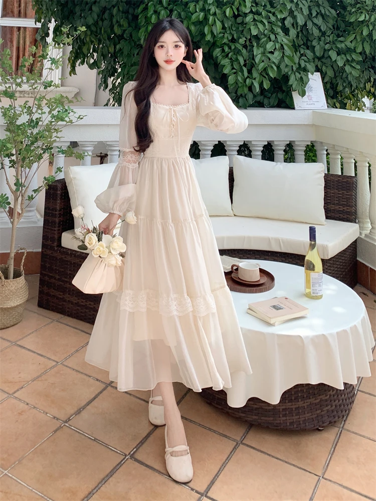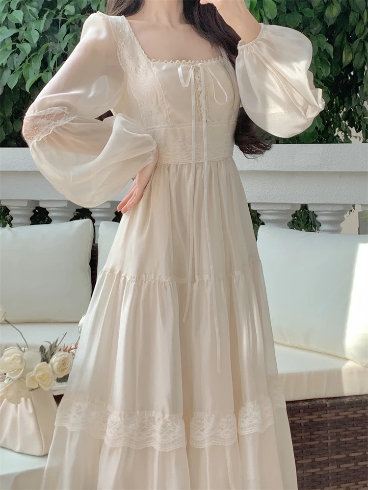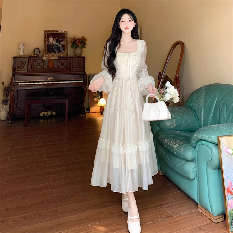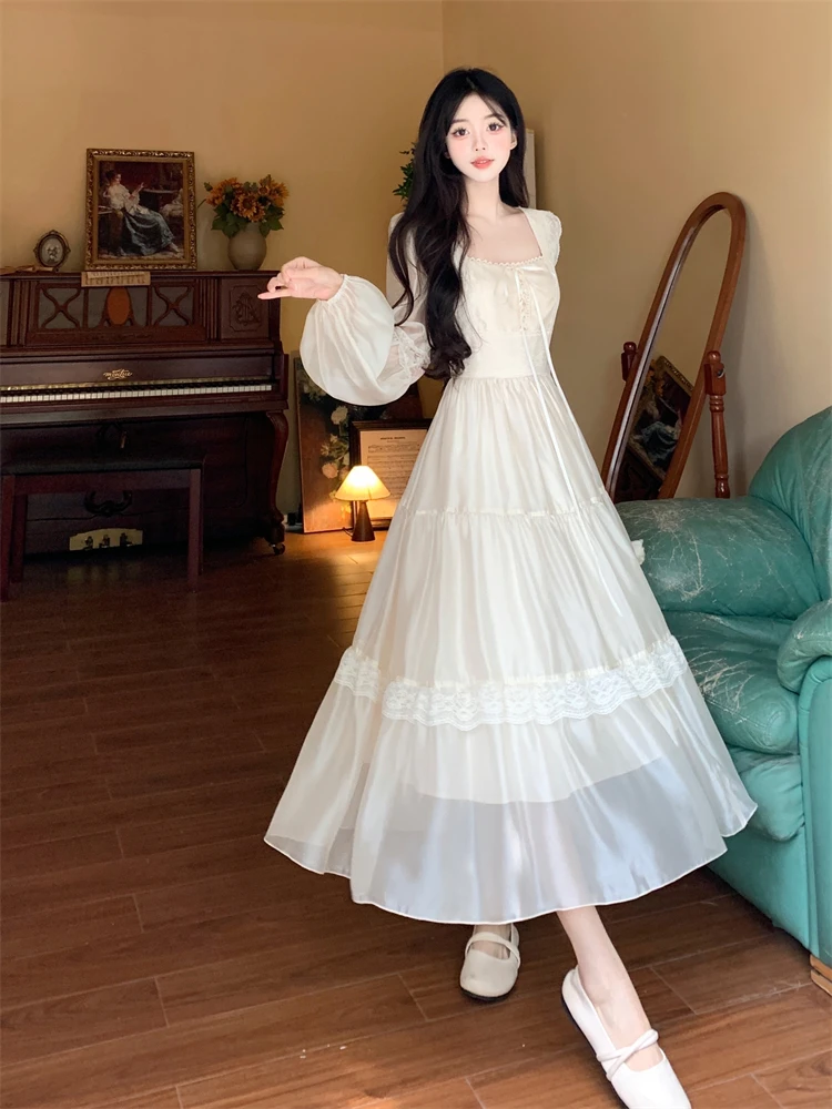 LBSFY -French Ruffle Lace Midi Dress Elegant Fairy Square Neck Long Sleeve A-line Vestidos Casual Slim Evening Party Solid Mujers Robe