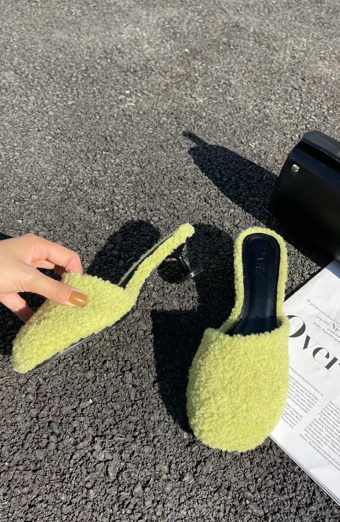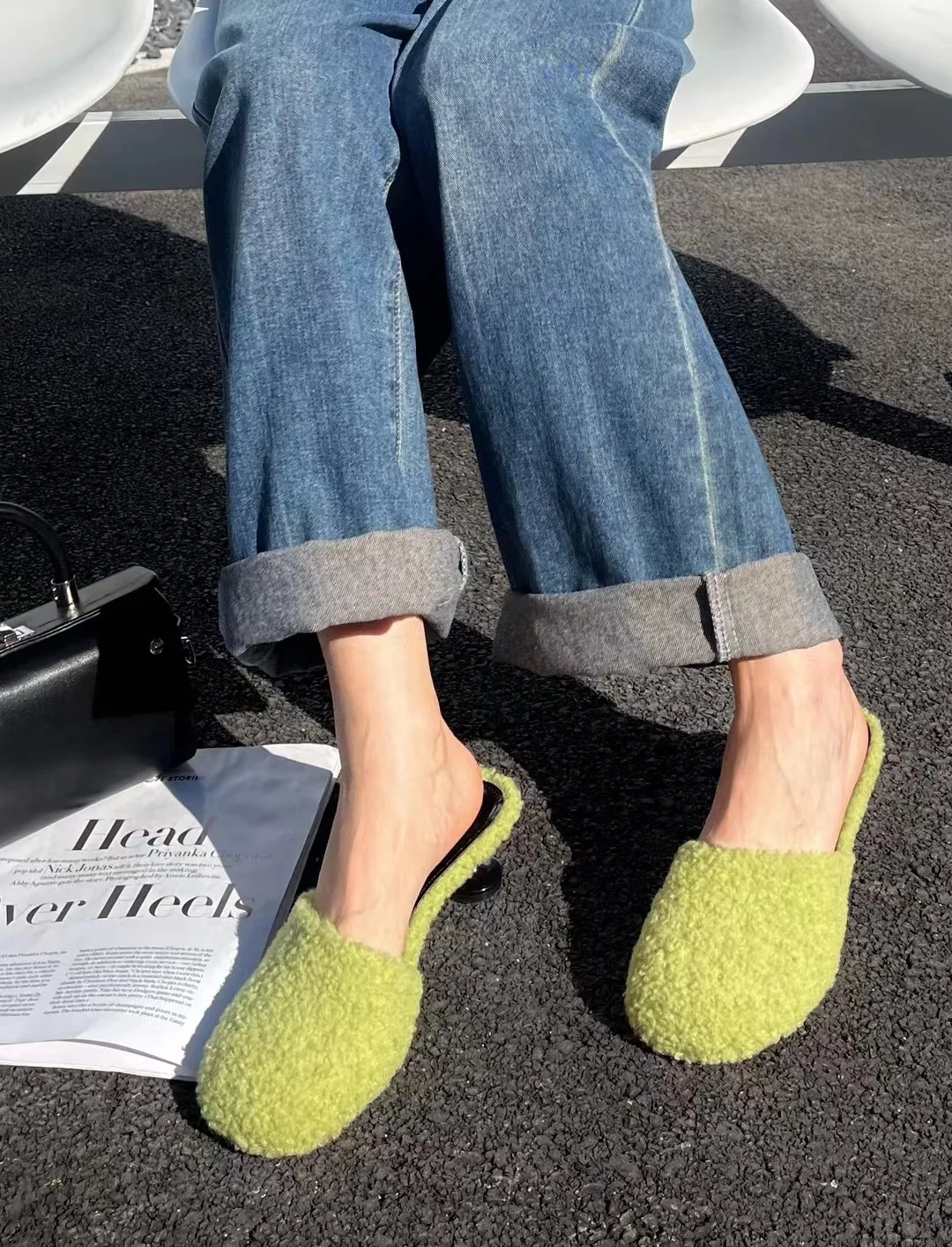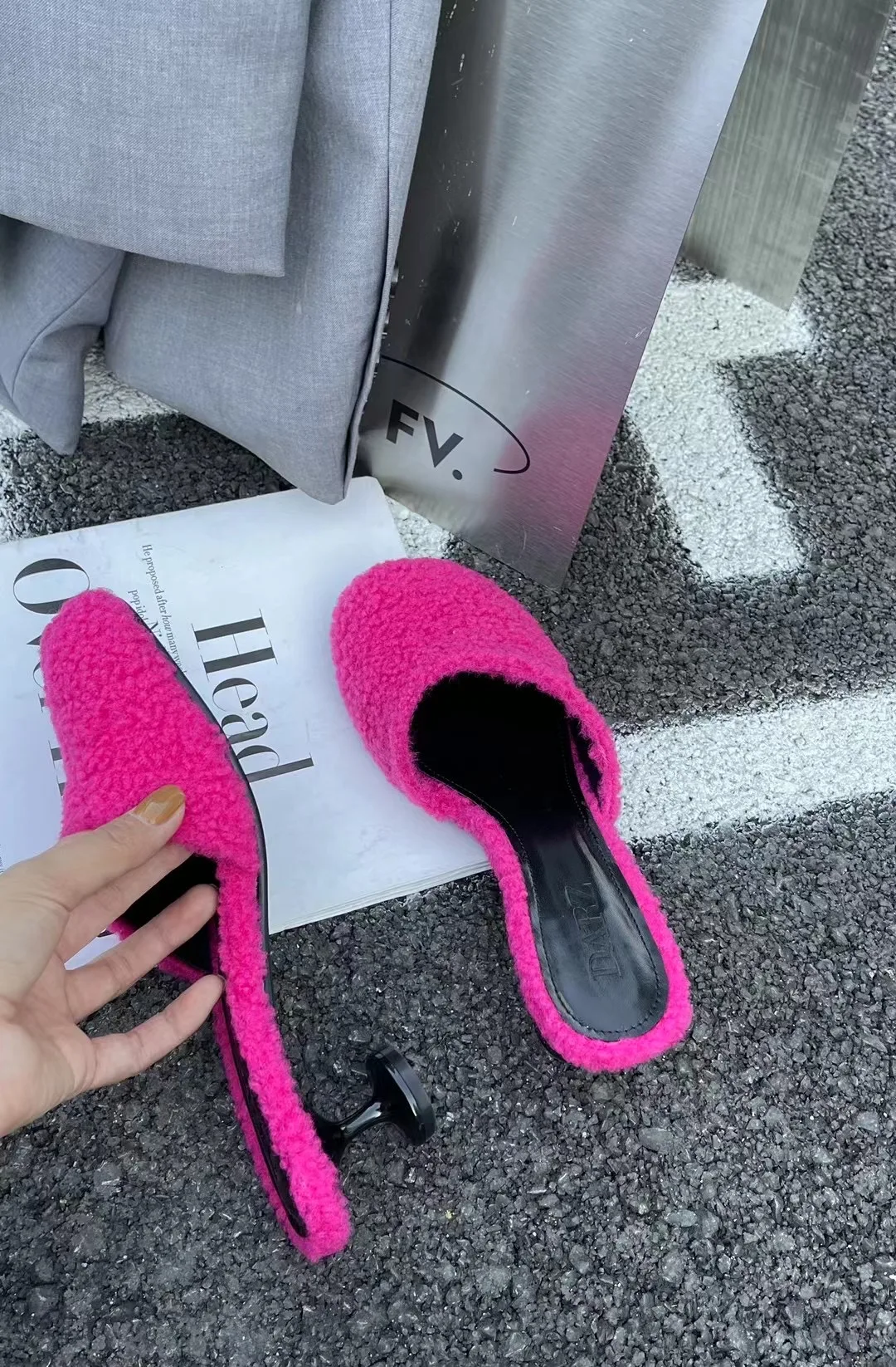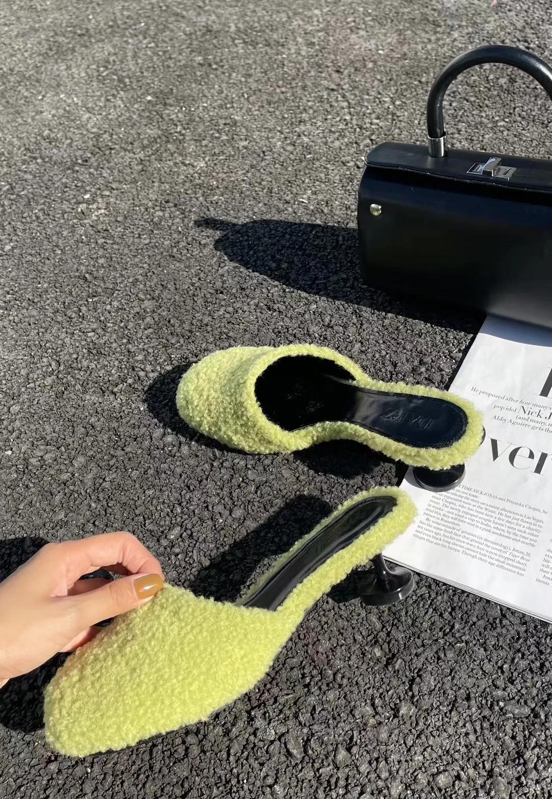 LBSFY - Fur Women Slippers Round Toe Slides Mules Shoes 2024 New Arrivals Thin Mid Heels Black Green Rose Fashion Dress Shoes Woman 39