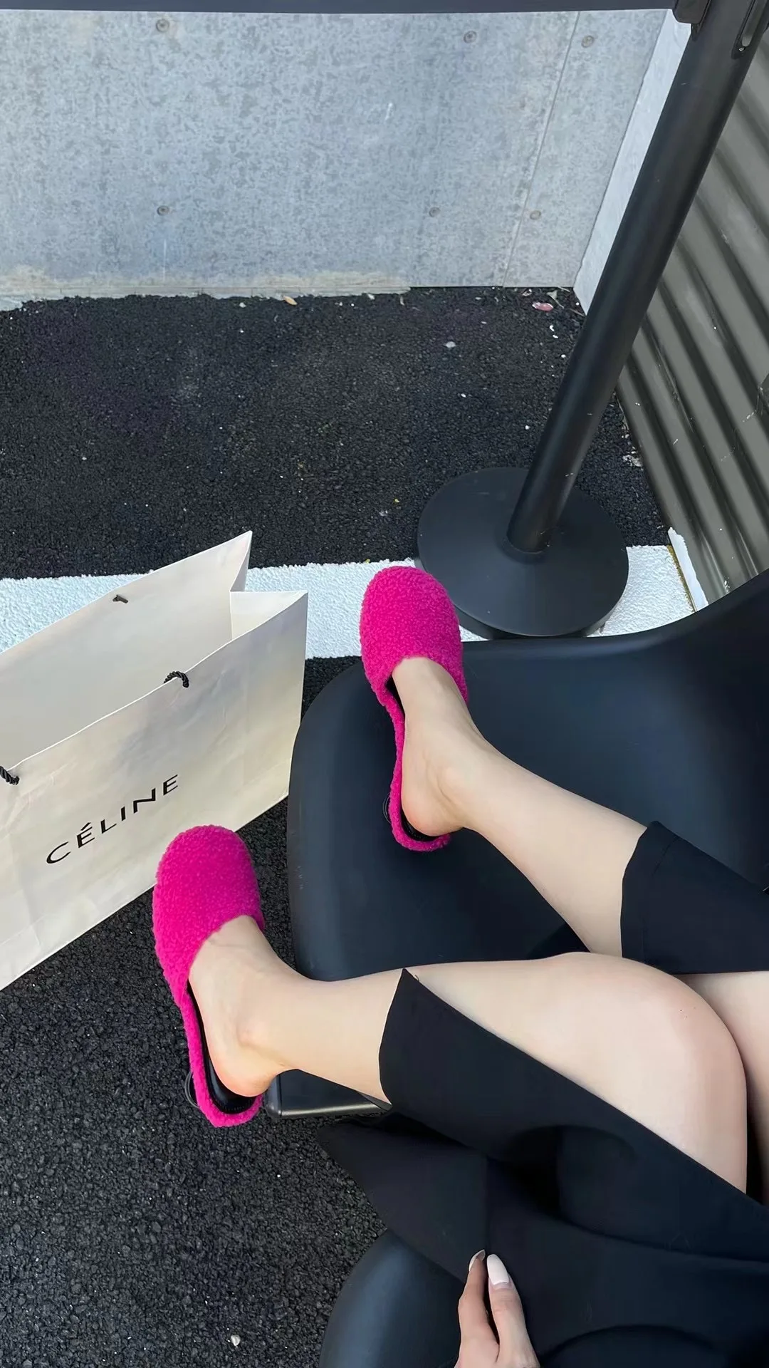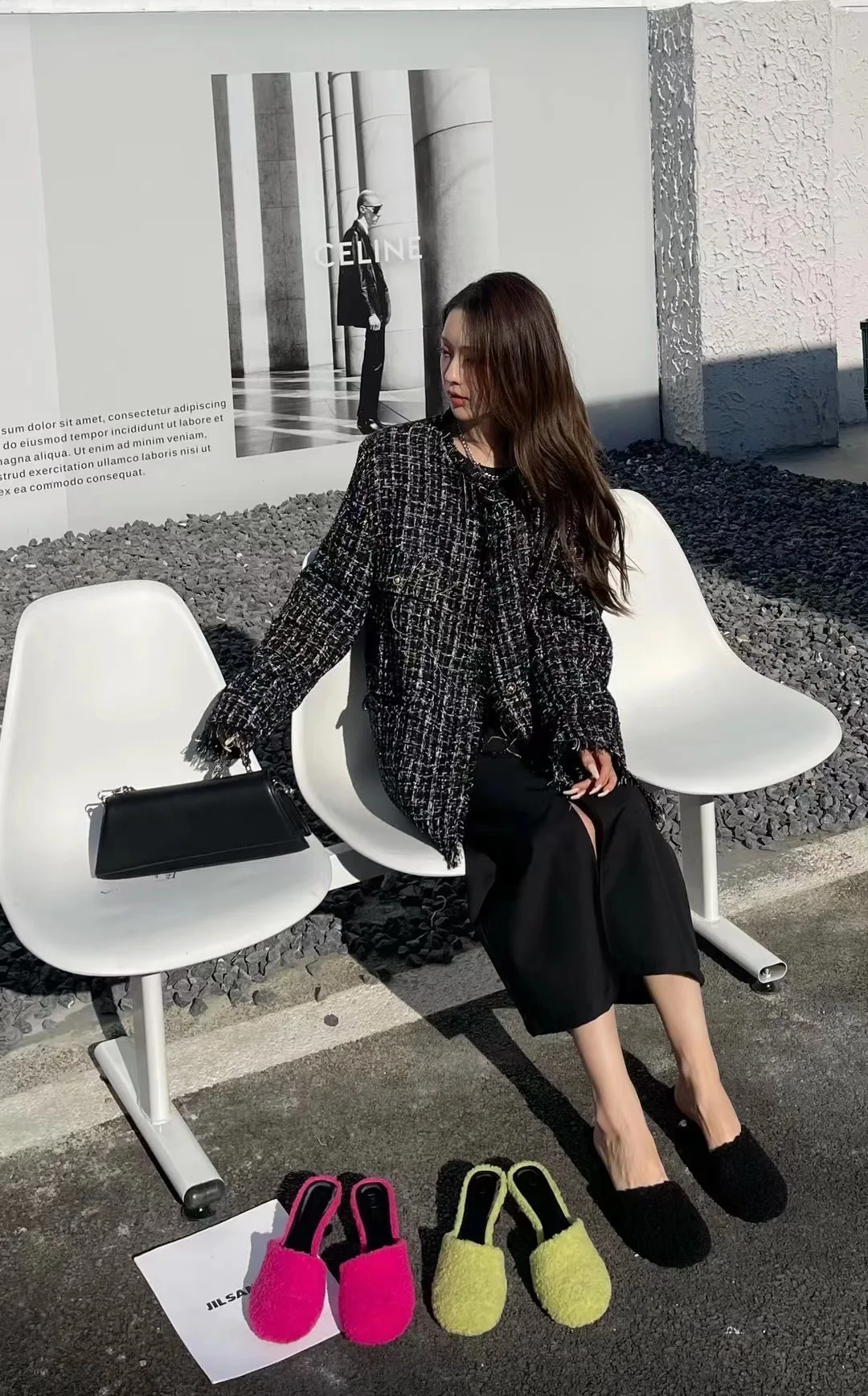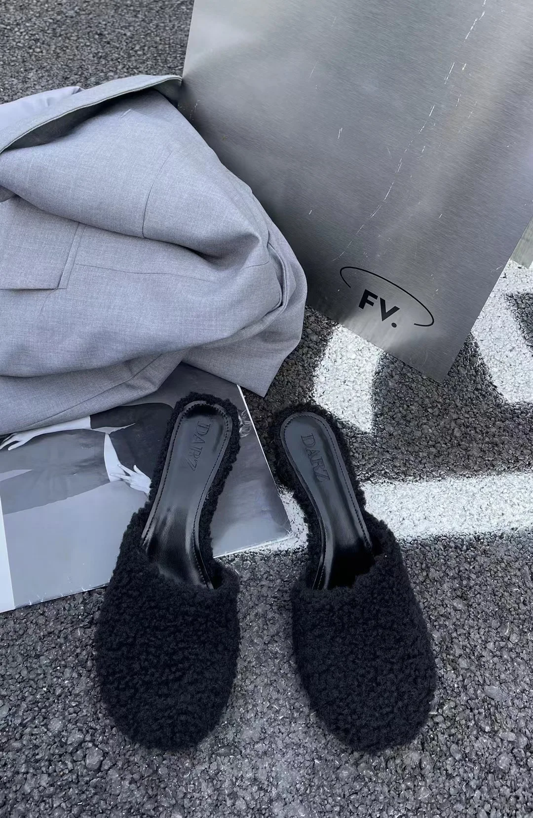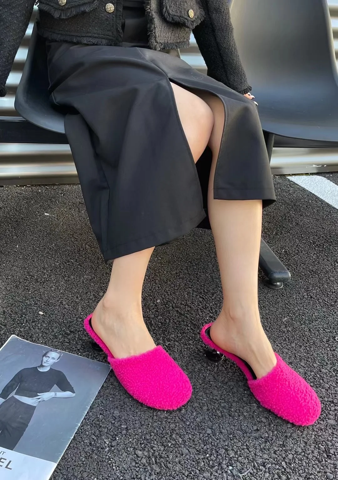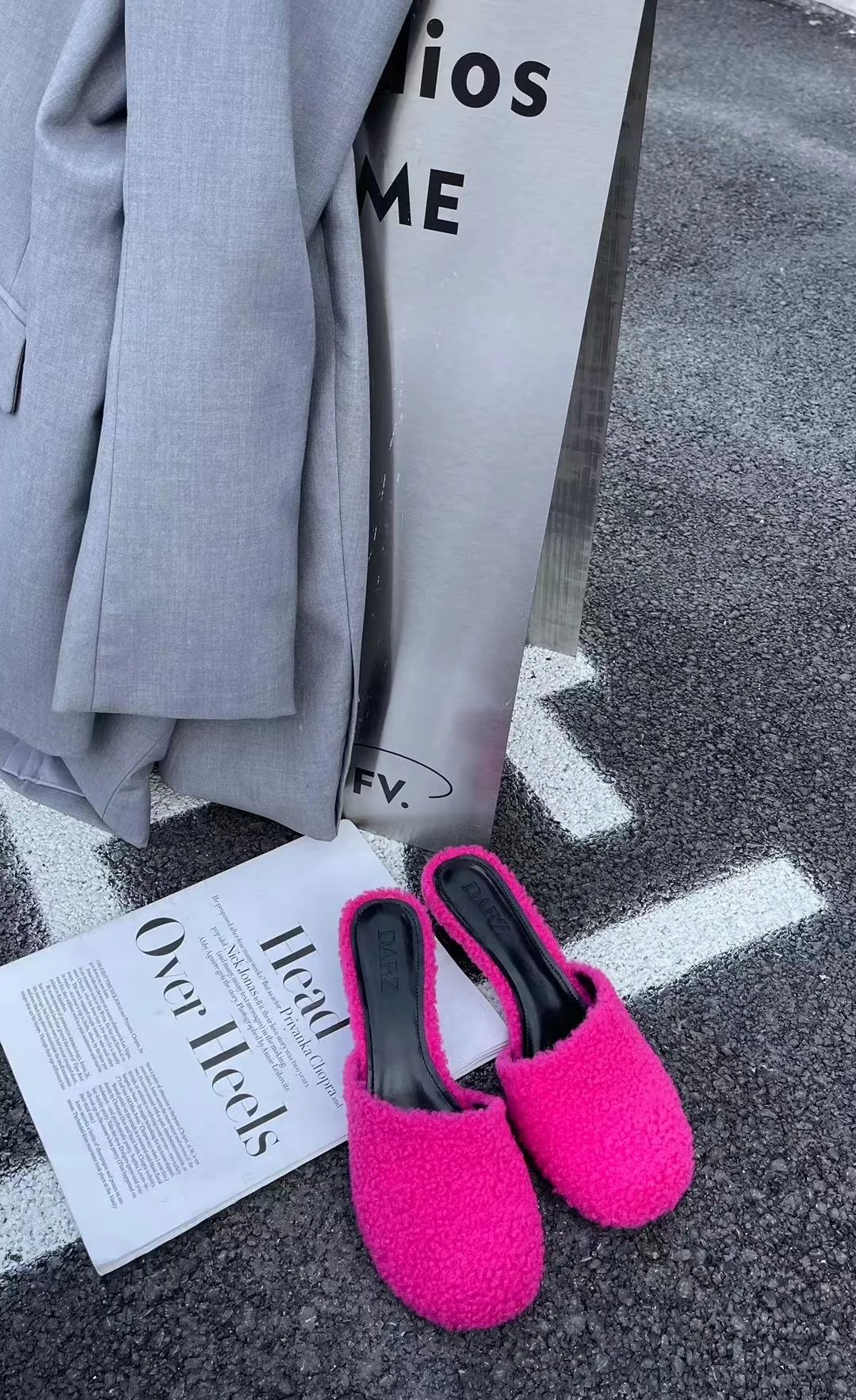 LBSFY - Fur Women Slippers Round Toe Slides Mules Shoes 2024 New Arrivals Thin Mid Heels Black Green Rose Fashion Dress Shoes Woman 39