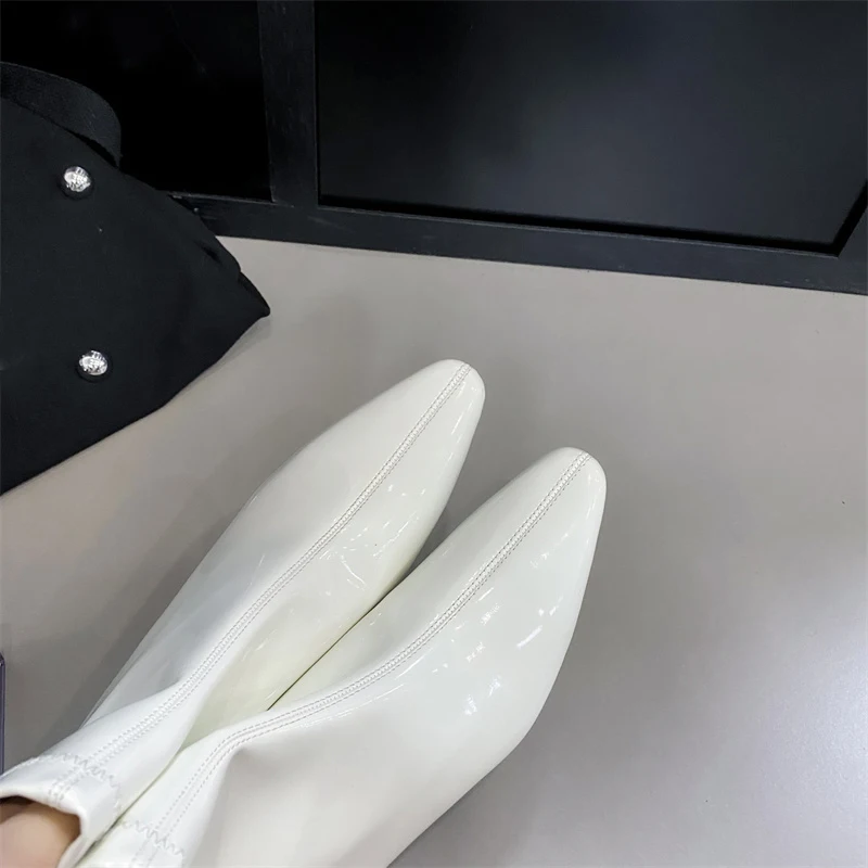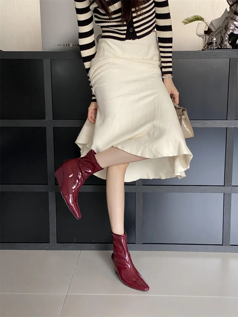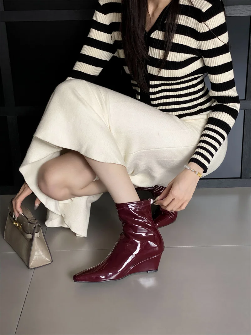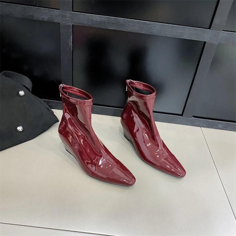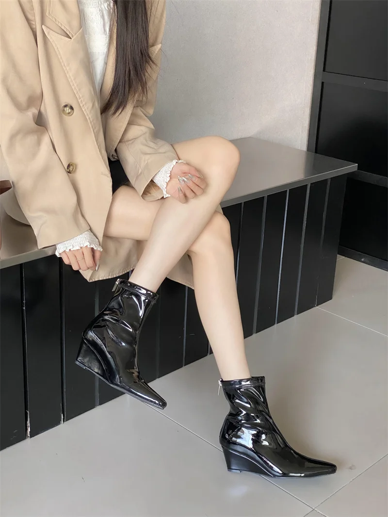 LBSFY - High Quality Soft Cozy Patent Leather Ankle Boots Women Sexy Pointed Toe Wedges Heels Party Prom Shoe Booties Female Pumps