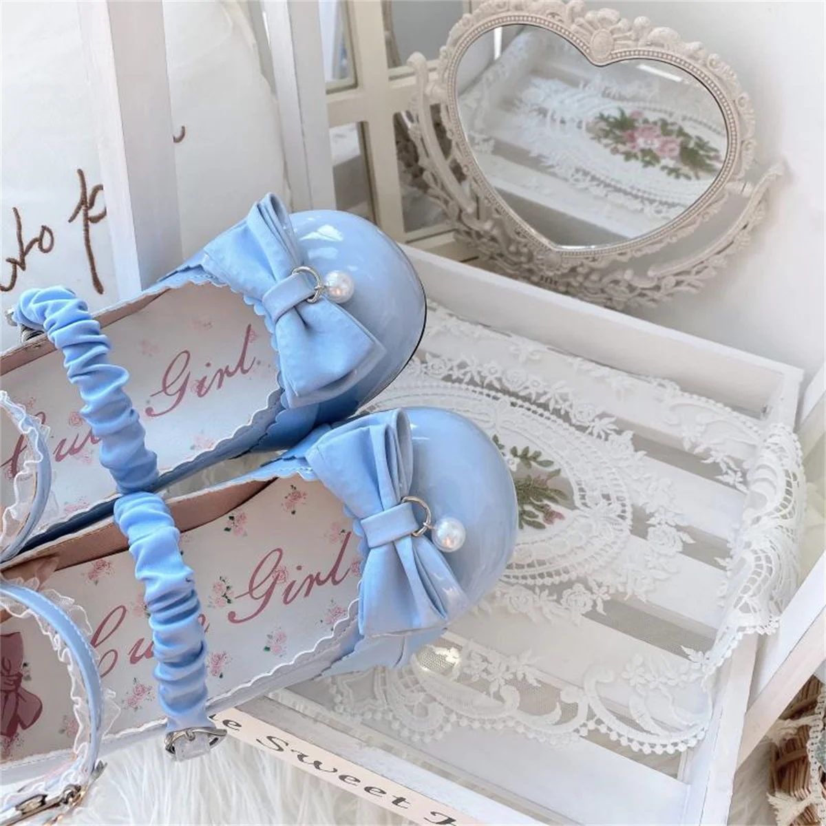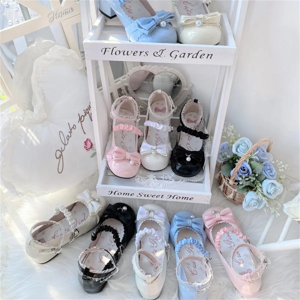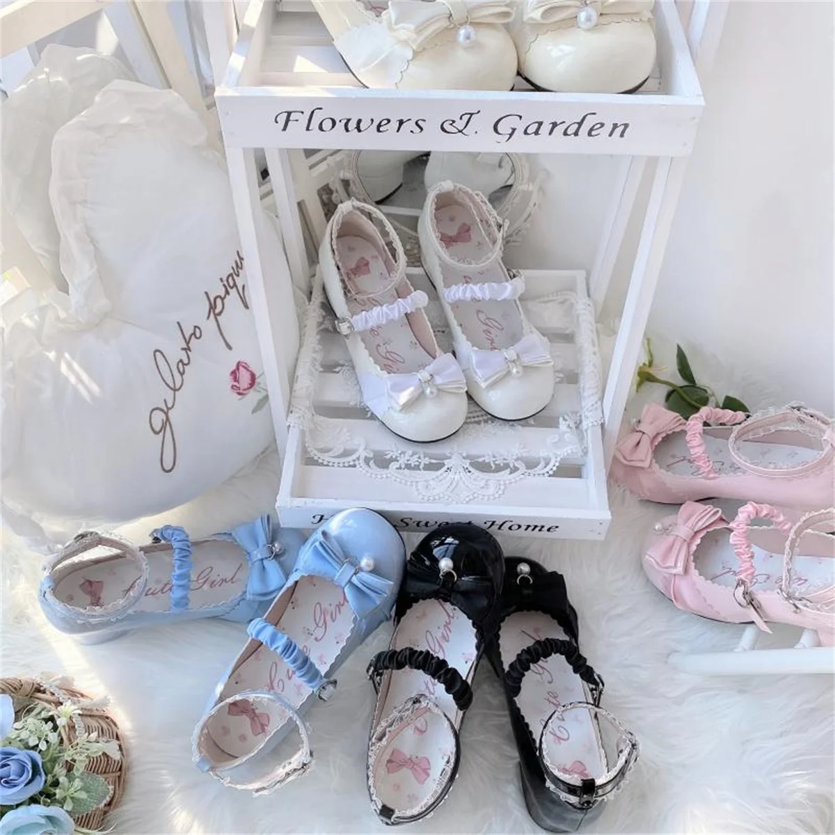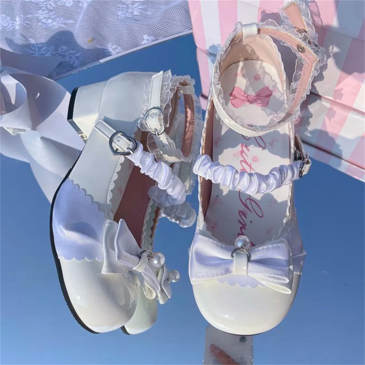 LBSFY - Japanese Style Lolita Cosplay Shoes Sweet Victorian Girl Elegant Tea Party Princess Round Head Bow Pearl Lace Middle Heel Shoes