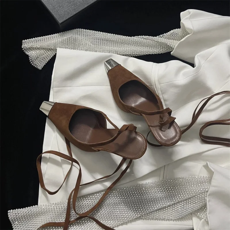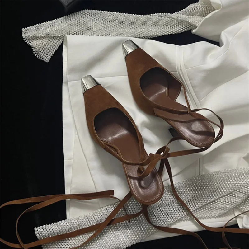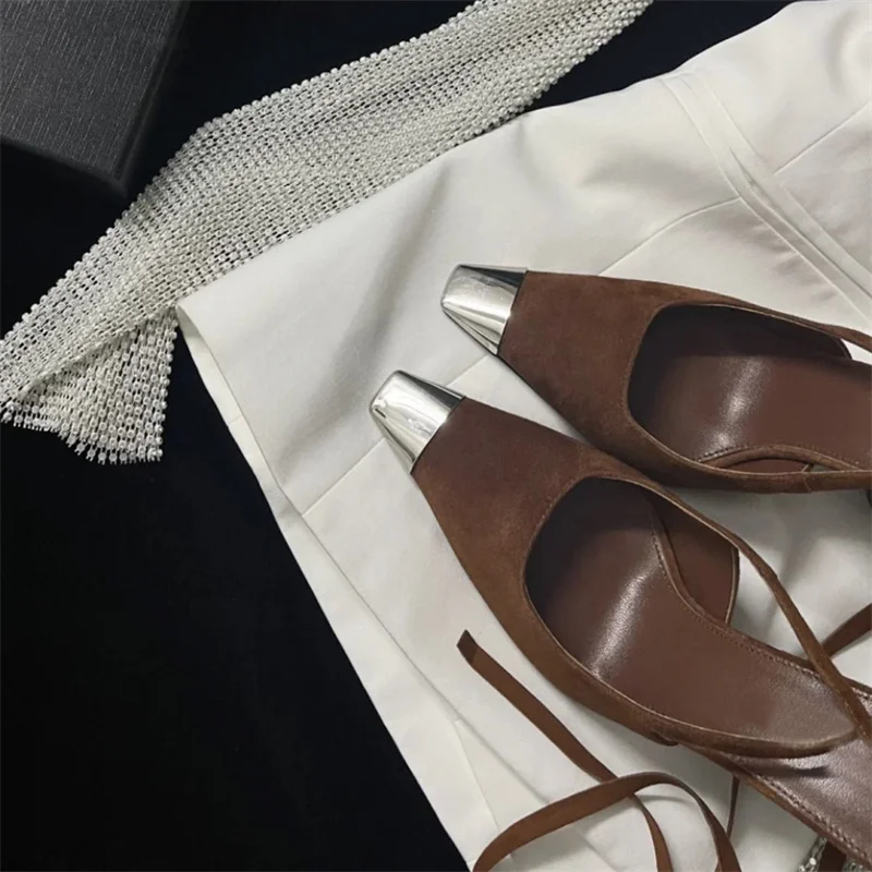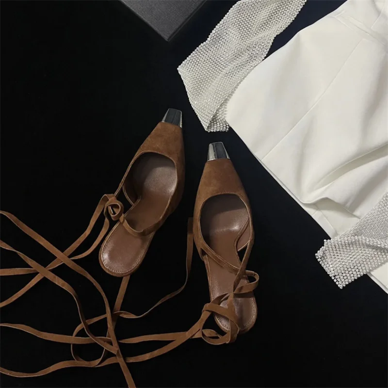 LBSFY - Kid Suede Lace Up Slingbacks Thin Heel Metal Square Toe High Heeled Single Shoes Shallow Mixed Colors Sandals Ladies Party Pumps