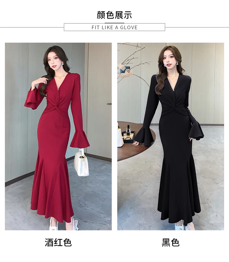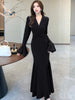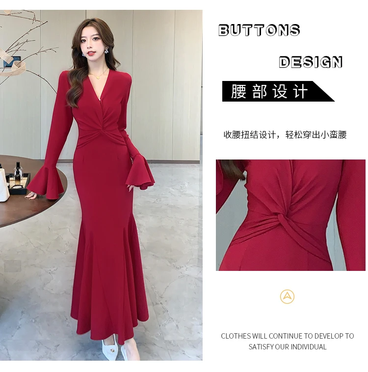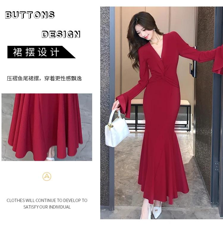 LBSFY -Korean Sexy Mermaid Dress for Women V-Neck Flare Long Sleeves Ruffles Party Dresses Autumn Female Slim Waist Vestidos Long Robe