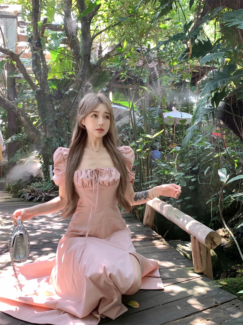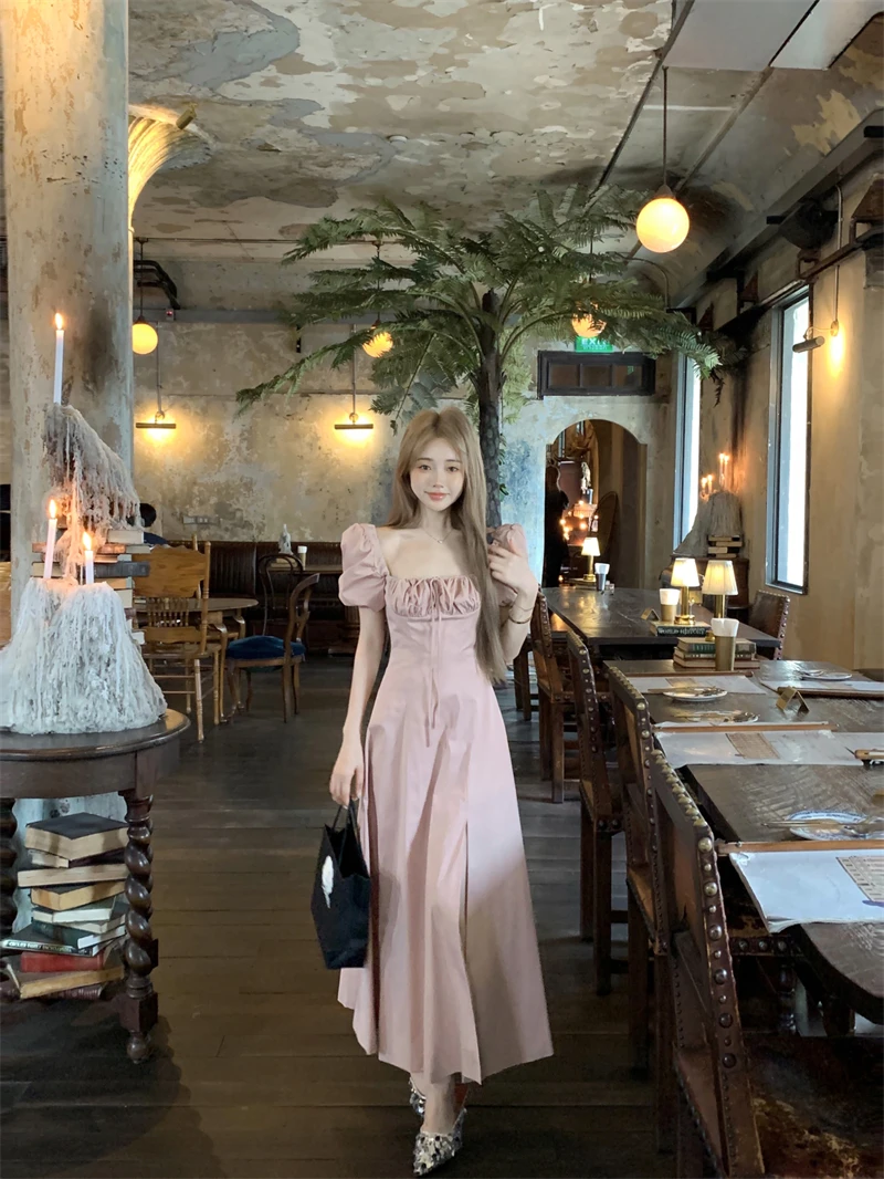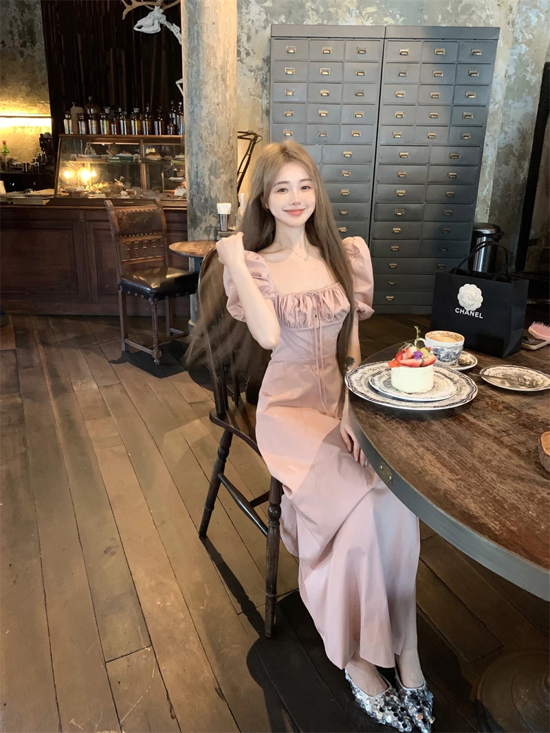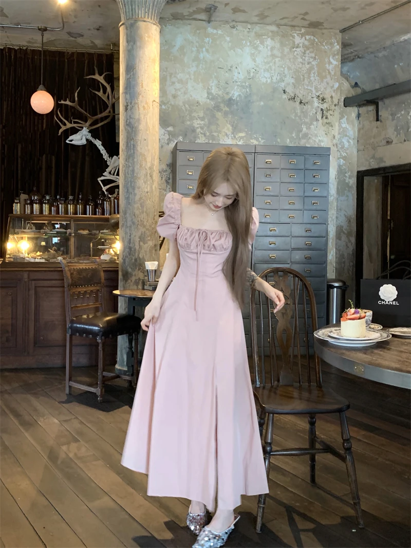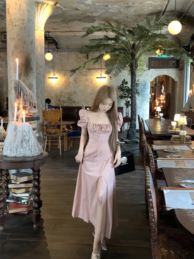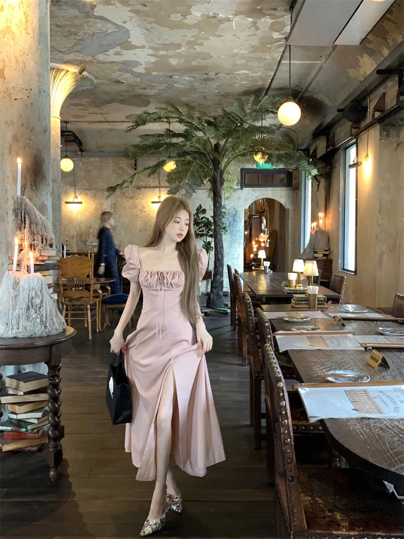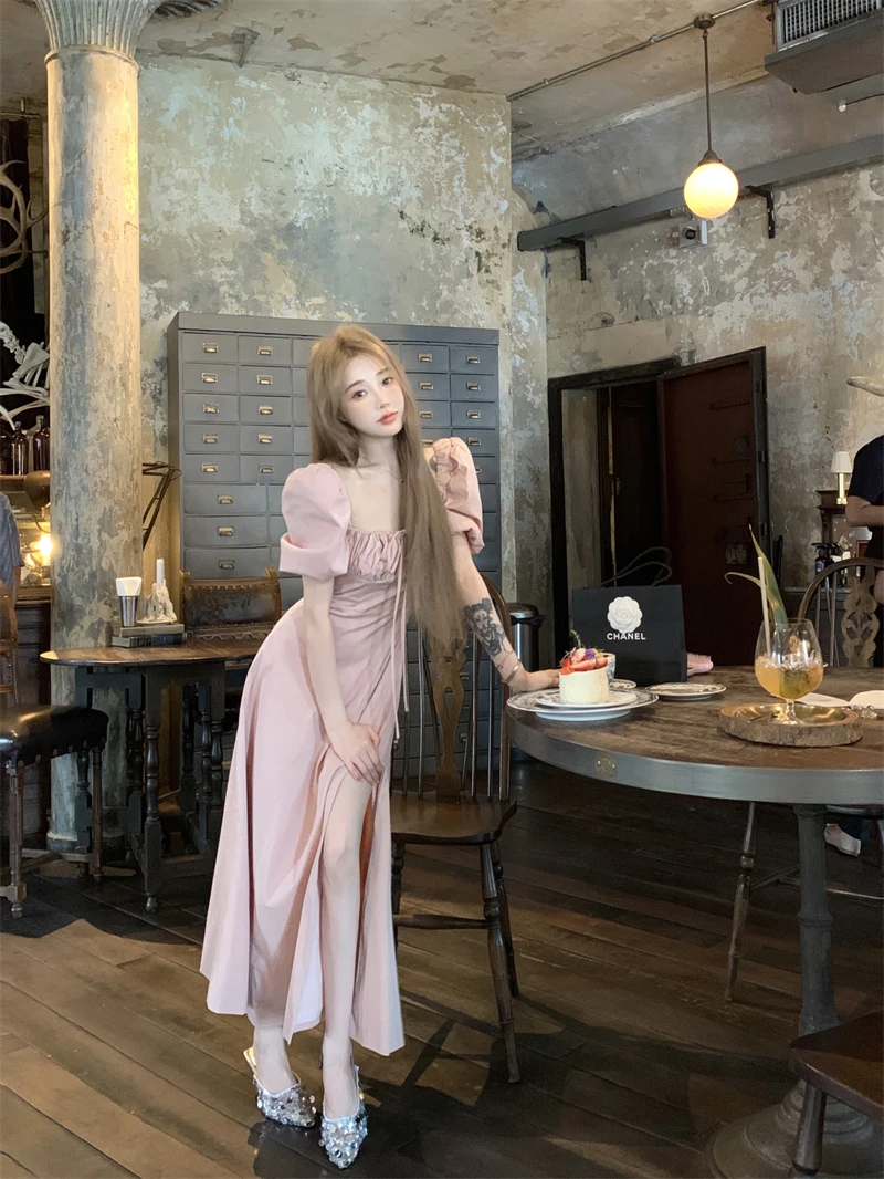 LBSFY -Korean Summer Elegant Fashion Women's Dresses Puff Sleeves Square-Collar Vintage Folds Split Lace Up Long Dress 2025 Vestidos