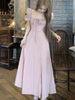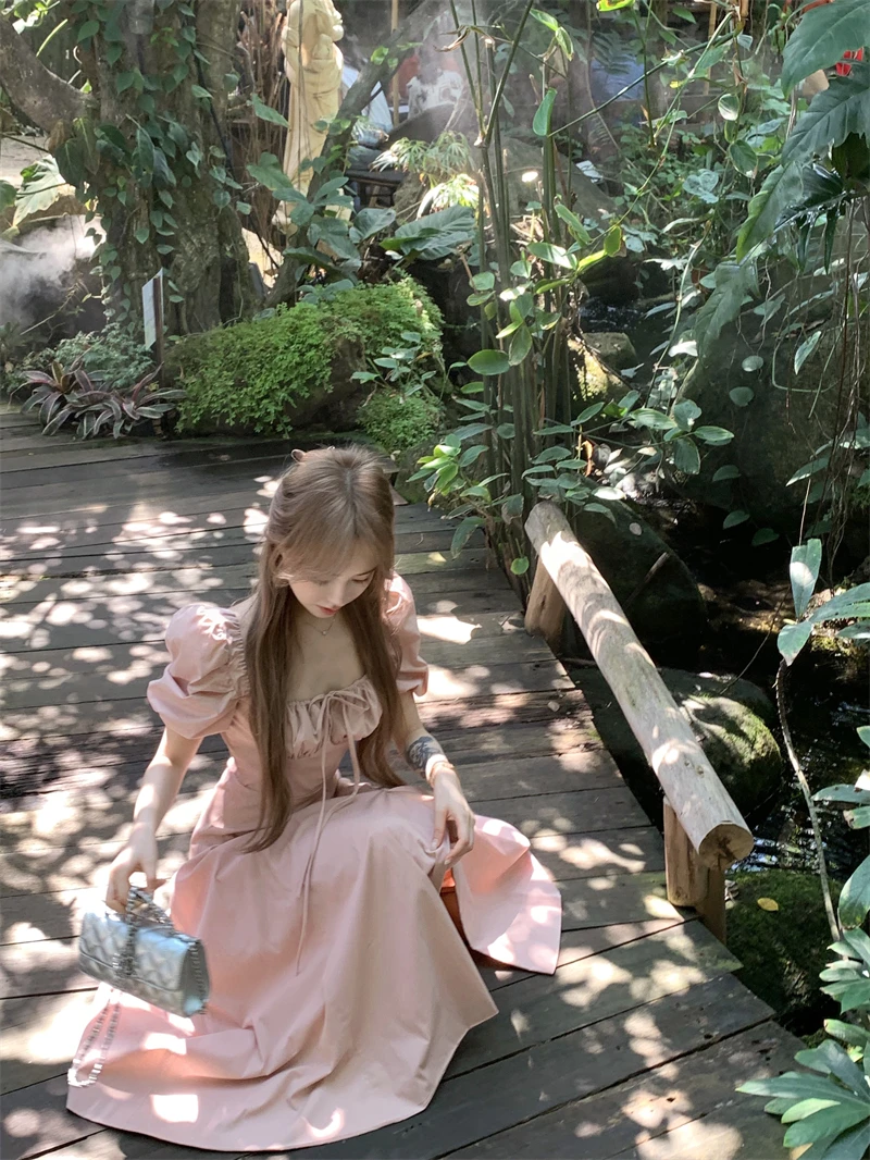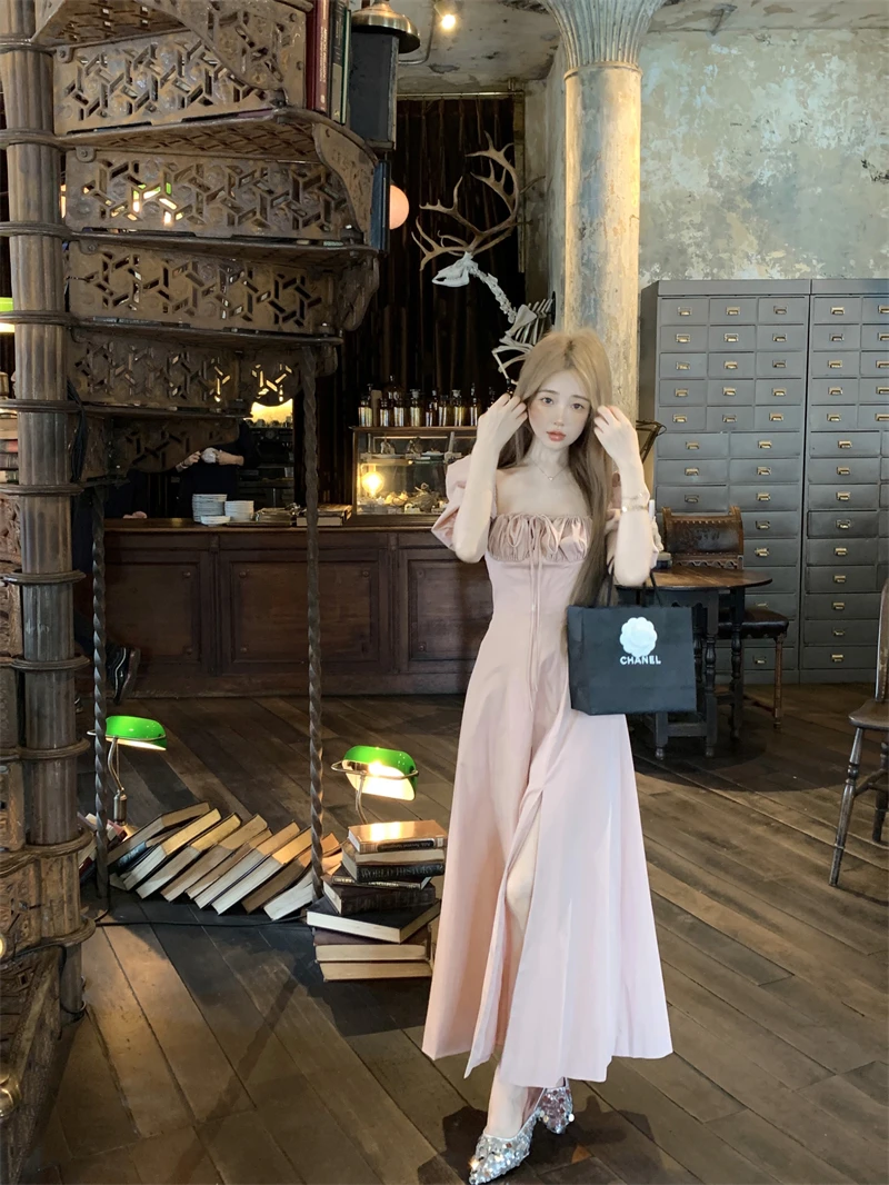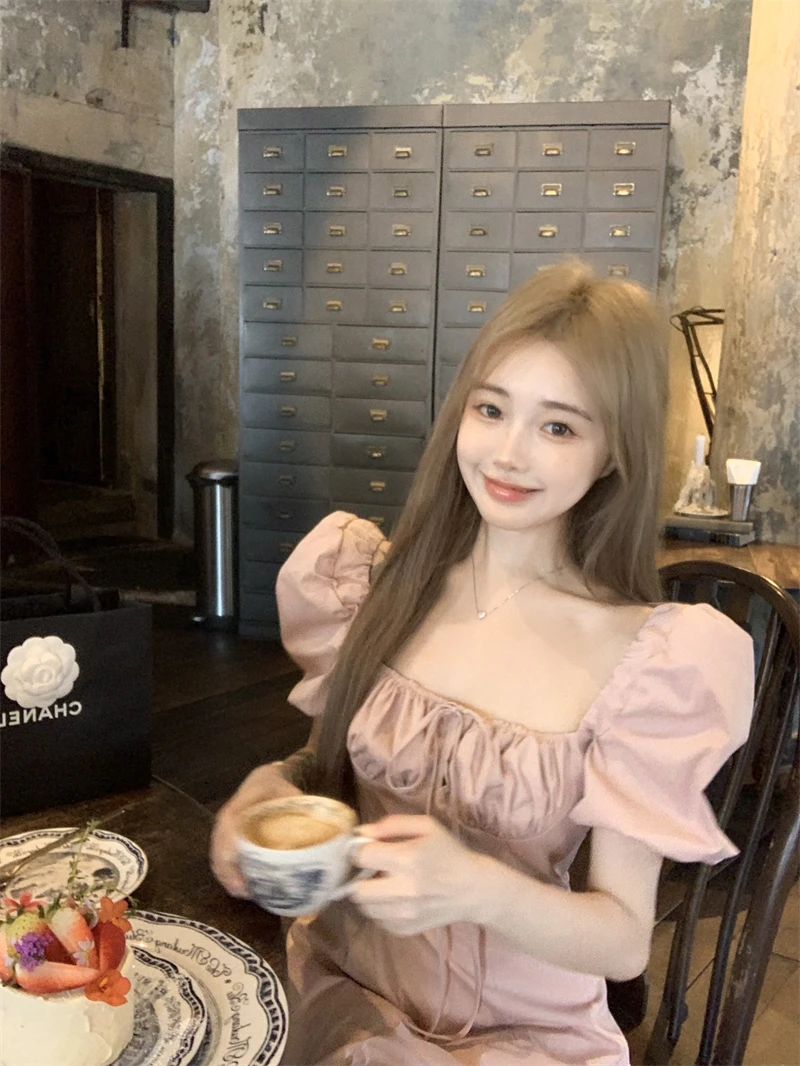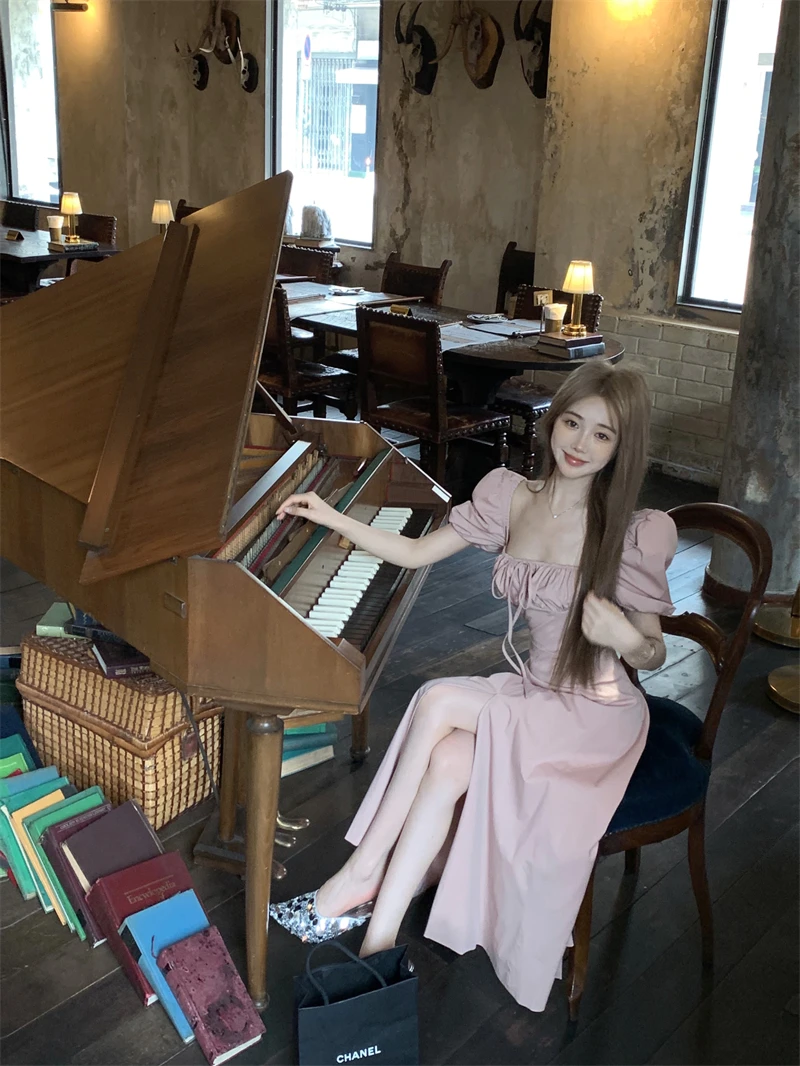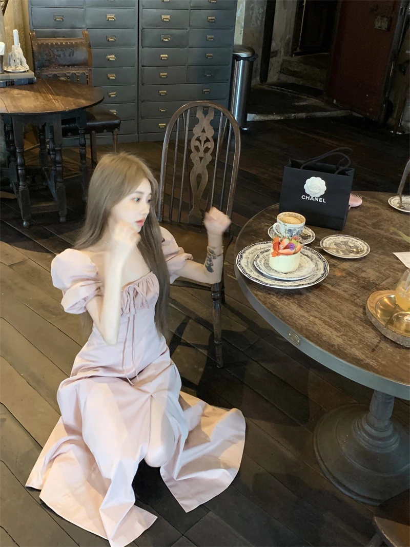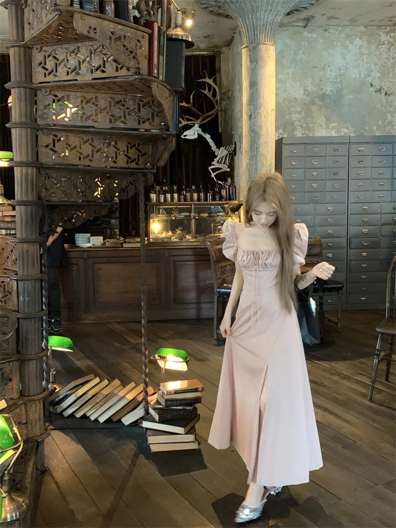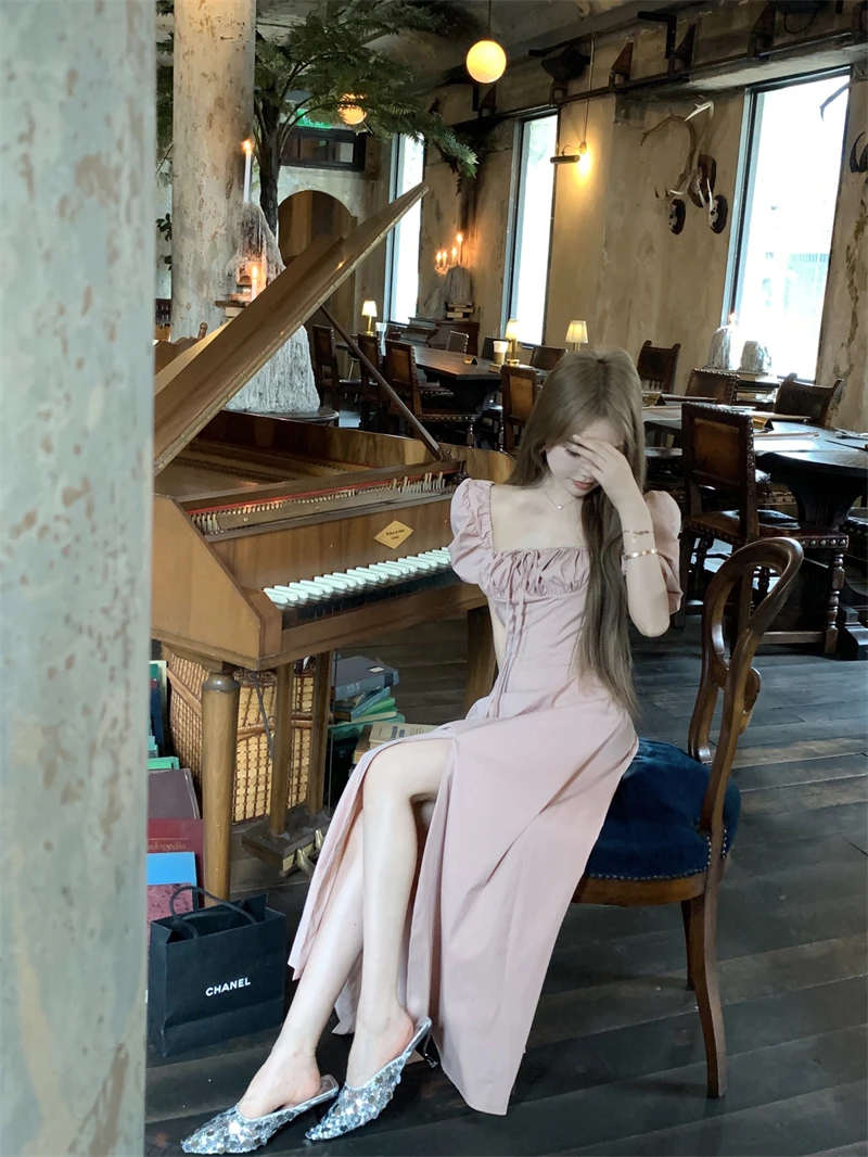LBSFY -Korean Summer Elegant Fashion Women's Dresses Puff Sleeves Square-Collar Vintage Folds Split Lace Up Long Dress 2025 Vestidos