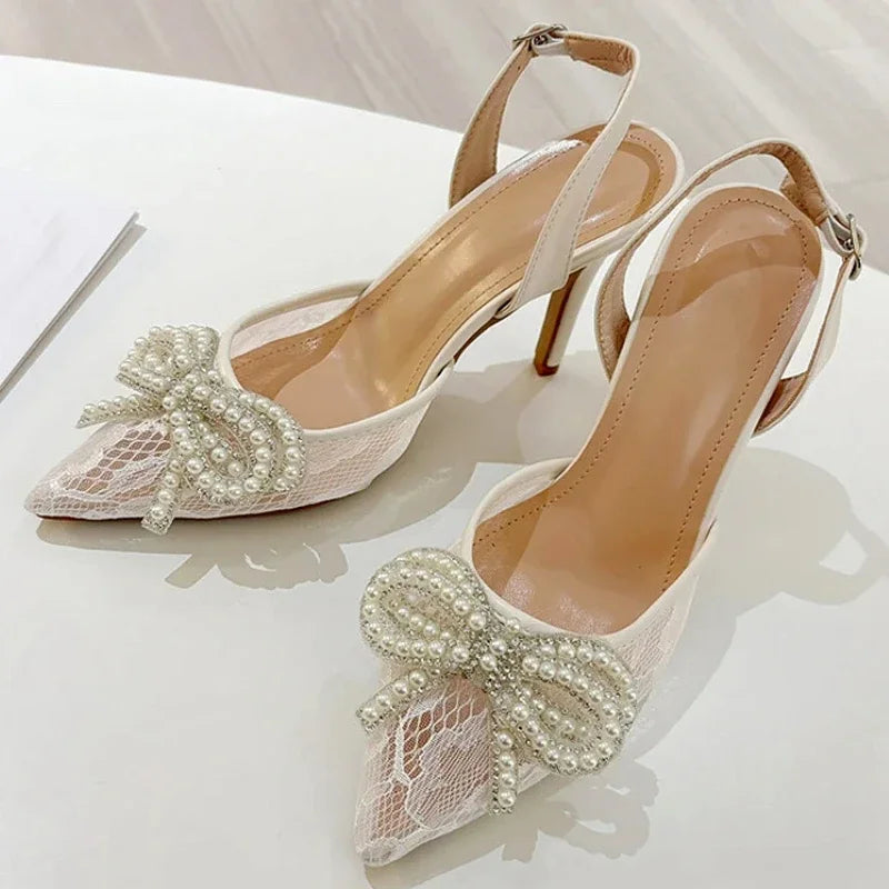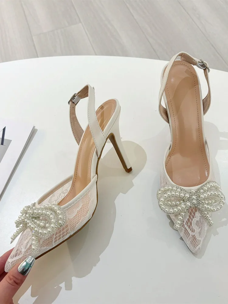 Lbsfy Lace String Bead Thin High Heels Women Pointed Toe Bowknot Party Dress Shoes Hollow Breathable Mesh Slingbacks Sandals Women