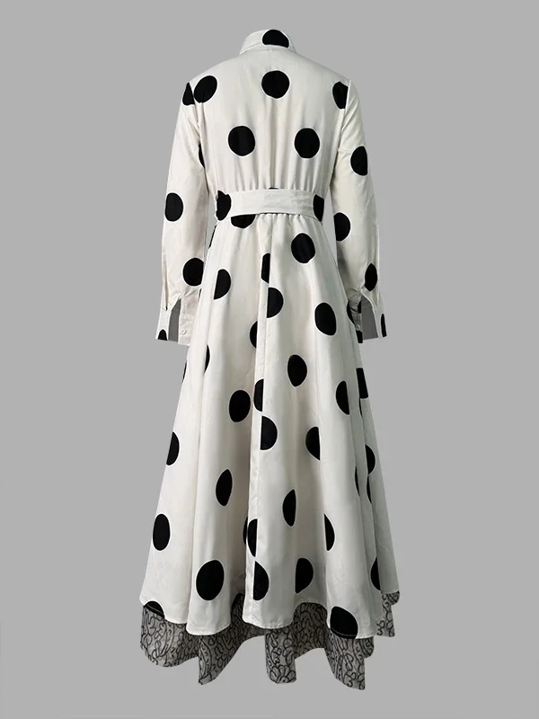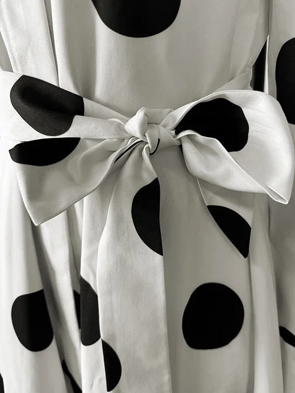LBSFY - Lace-up Waist Polka Dot Dress for Urban Women 2024 Autumn Fashion Stand Collar Long Sleeves A-line Pleated Dresses