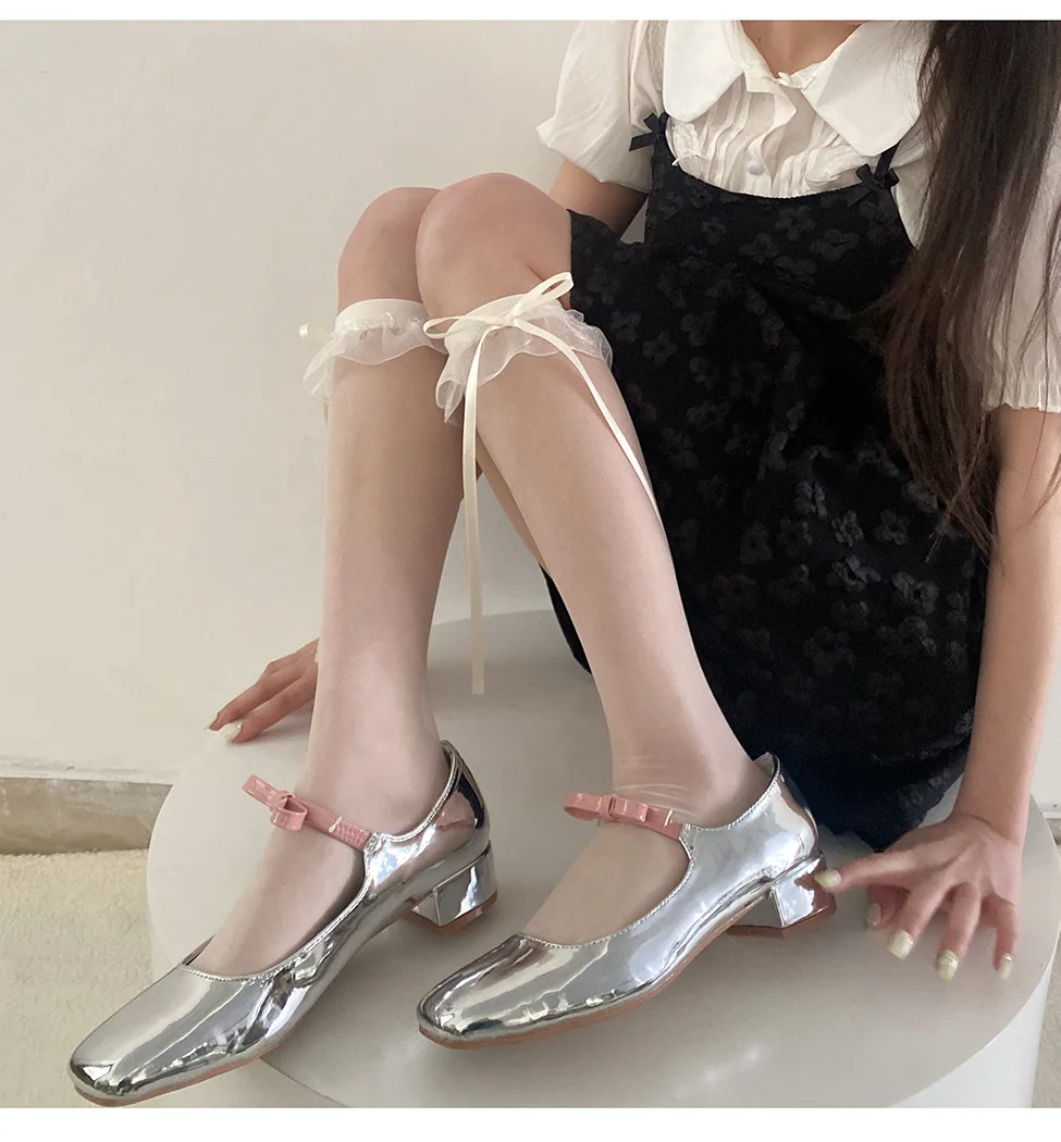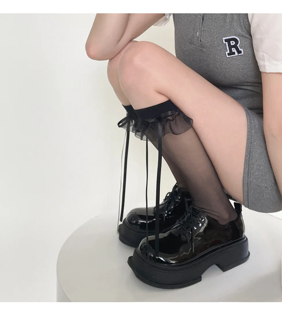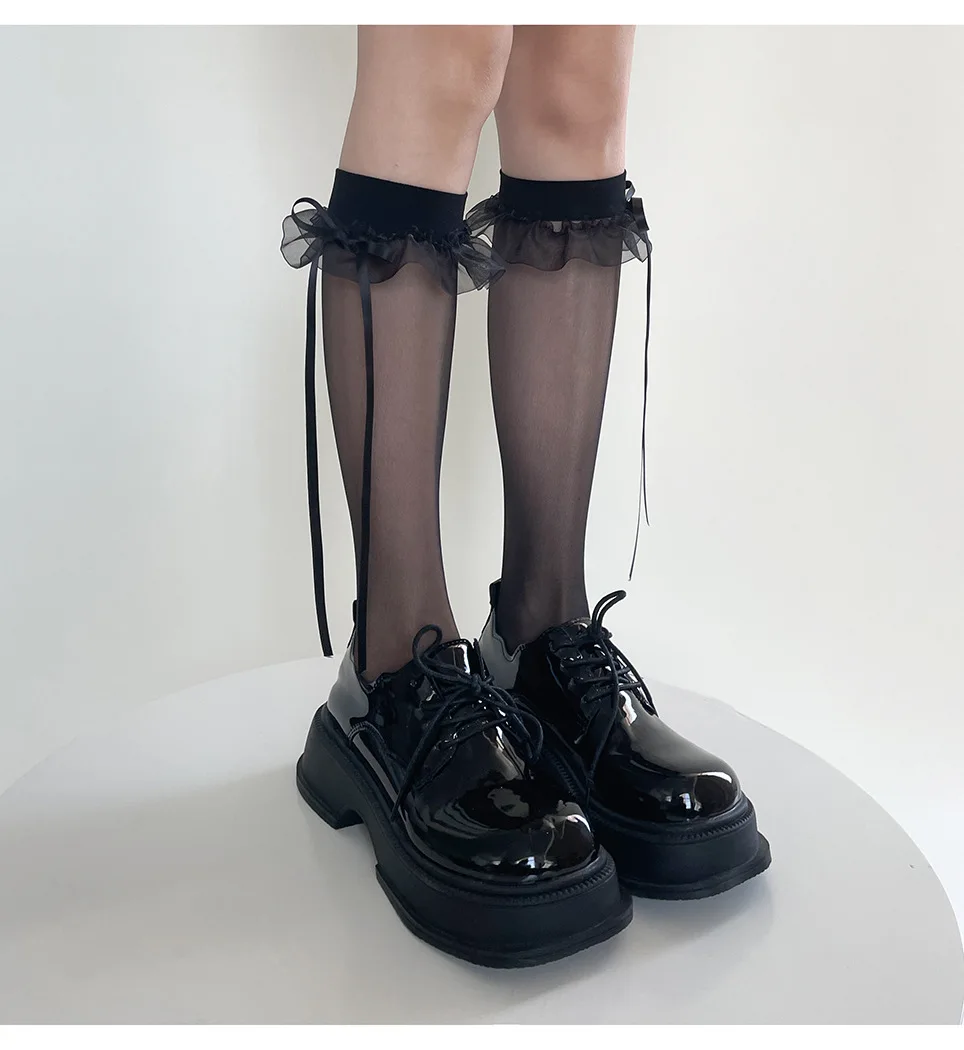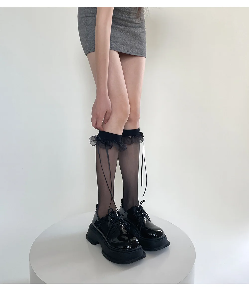 Lbsfy Lolita Girls Long Socks Summer Ultra-thin Transparent Nylon Stockings Sweet Cute JK Lace Ruffle Knee Socks Ribbon Bow Stockings