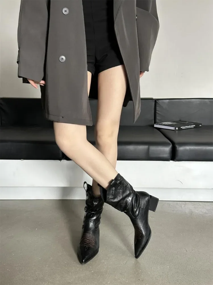 LBSFY - Luxury Pointed Toe Chunky Ankle Boots Women 2025 Fashion Embroidery Soft Leather Pleated Designer Boots for Women Knight Boots