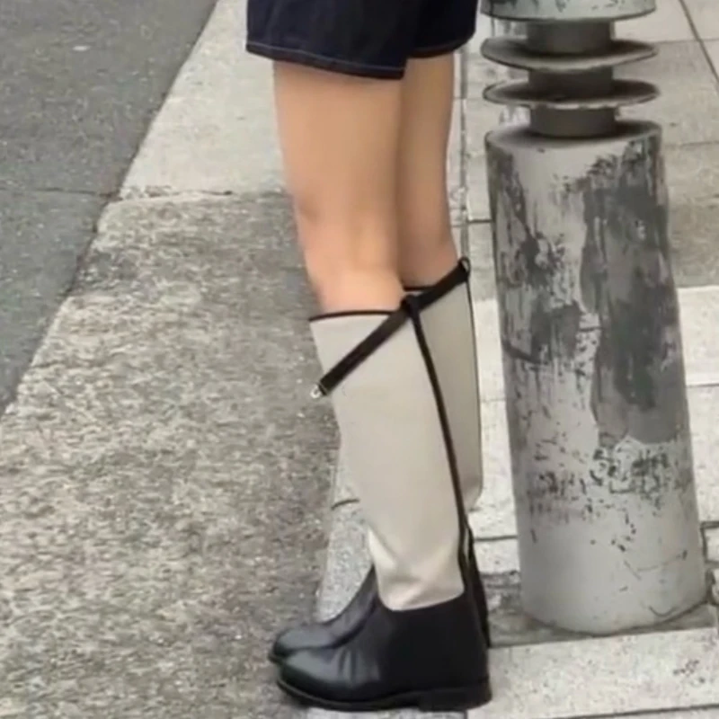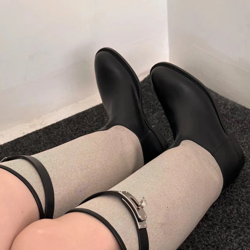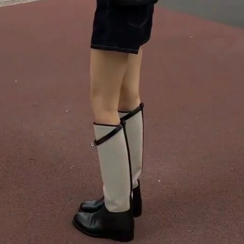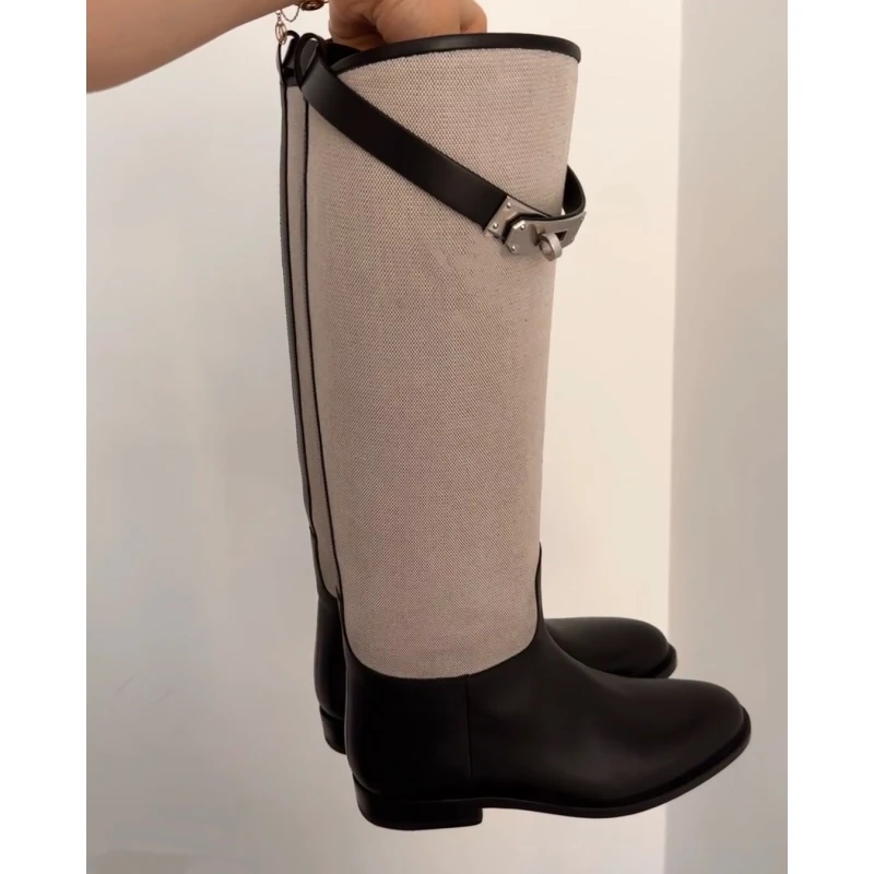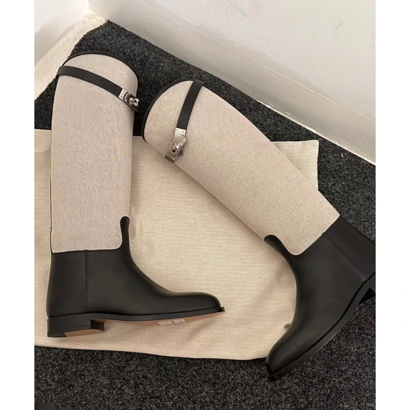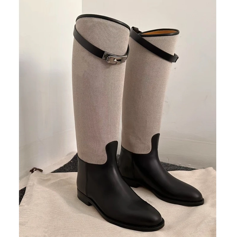 LBSFY  -  Metal Buckle Canvas Round Toe Botas Mujer Designer Winter Slip-On Mixed Colors Shoes for Women British Knee-High Knight Boots