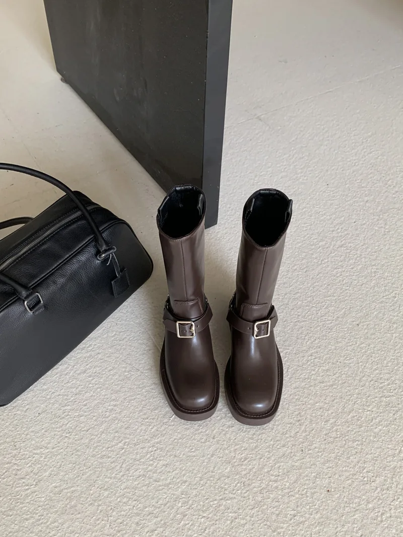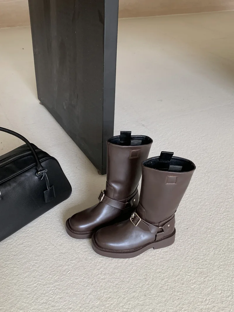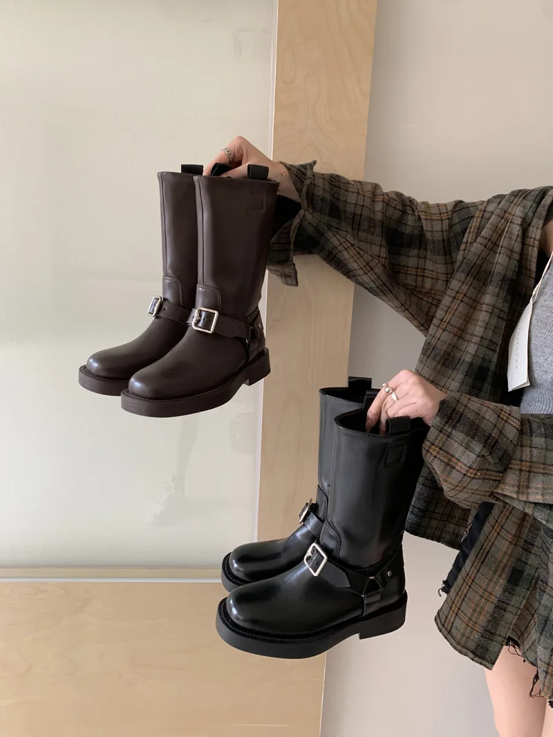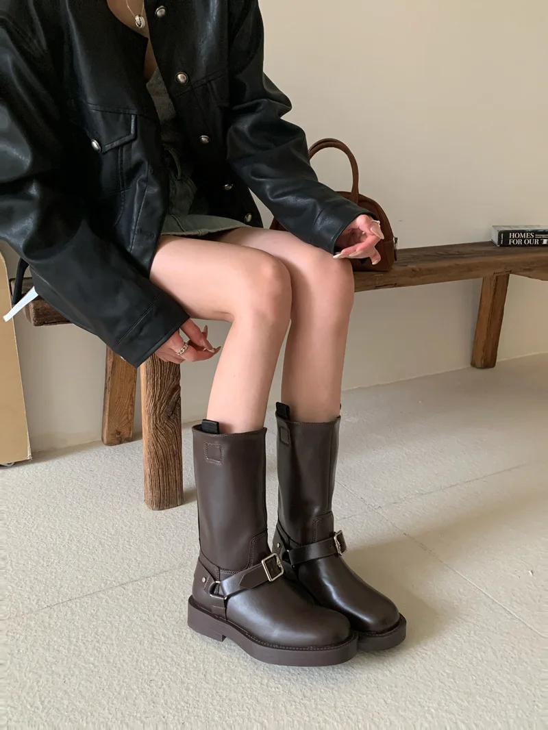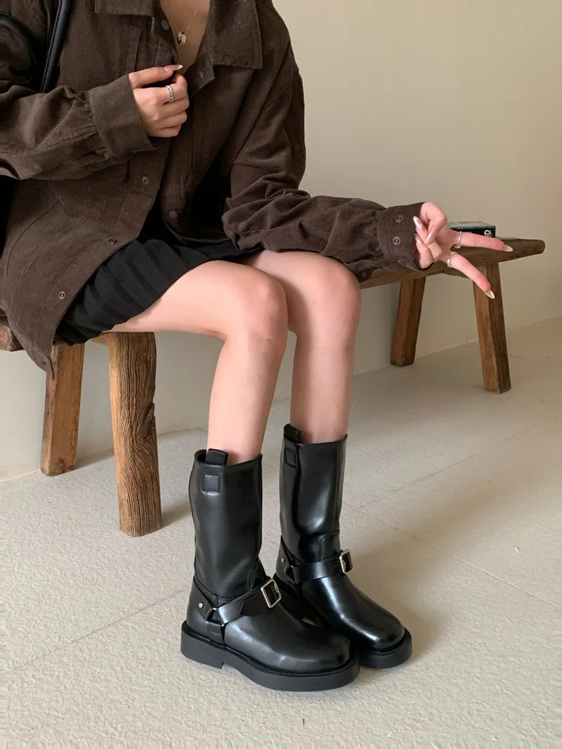 LBSFY - Mid Calf Boots Women Round Toe Black Pu Leather Buckle Block Heel Biker Shoes Wide Calf