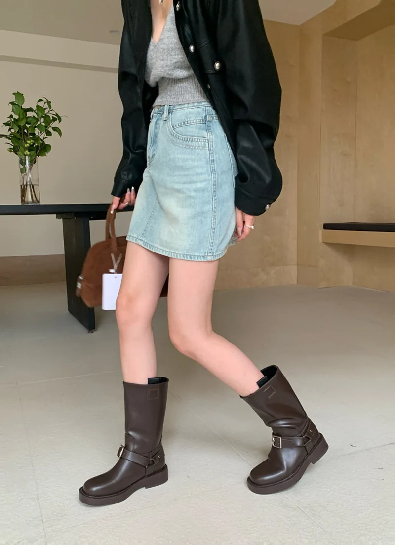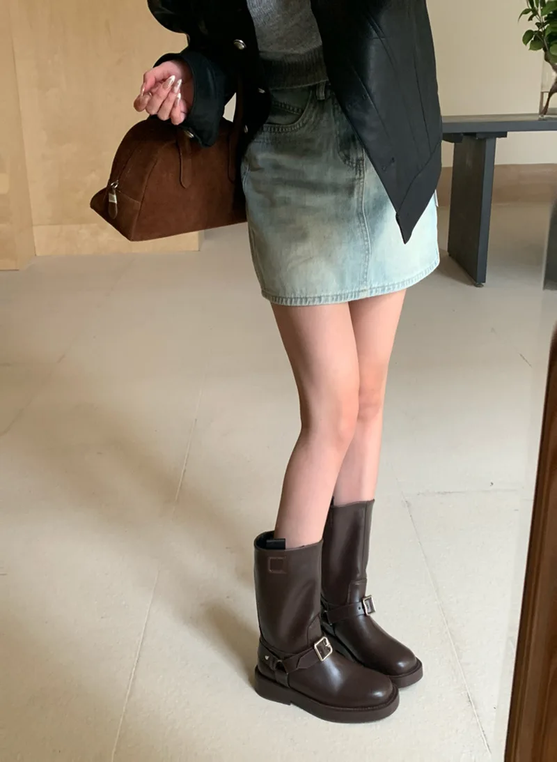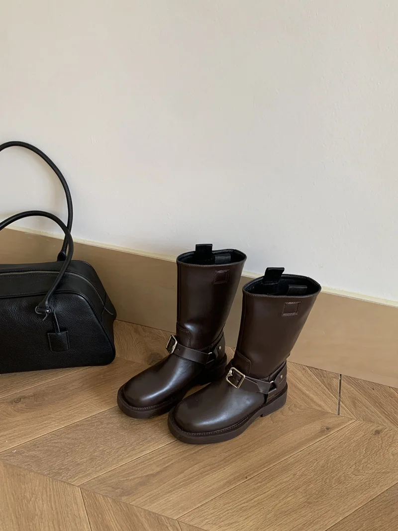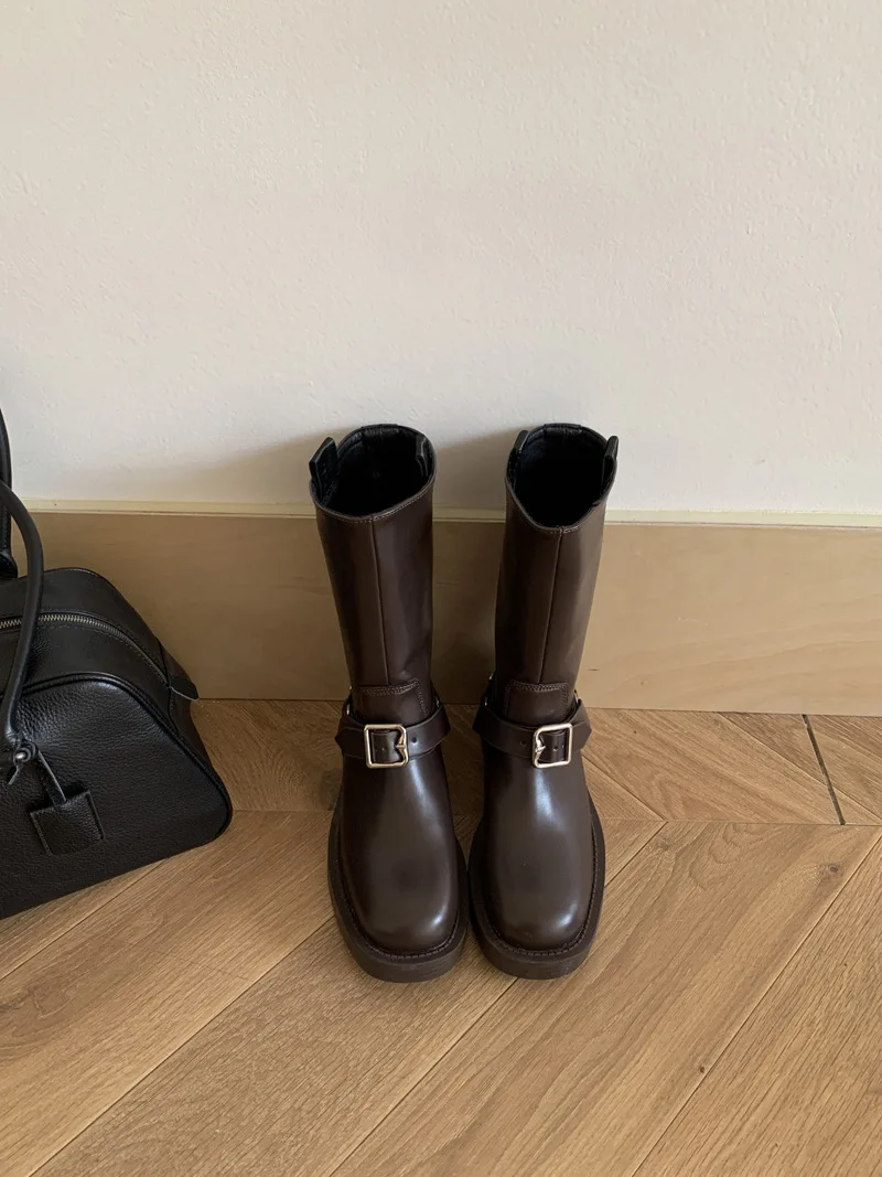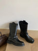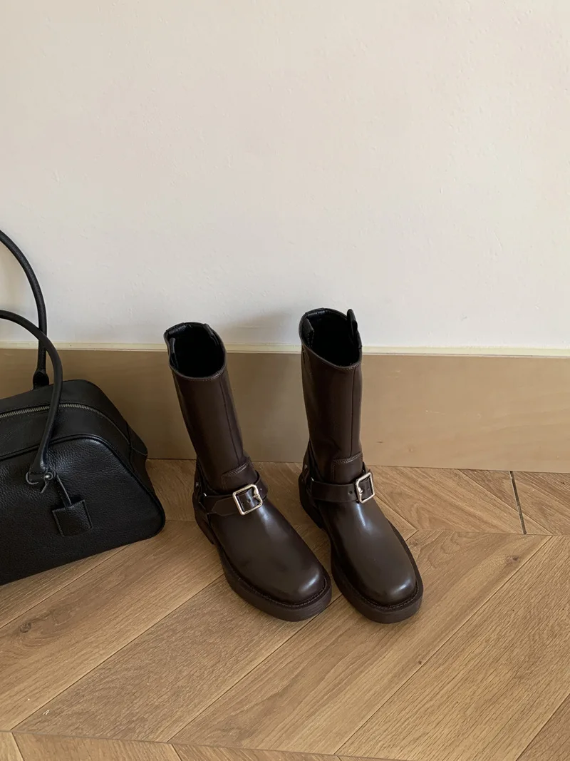 LBSFY - Mid Calf Boots Women Round Toe Black Pu Leather Buckle Block Heel Biker Shoes Wide Calf