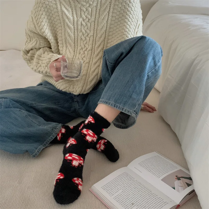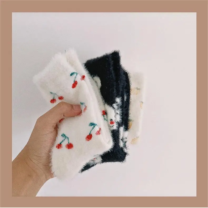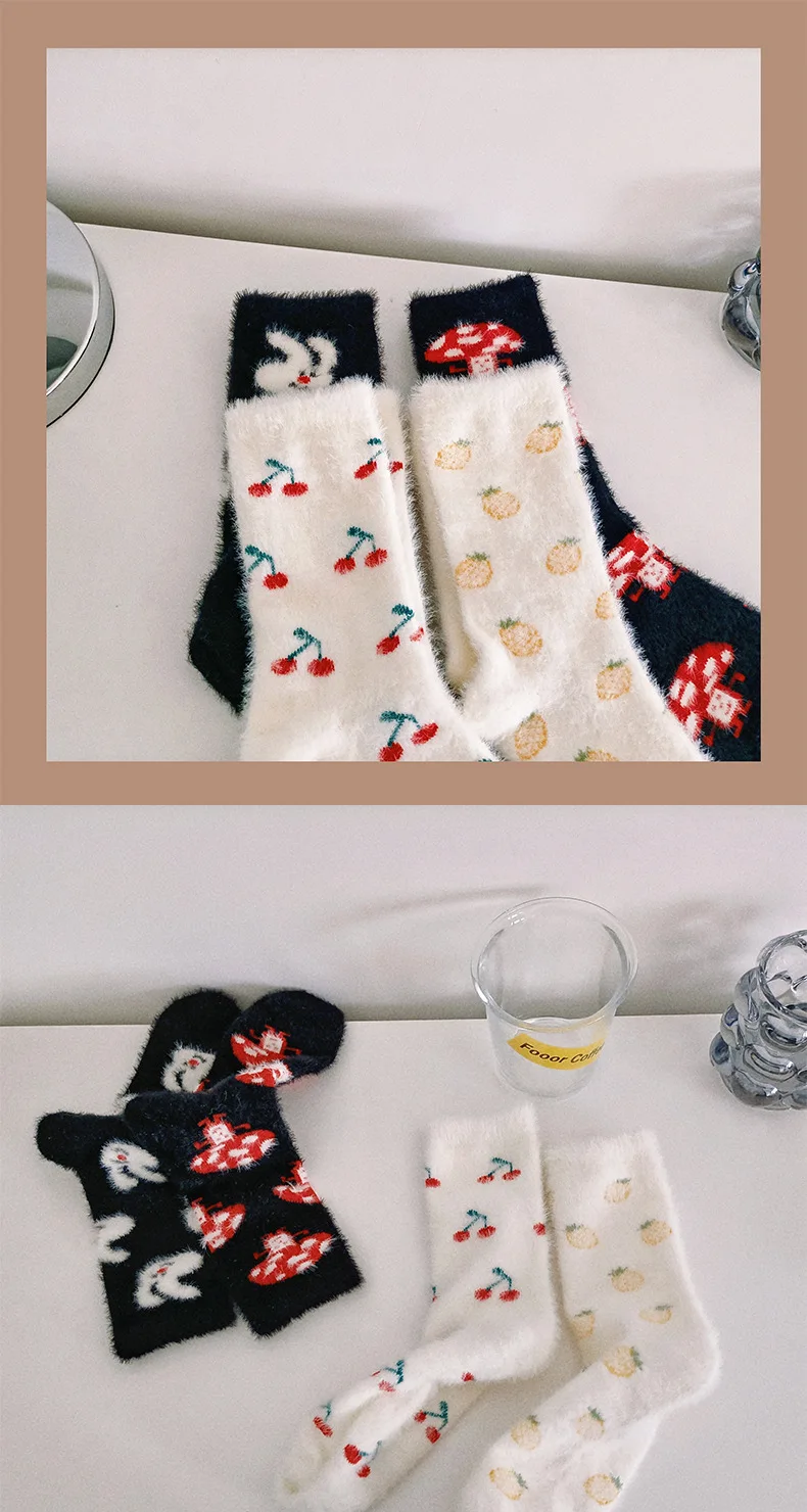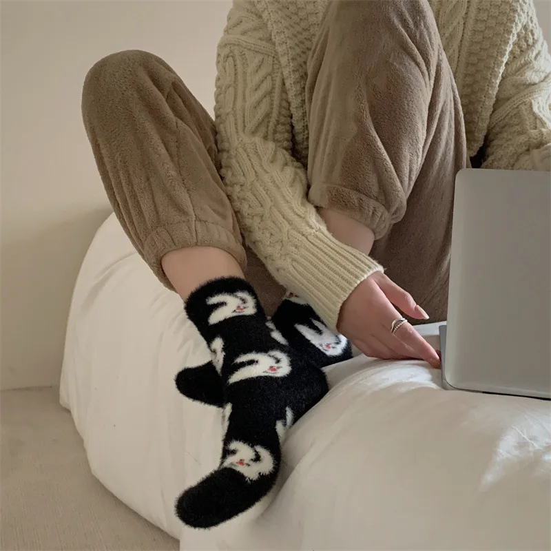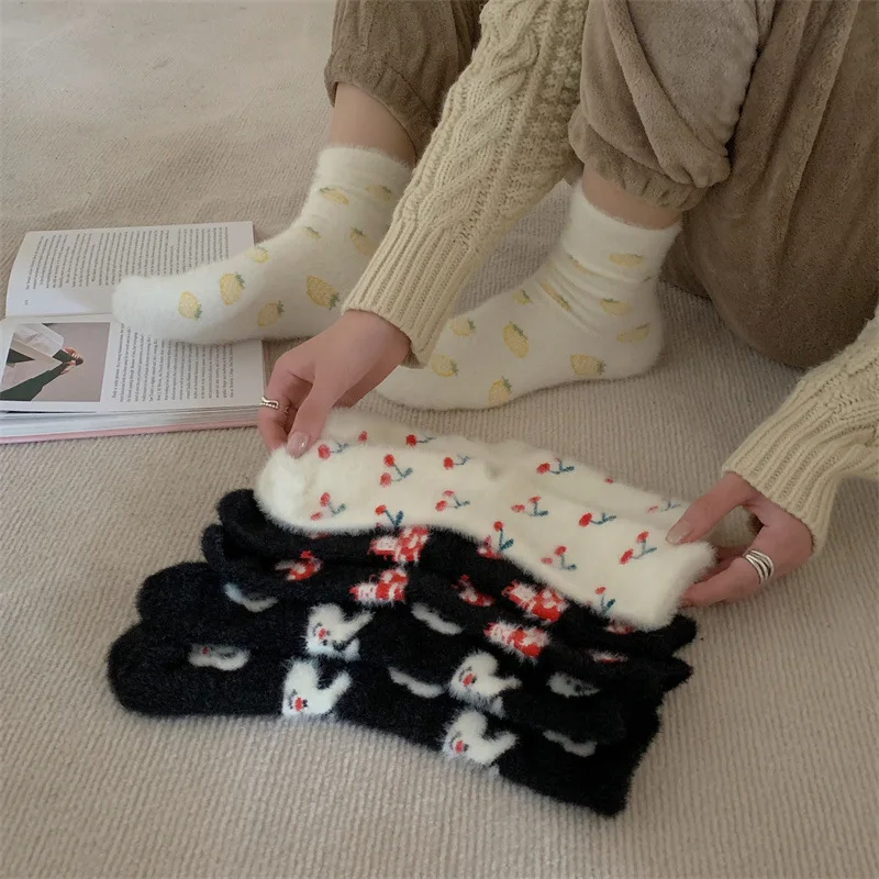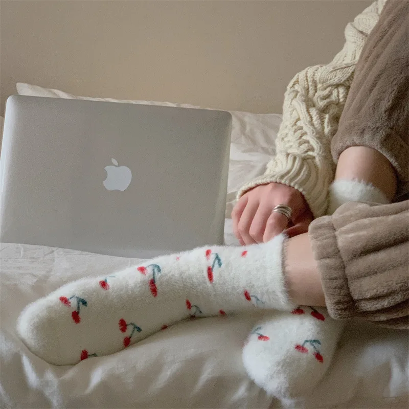 Lbsfy Mink Velvet Socks Women Autumn Winter Cartoon Rabbit Cherry Soft Kawaii Cute Thicken Thermal Coral Velvet Sleep Plush Floor Sock