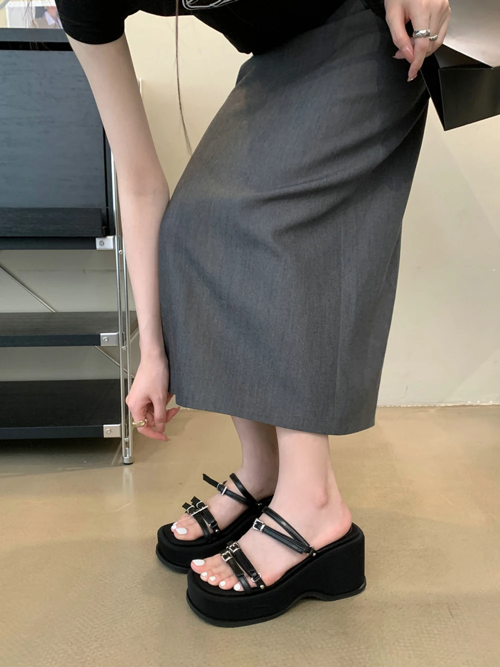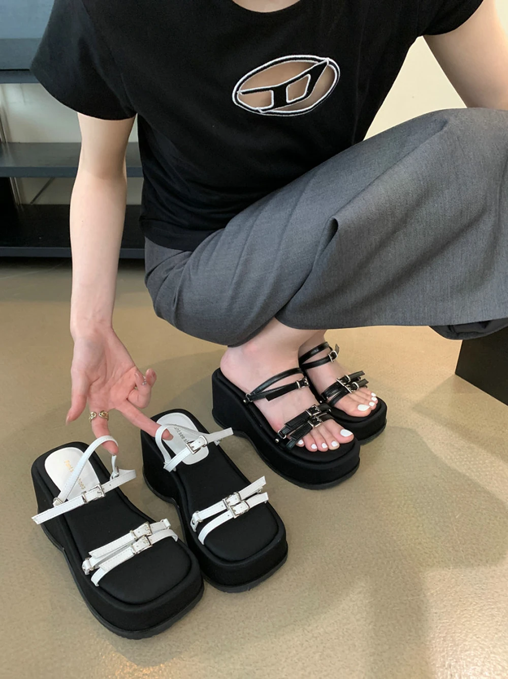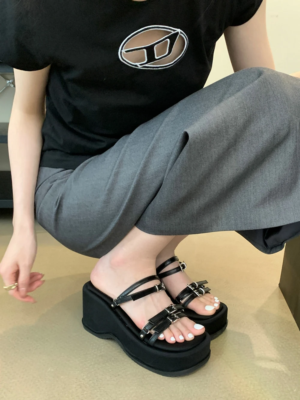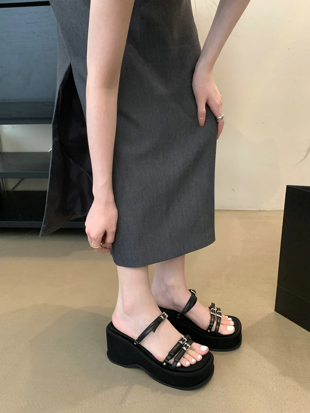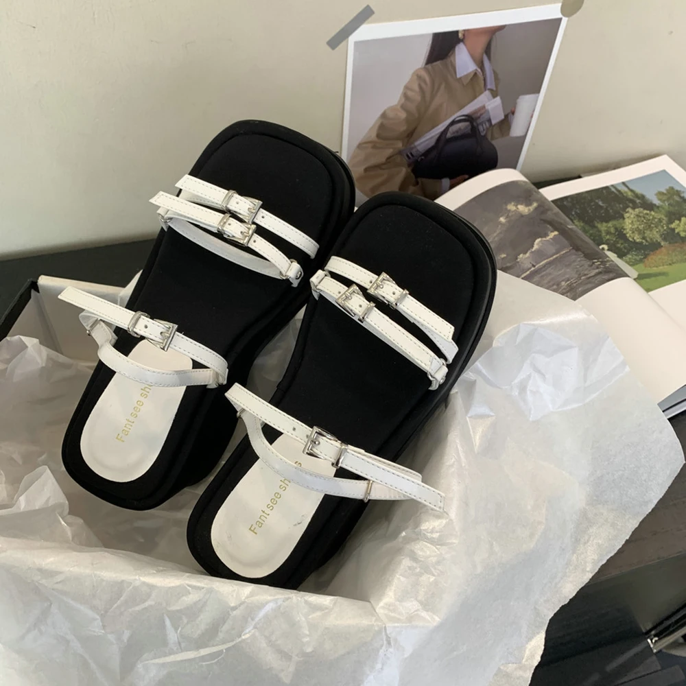 LBSFY - Narrow Band Women Slippers Wedge High Heels Platform Shoes Black White Summer Outside Slides Fashion Dress Shoes Party Pumps 39
