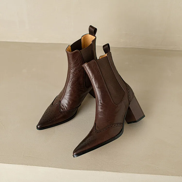 LBSFY - NEW Autumn Women Boots Genuine Leather Shoes for Women Pointed Toe Chunky Heel Shoes Hollow Carving Boots High Heel Modern Boots