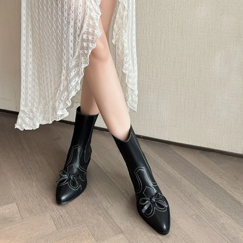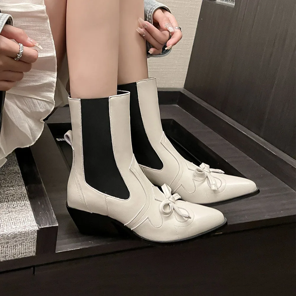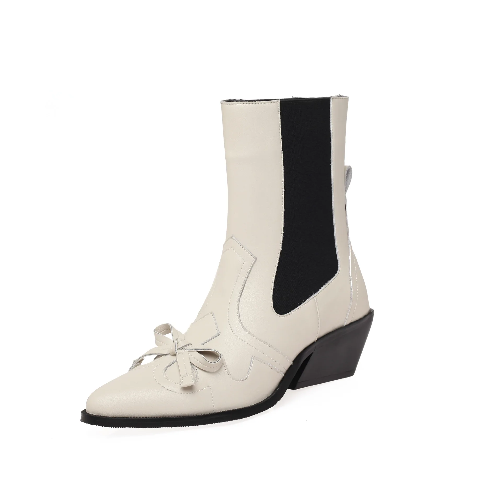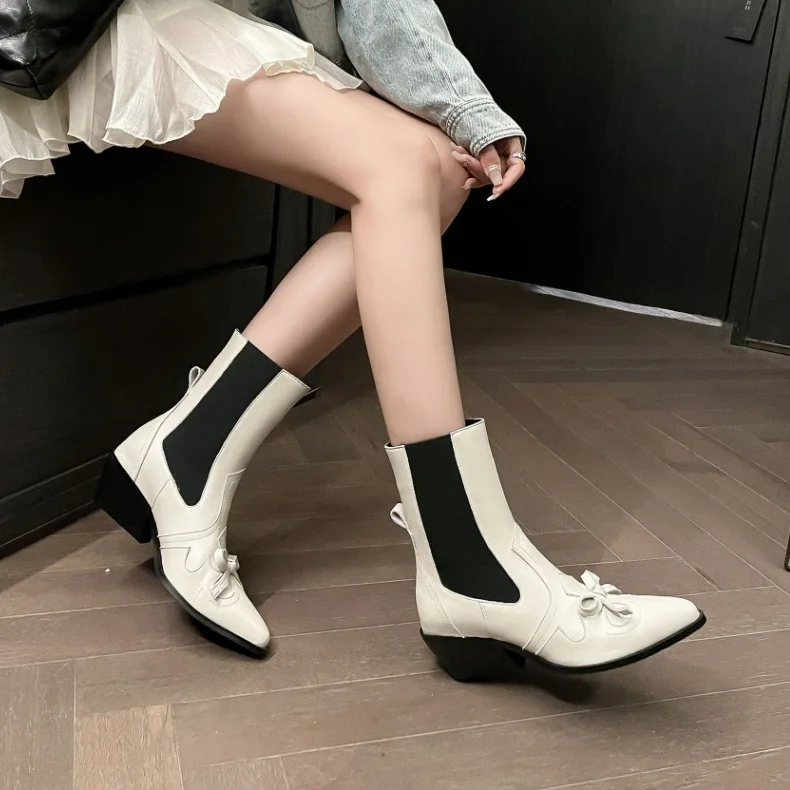LBSFY - New Beige Cowhide Embroidered Short Boots~Sharp Pointed Color Blocked Sweet Bow Tie Thick Heel Mid Heel Fashion Boots