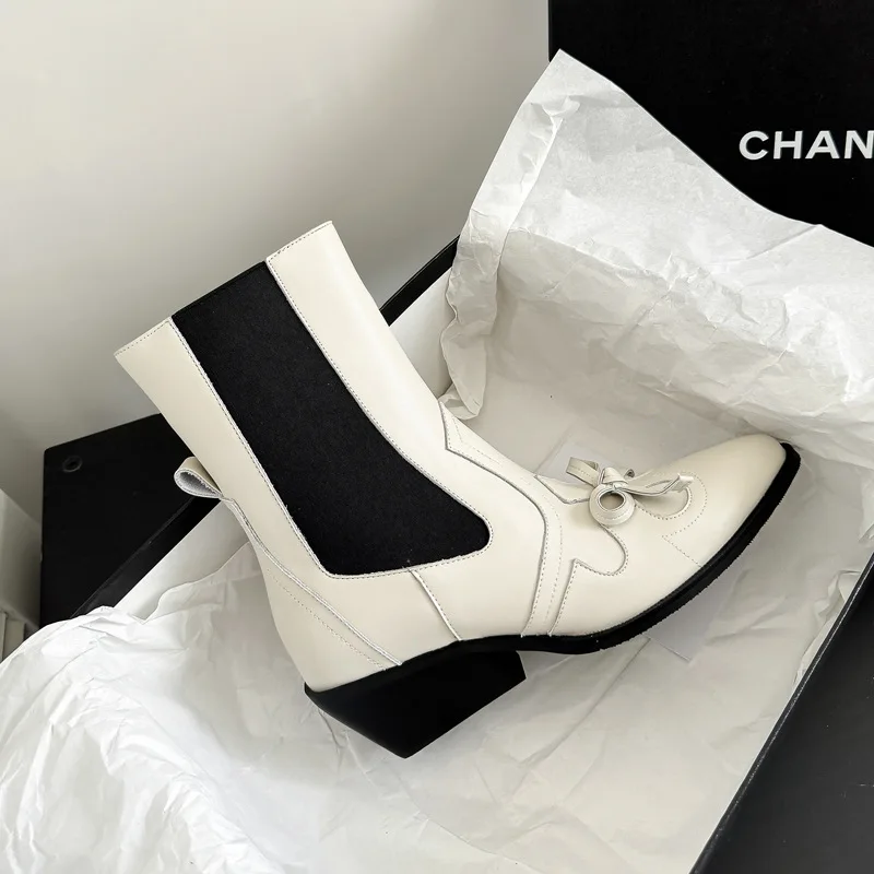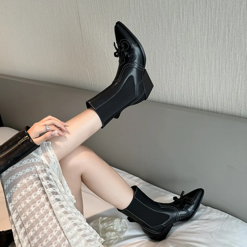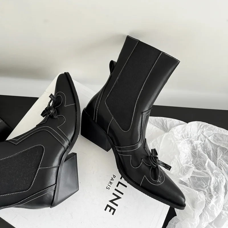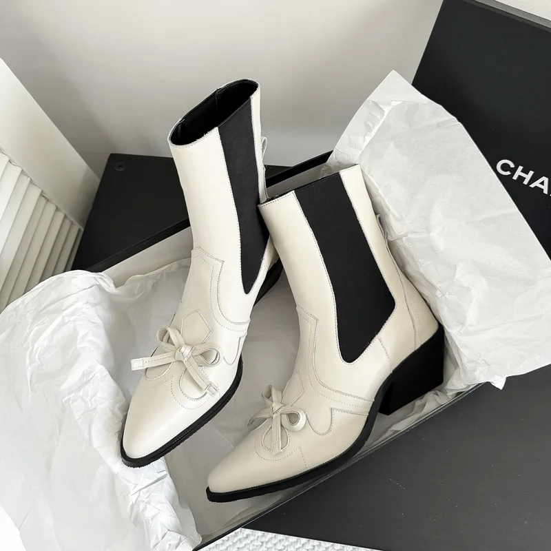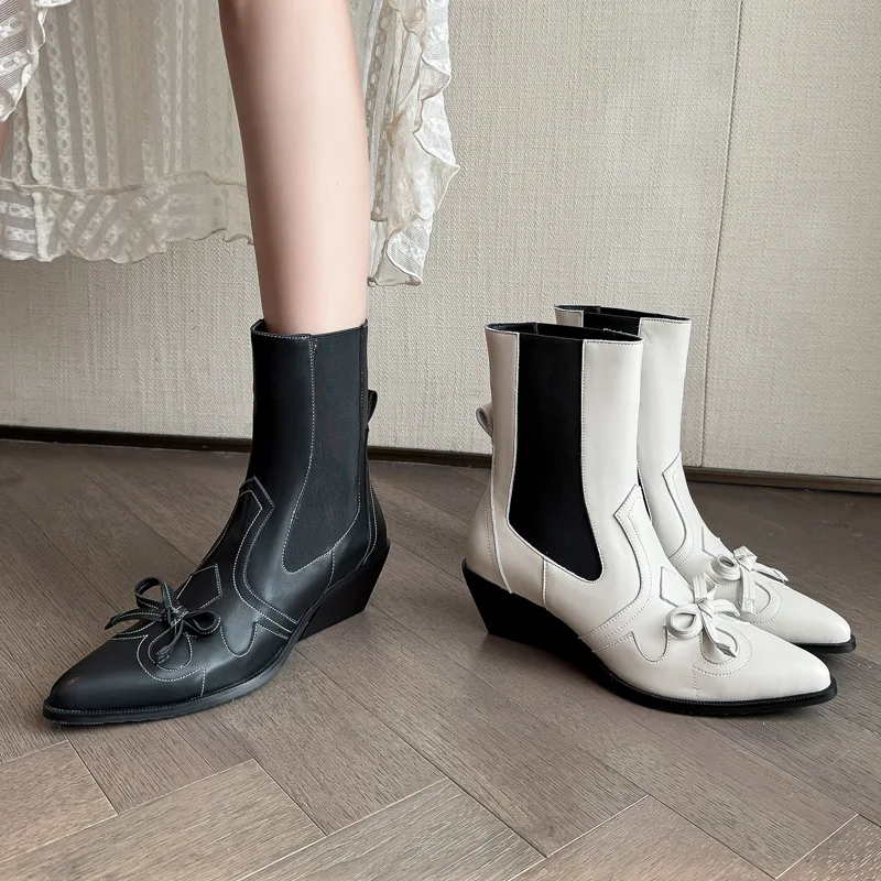 LBSFY - New Beige Cowhide Embroidered Short Boots~Sharp Pointed Color Blocked Sweet Bow Tie Thick Heel Mid Heel Fashion Boots
