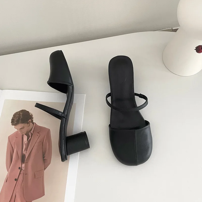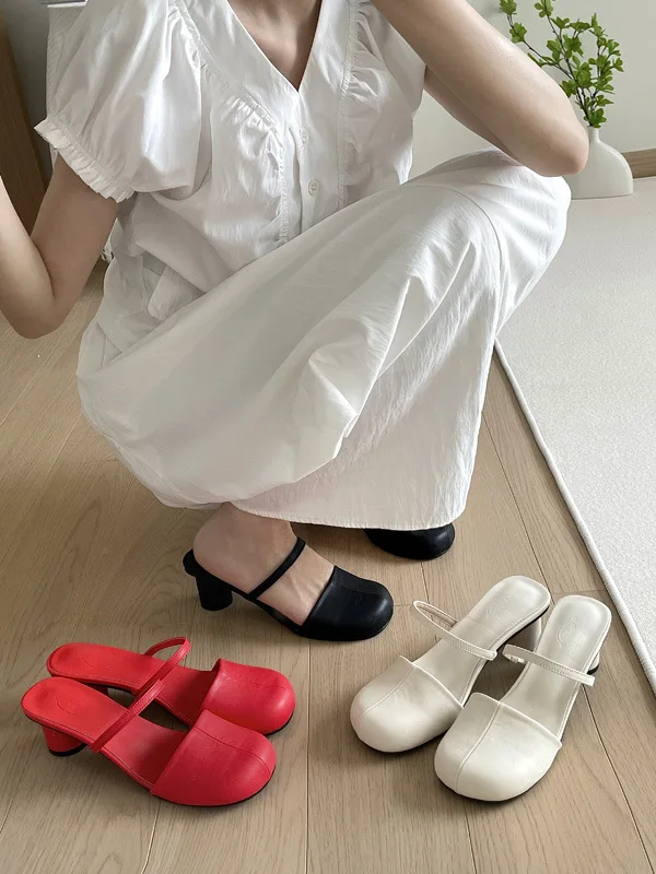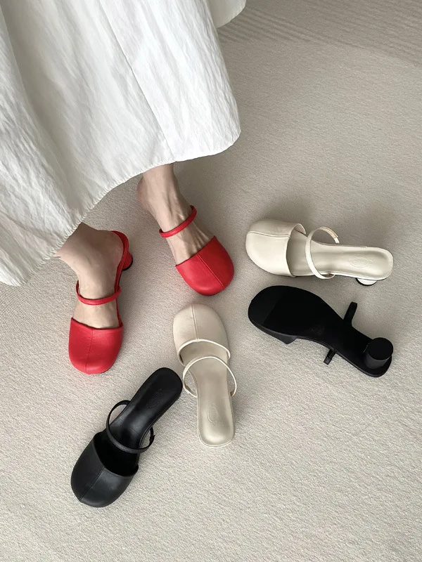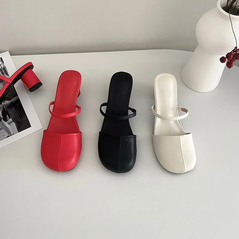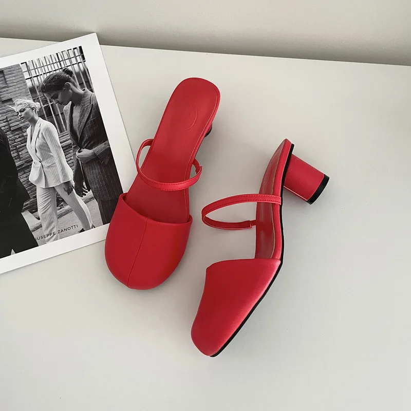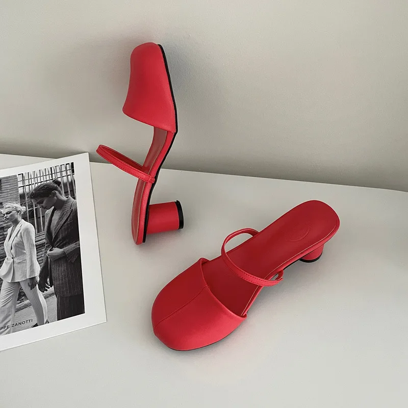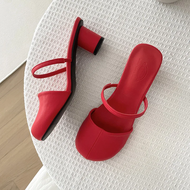 LBSFY - New Designer Heeled Sandals for Women Round Toe Chunky Heel Slippers Female Brand Red Slides Ladies Classy Muller Pumps Women