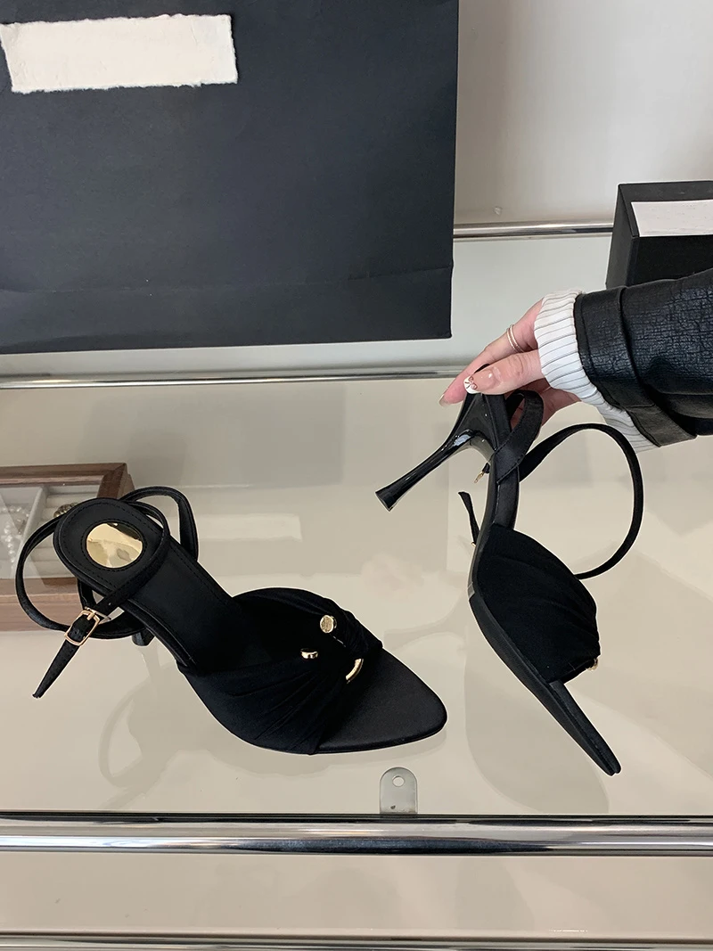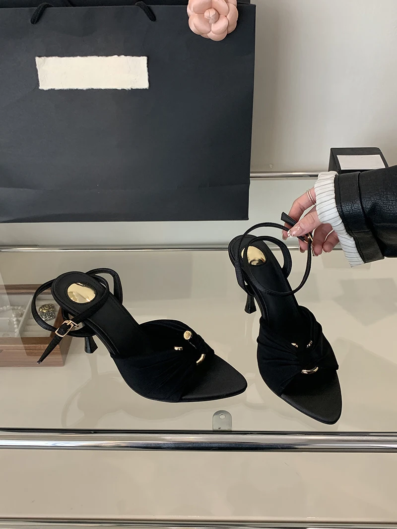 LBSFY -New Fashion Hollow Out Metal Buckle Woman Sandals Cozy Silk Ankle Strap Sexy Pointed Toe High Heels Party Dress Shoes