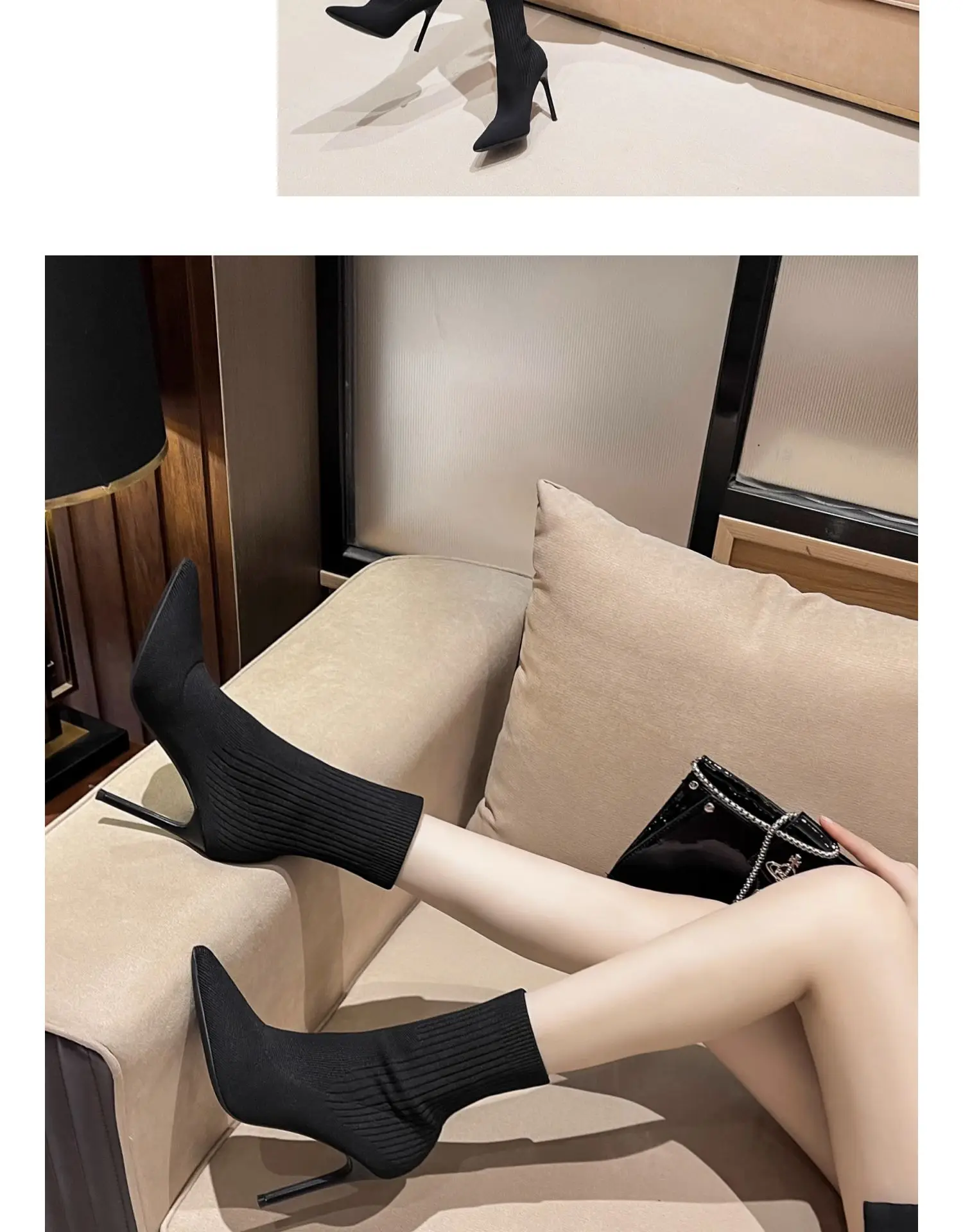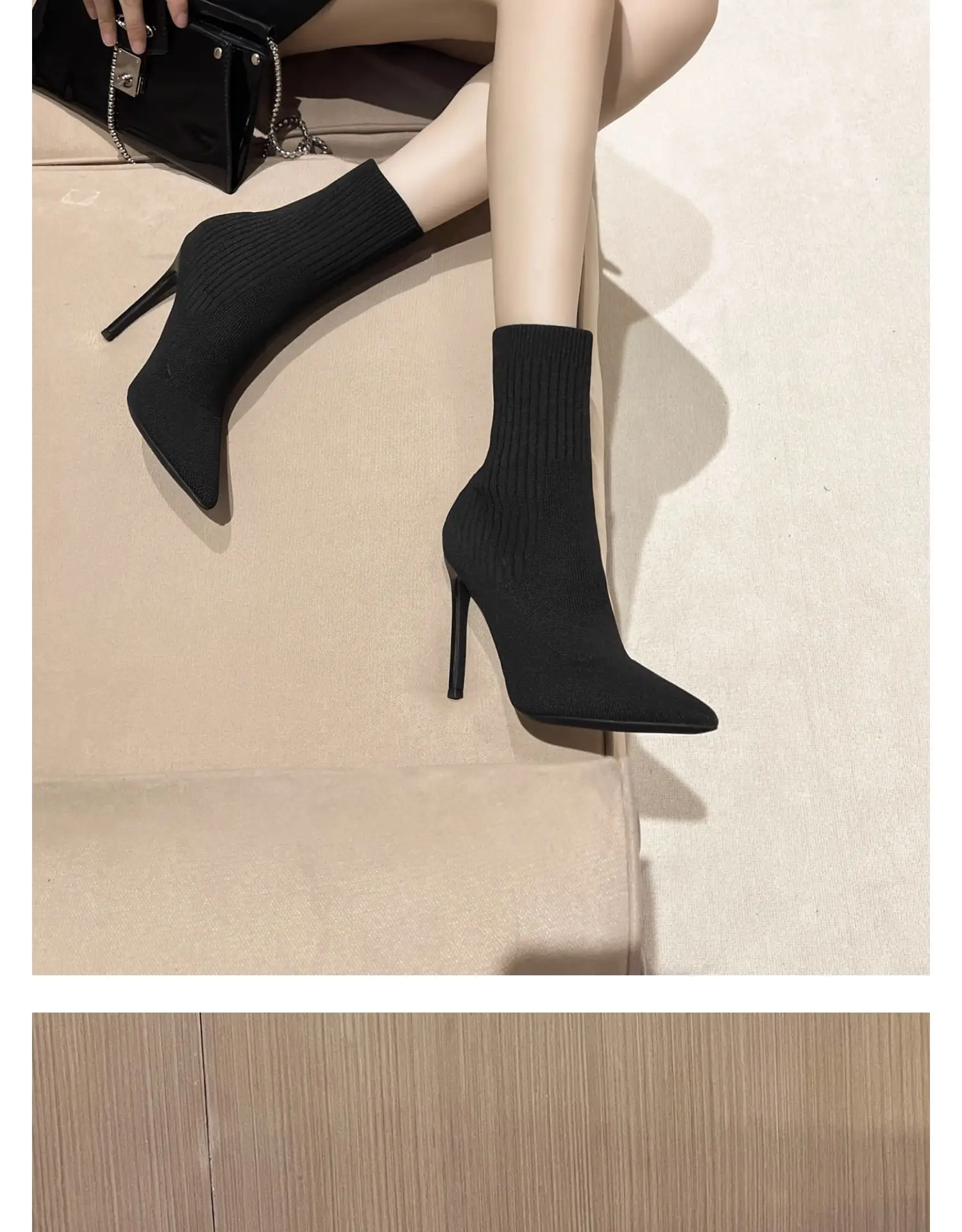 LBSFY - New Short Tube Knitted Wool Elastic Boots Pointed Slim High Heel Short Boots Thin Heel Versatile Women's Boots