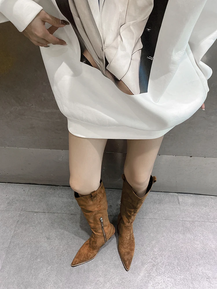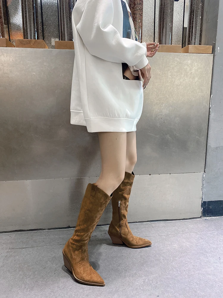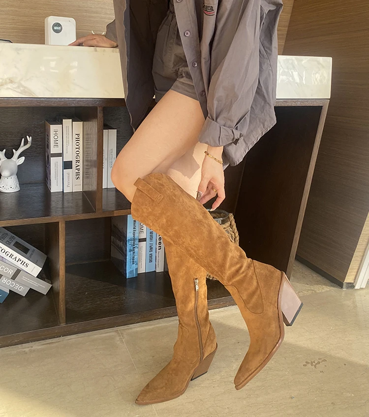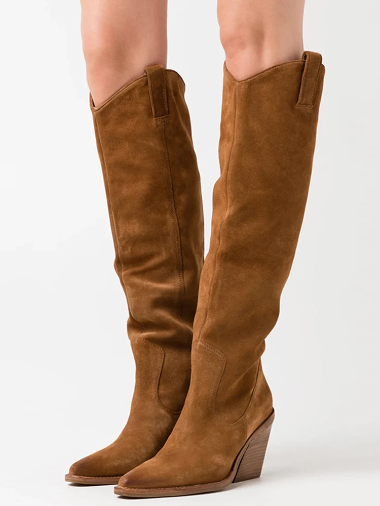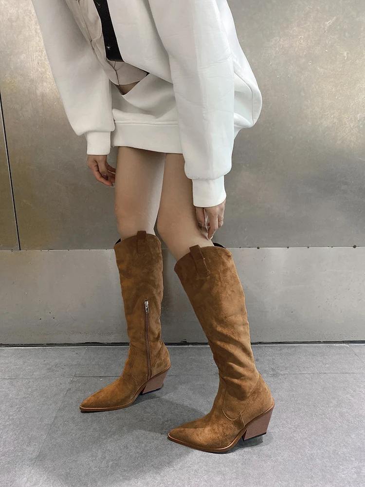 LBSFY - New Suede Pointed Toe Cowboy Knee-High Boots Women Side Zipper Knight Boots High Heels Women Western Boots Women Botines Mujer
