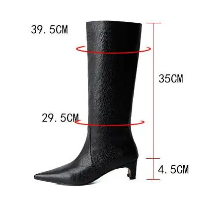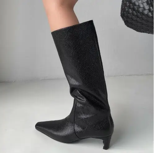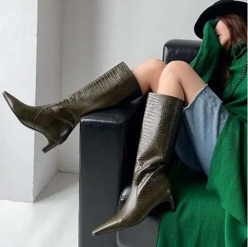 LBSFY - New Women Dark Green Black Crocodile Patterned Leather Pointed Square Toe 45 mm Kitten Heel Tube Slip On Knee High Boots Shoes