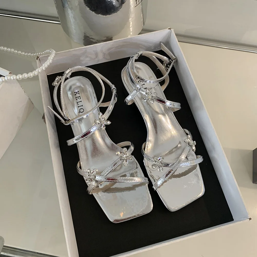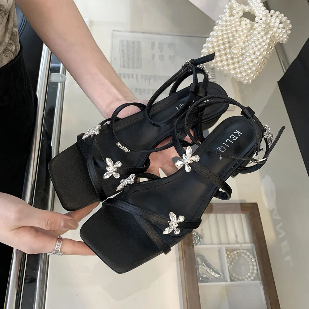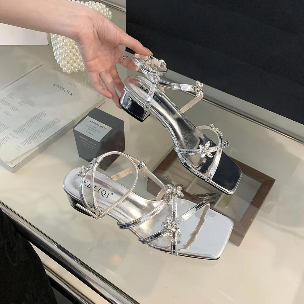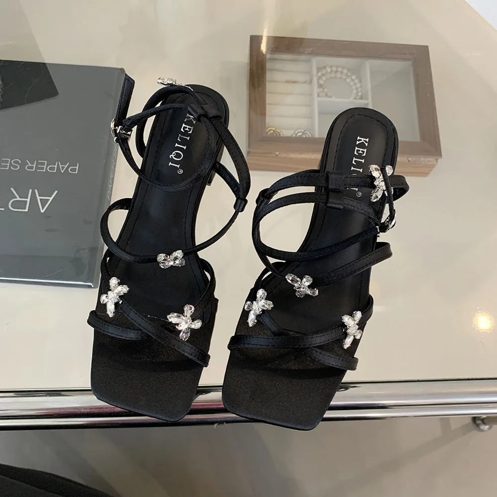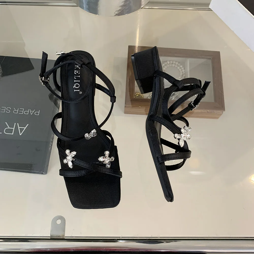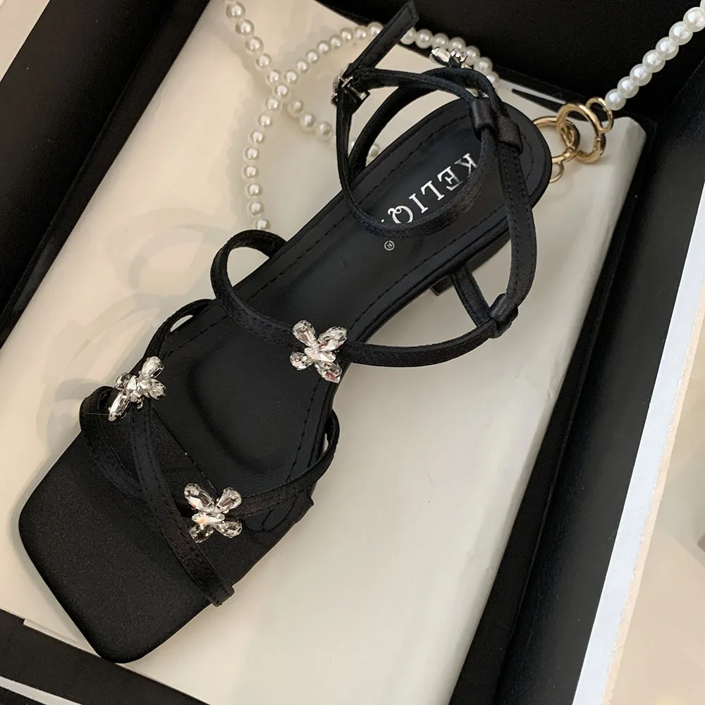 LBSFY - Open Toe Women Sandals Black Silver Summer Dress Shoes Thick Mid Heels Ankle Strap Party Pumps Butterfly Design Rhinestone Bow