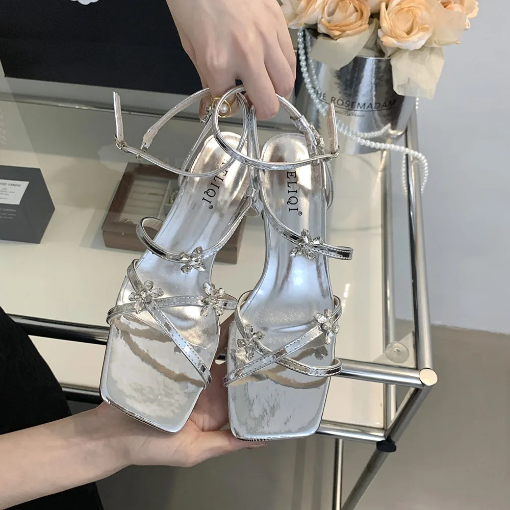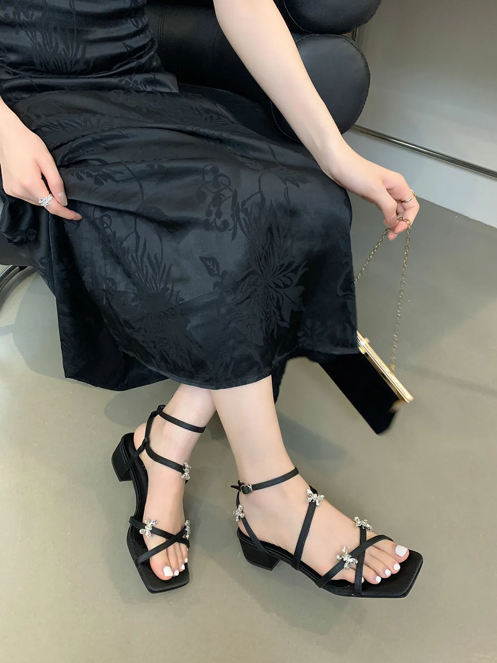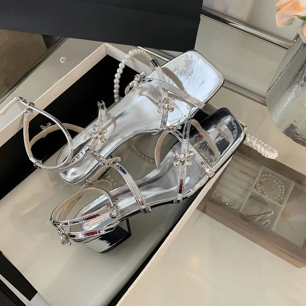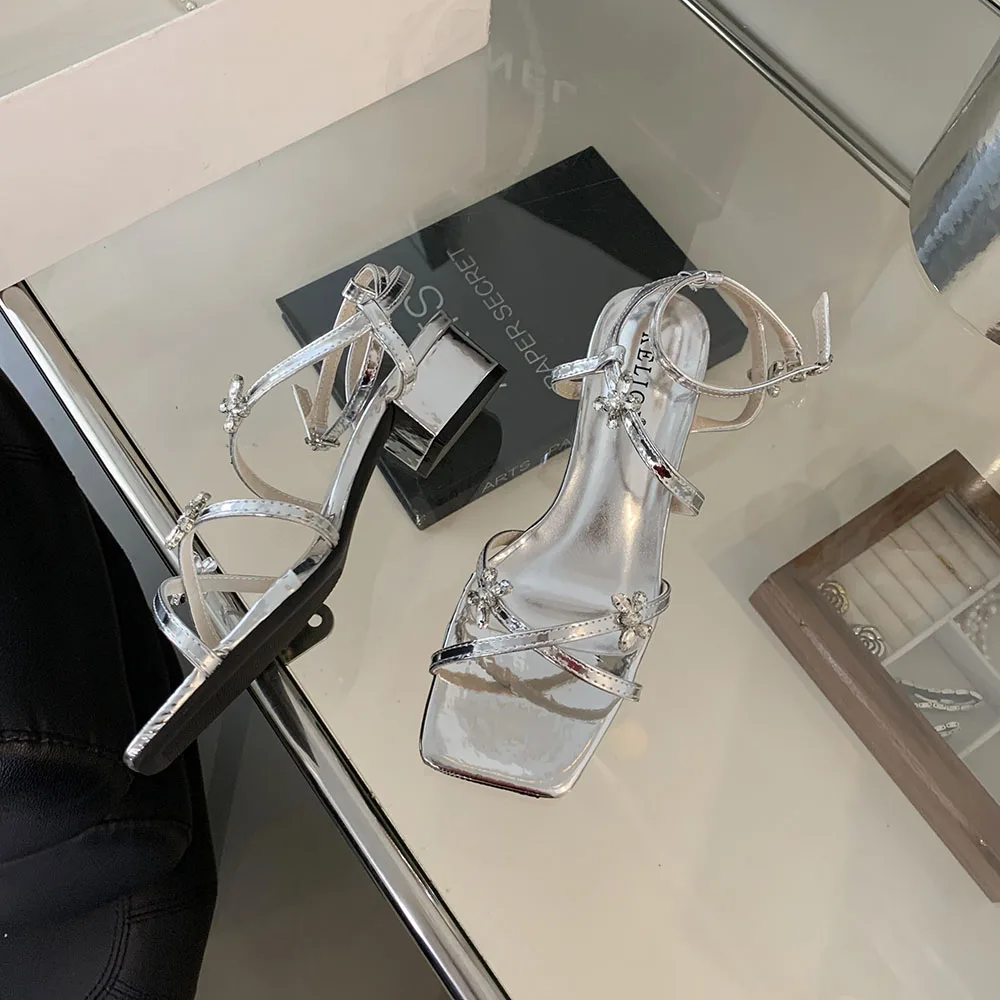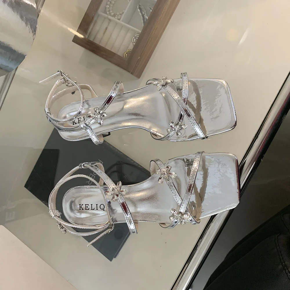 LBSFY - Open Toe Women Sandals Black Silver Summer Dress Shoes Thick Mid Heels Ankle Strap Party Pumps Butterfly Design Rhinestone Bow