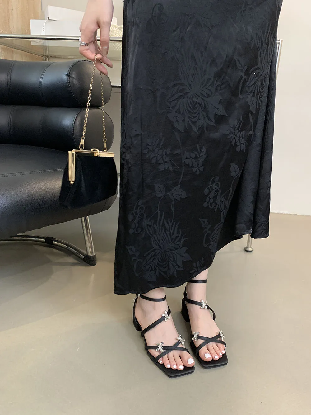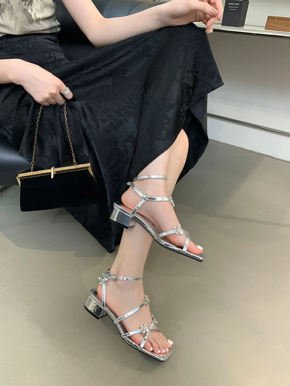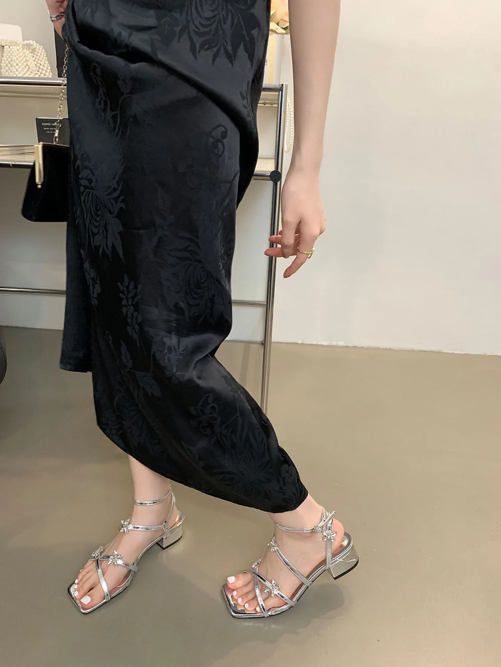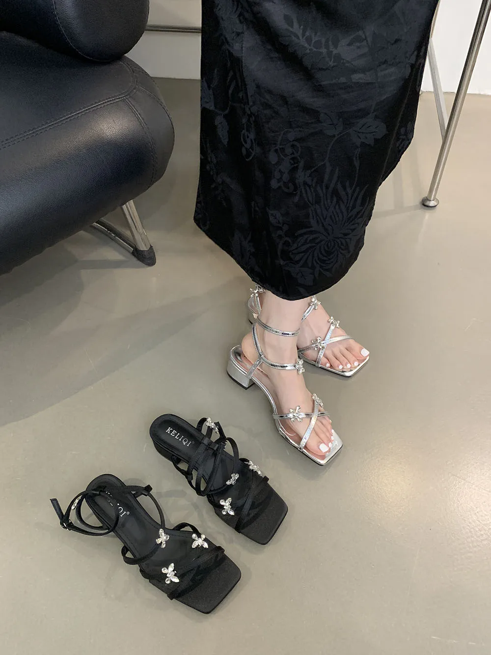 LBSFY - Open Toe Women Sandals Black Silver Summer Dress Shoes Thick Mid Heels Ankle Strap Party Pumps Butterfly Design Rhinestone Bow