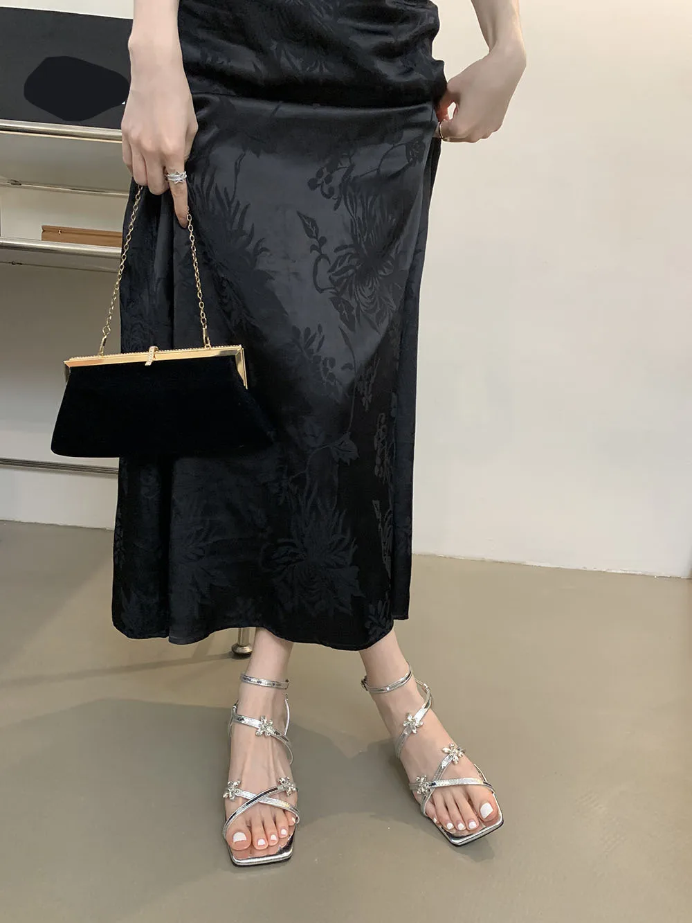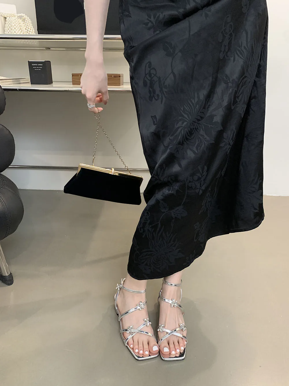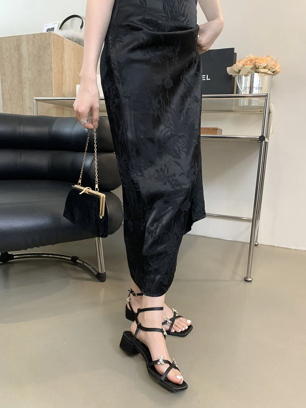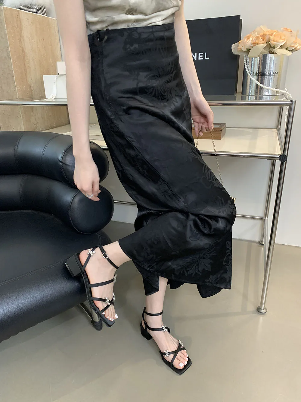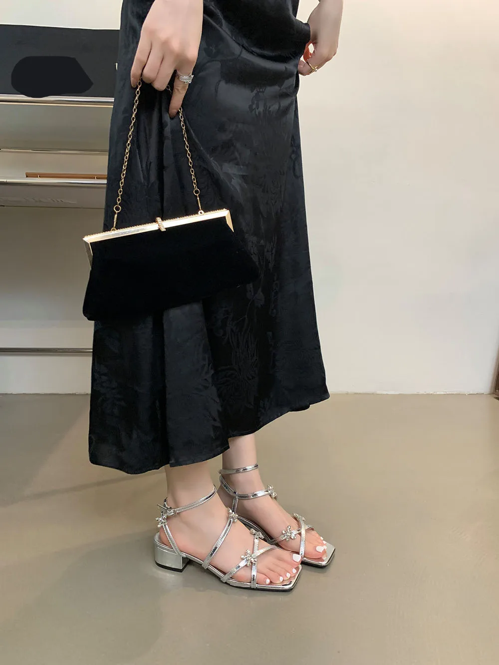 LBSFY - Open Toe Women Sandals Black Silver Summer Dress Shoes Thick Mid Heels Ankle Strap Party Pumps Butterfly Design Rhinestone Bow