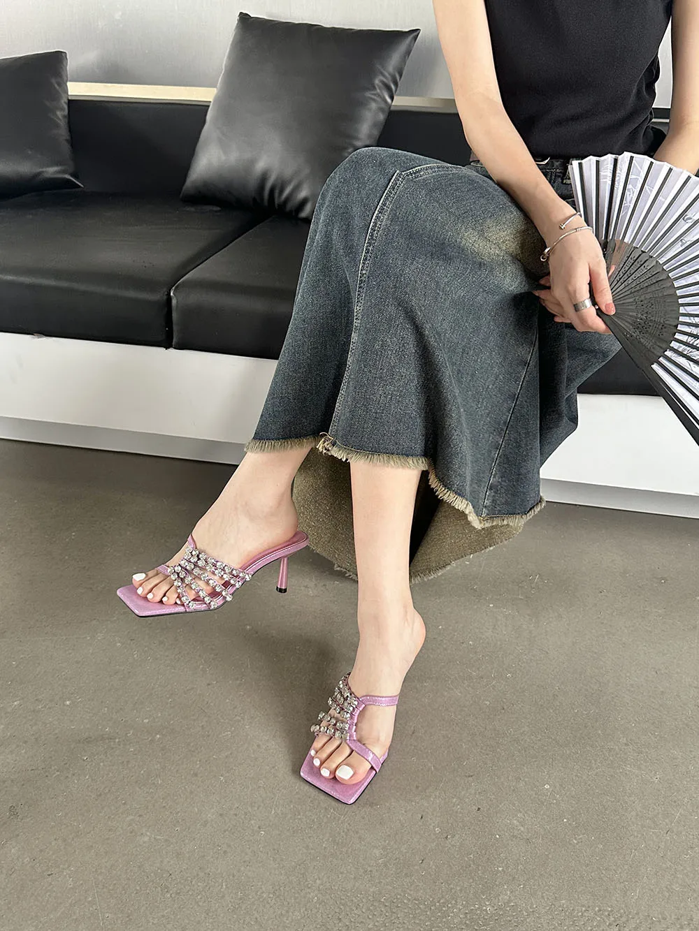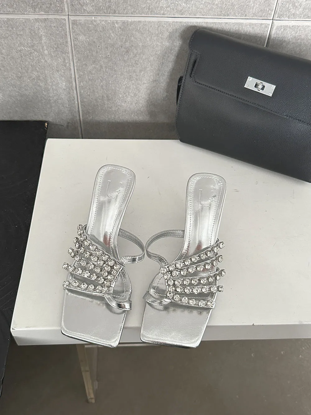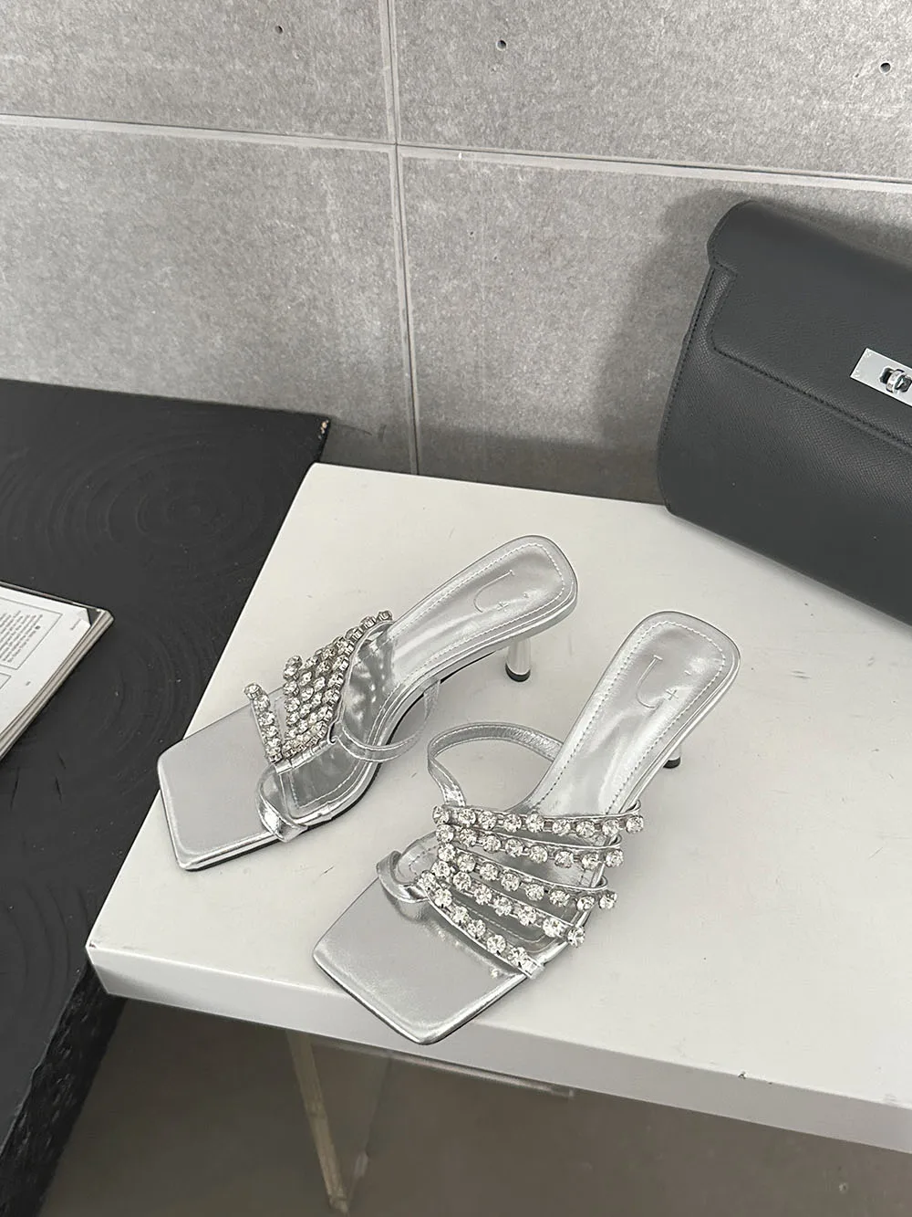 LBSFY - Open Toe Women Sandals Slides Slippers Summer Outside Mules Shoes Thin High Heels Party Pumps Dress Shoes Black Silver Pink 39