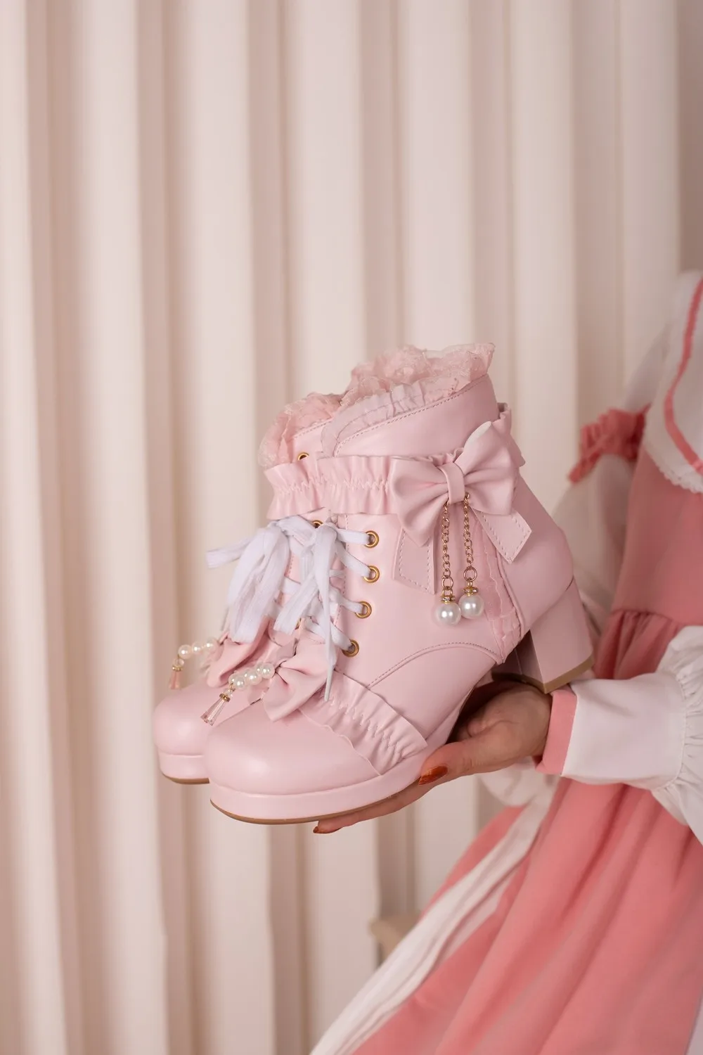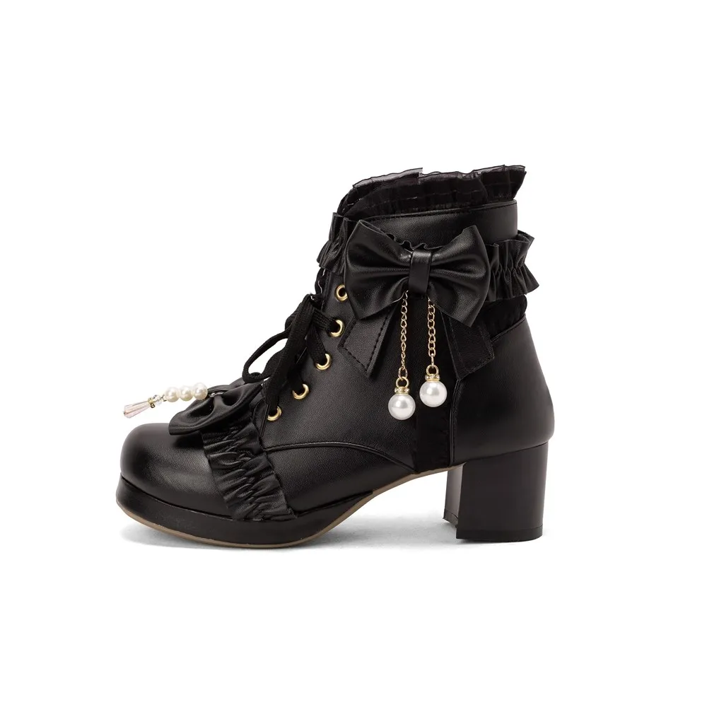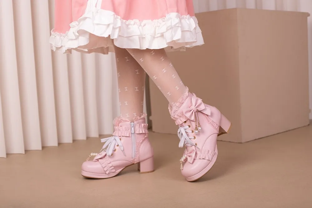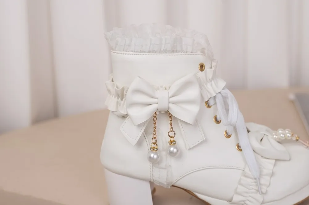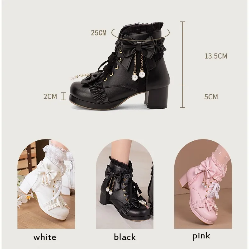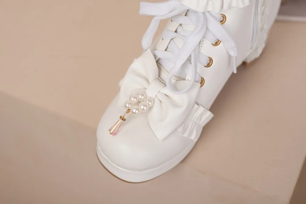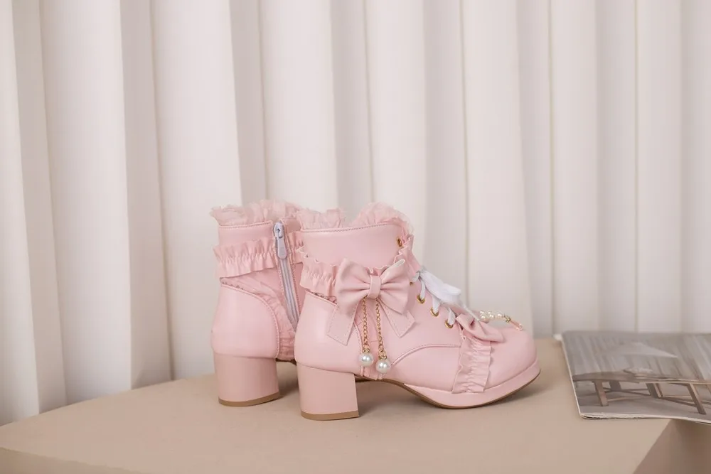 LBSFY - Pink White Black Chunky Heel Lolita Shoes Butterfly-knot Pearls Lace Up Womens Cosplay Princess Cute Sweet Winter Ankle Boots 42