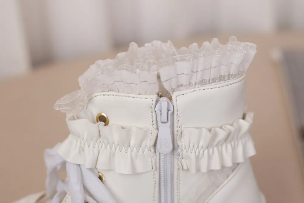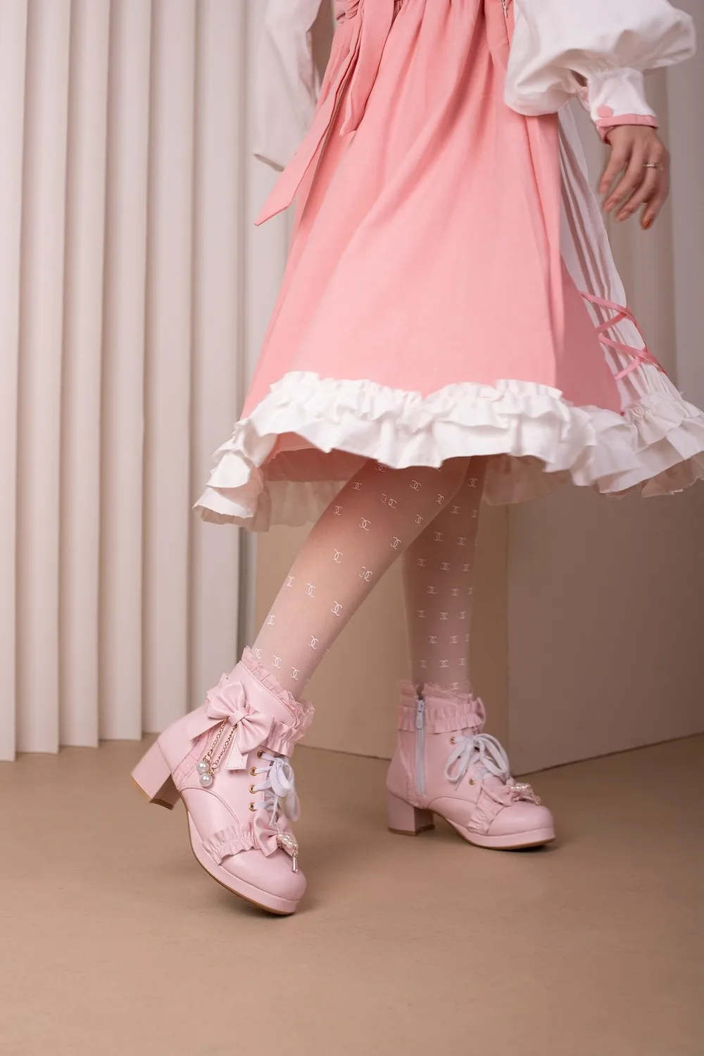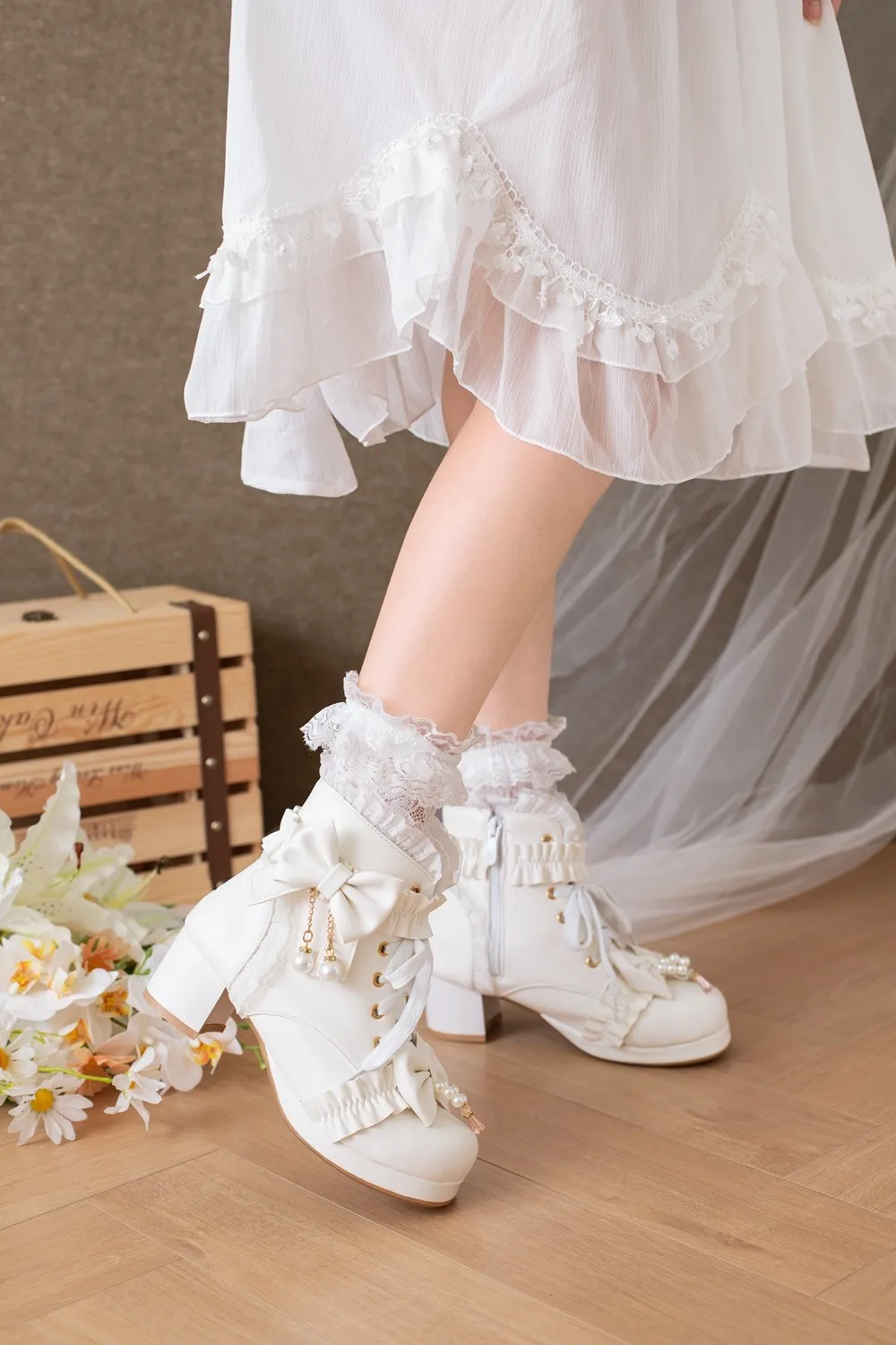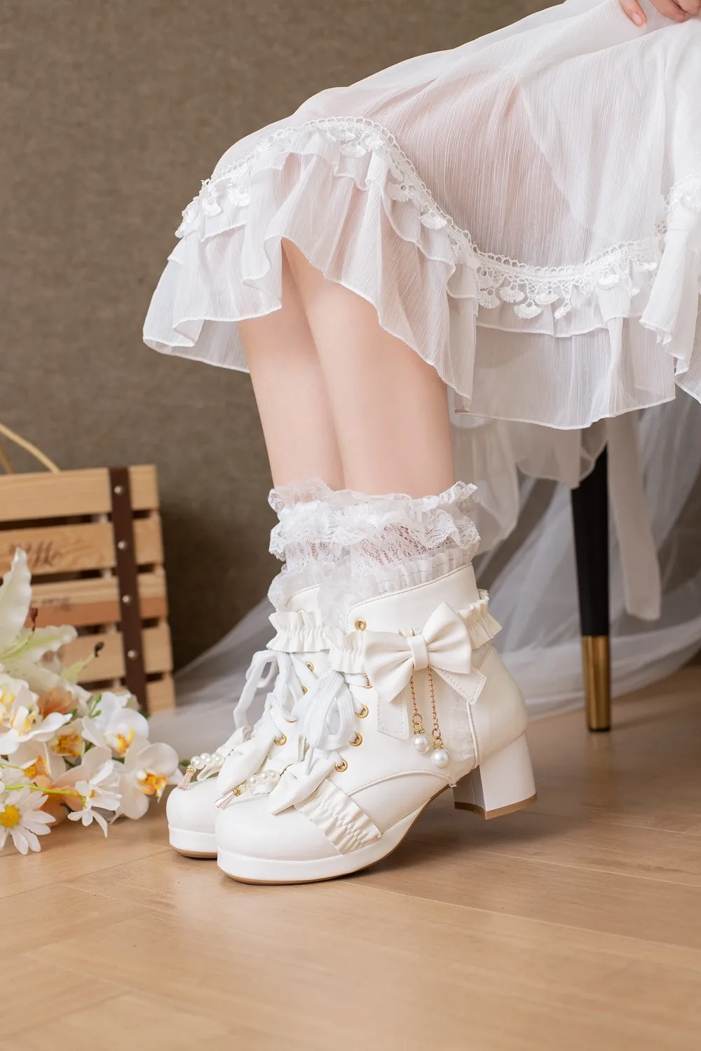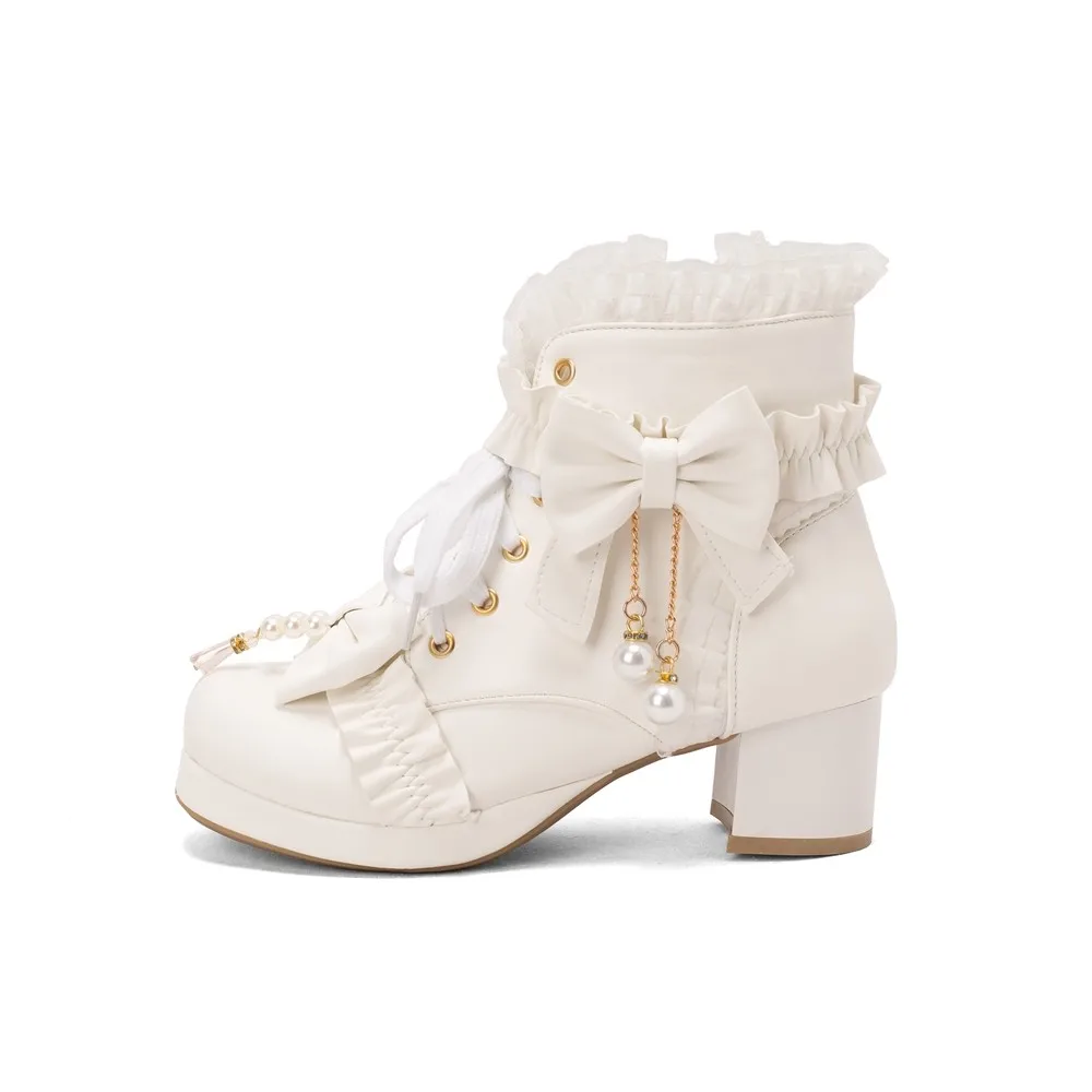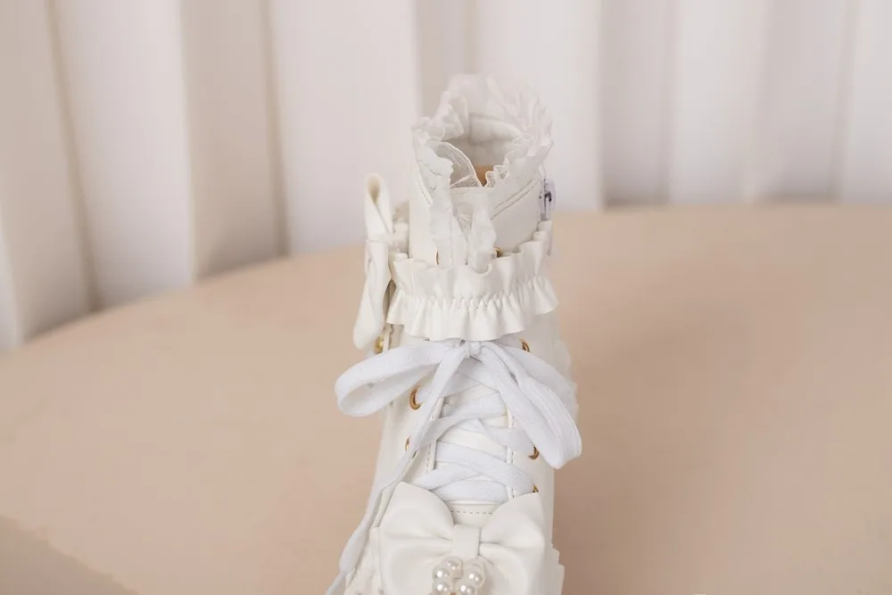LBSFY - Pink White Black Chunky Heel Lolita Shoes Butterfly-knot Pearls Lace Up Womens Cosplay Princess Cute Sweet Winter Ankle Boots 42