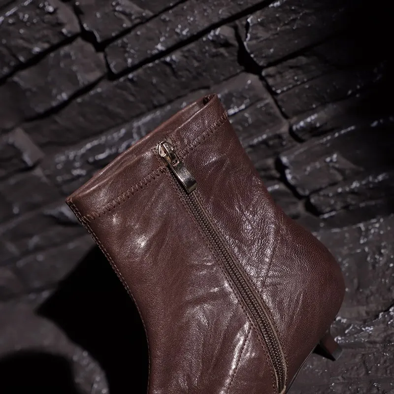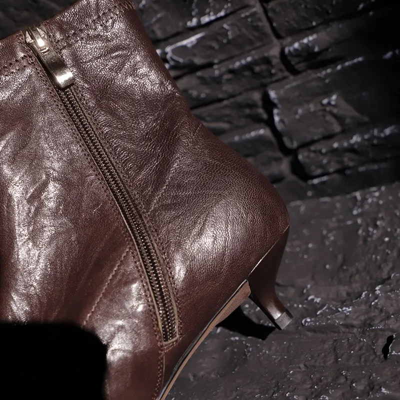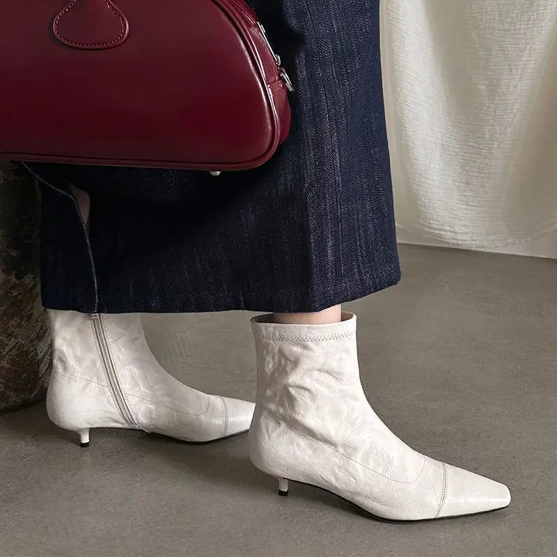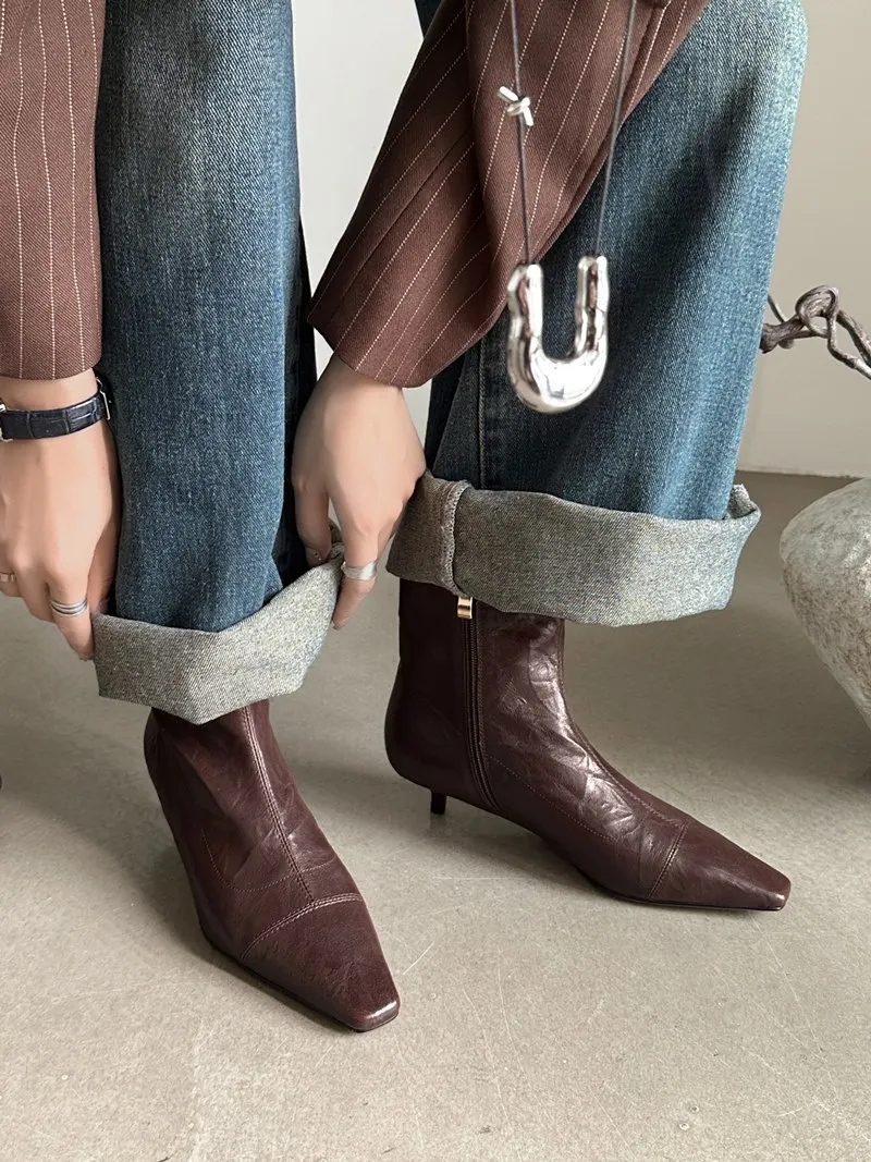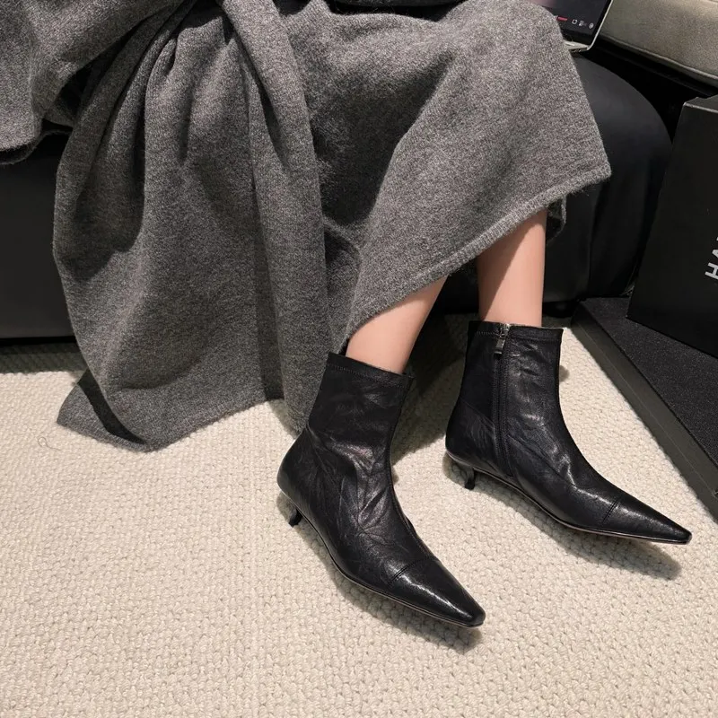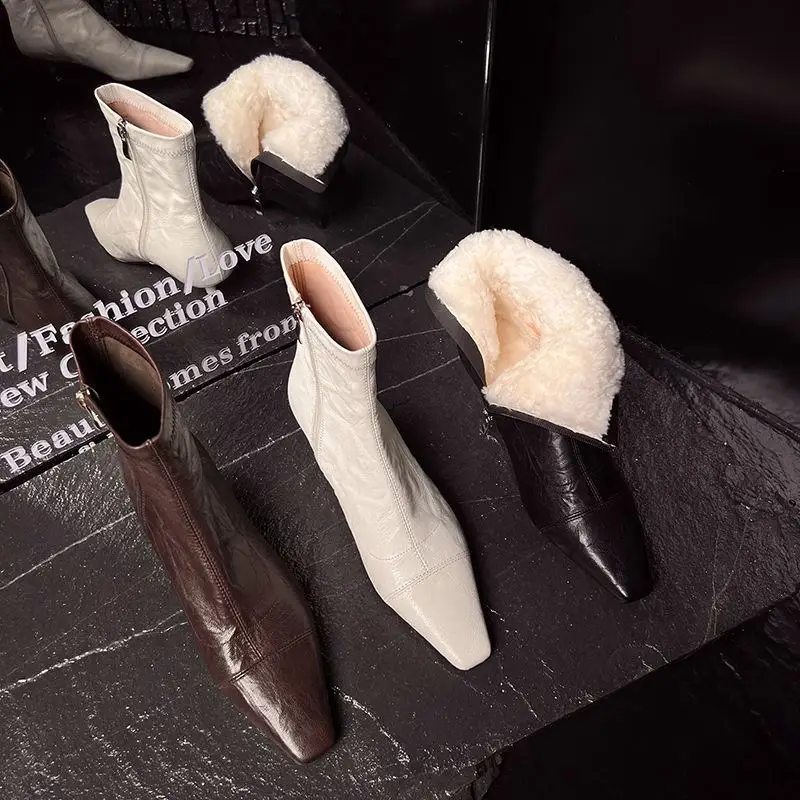 LBSFY - Plus Size 34-41 New Genuine Leather Boots Women Zipper Pointed Toe Mid Heels Autumn Winter Ankle Boos Wool Snow Boots