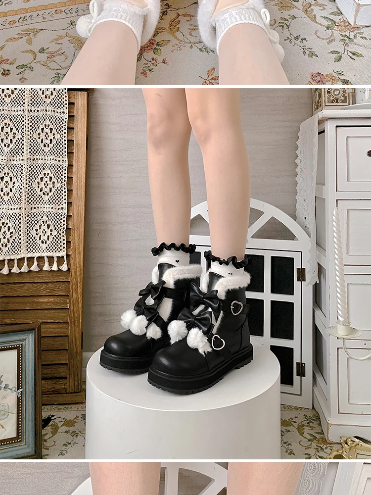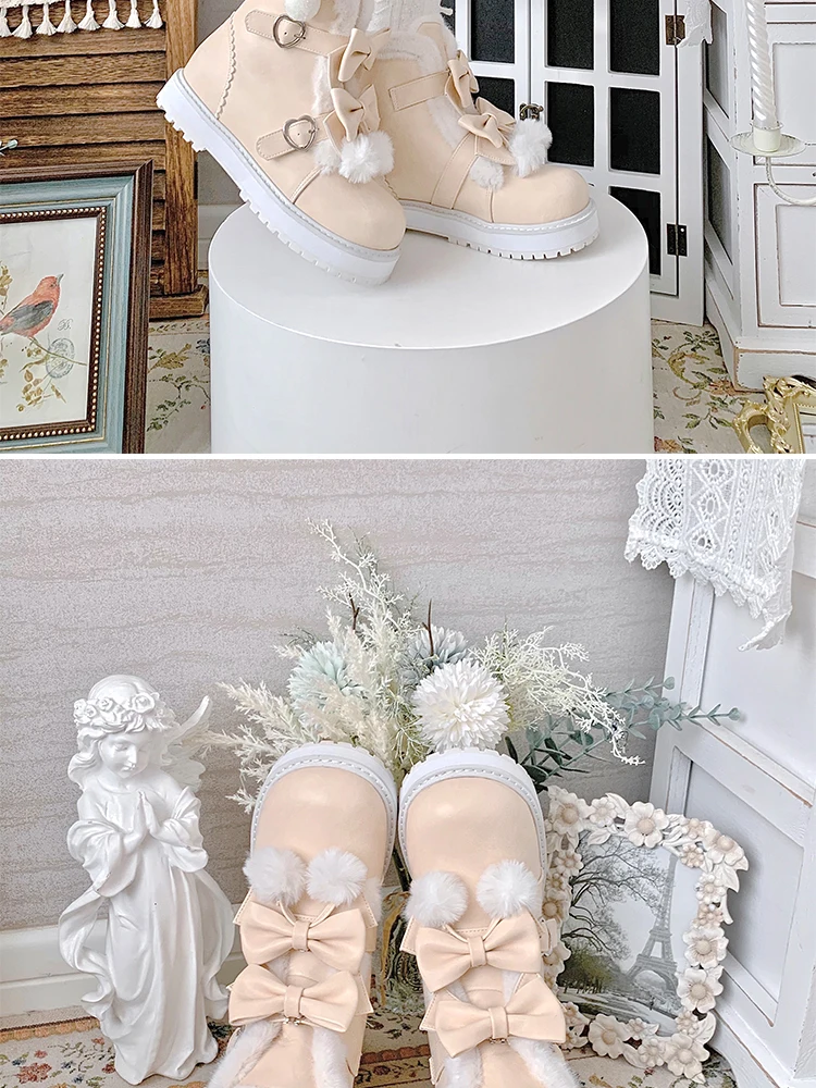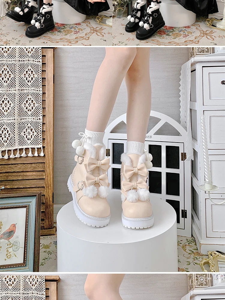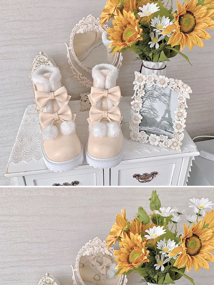LBSFY - Plush Ball Bowknot Ankle Lolita Boots Women's Winter Velvet Lolita Boots Cute Snow Boots Kawaii Cute Jk Girls Shoes