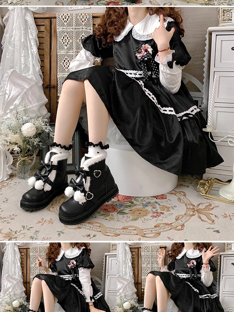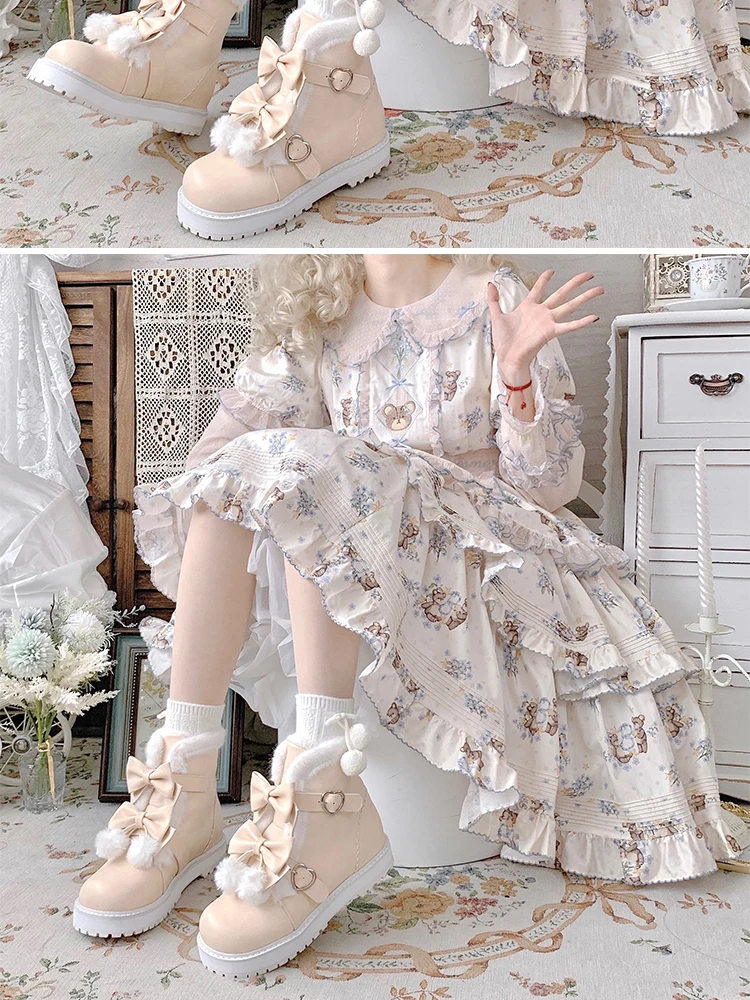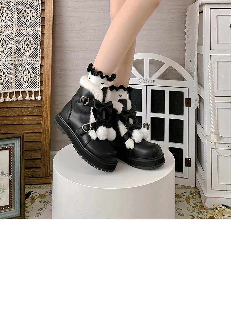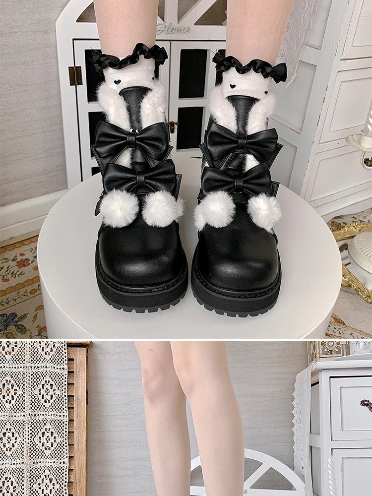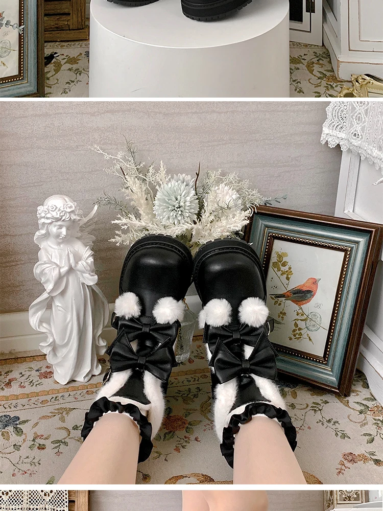 LBSFY - Plush Ball Bowknot Ankle Lolita Boots Women's Winter Velvet Lolita Boots Cute Snow Boots Kawaii Cute Jk Girls Shoes