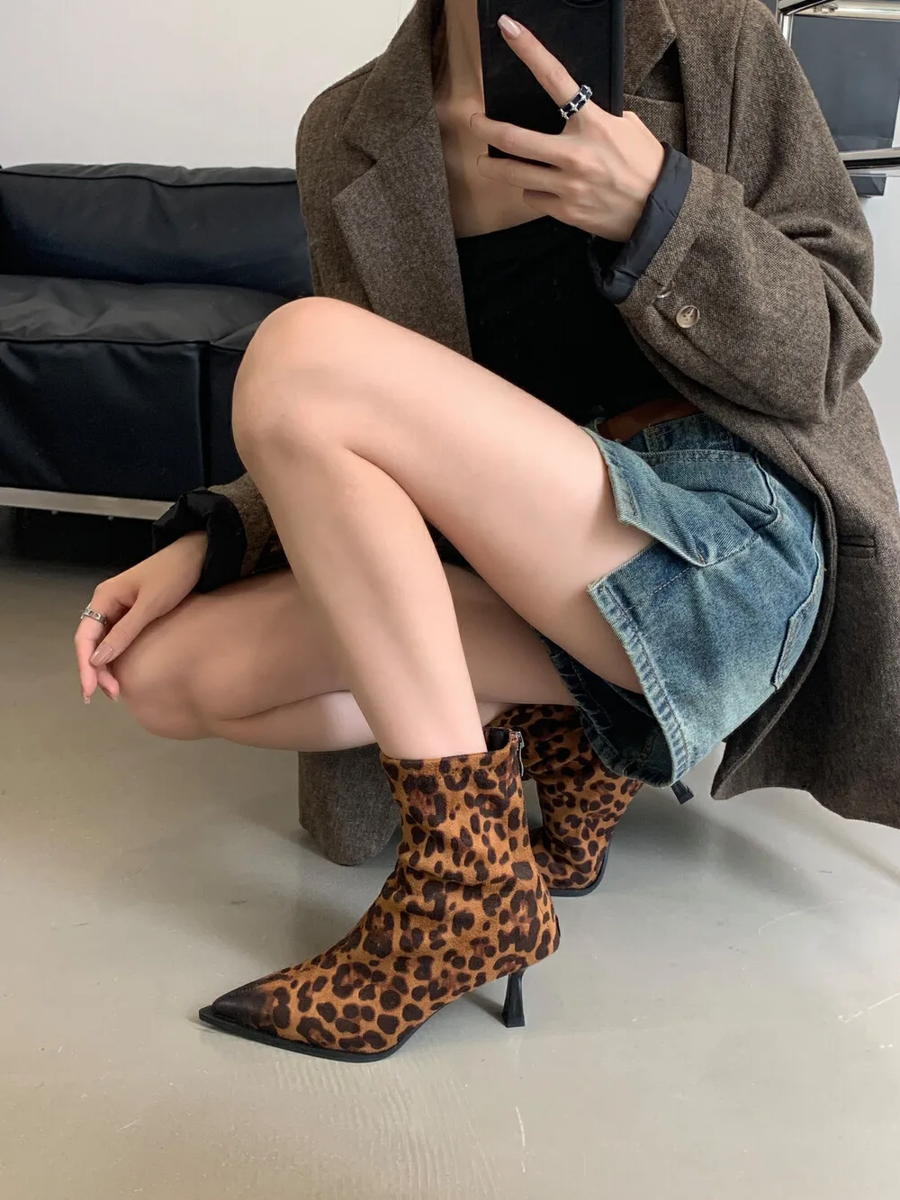 LBSFY - Pointed Toe Women Ankle Boots 2024 New Arrivals Black Leopard Brown Beig Thin High Heels Sock Stretch Botas Fashion Chelsea Boot