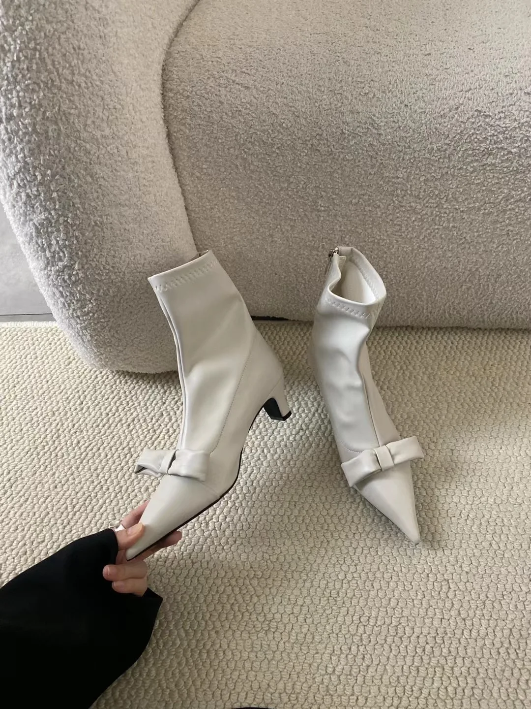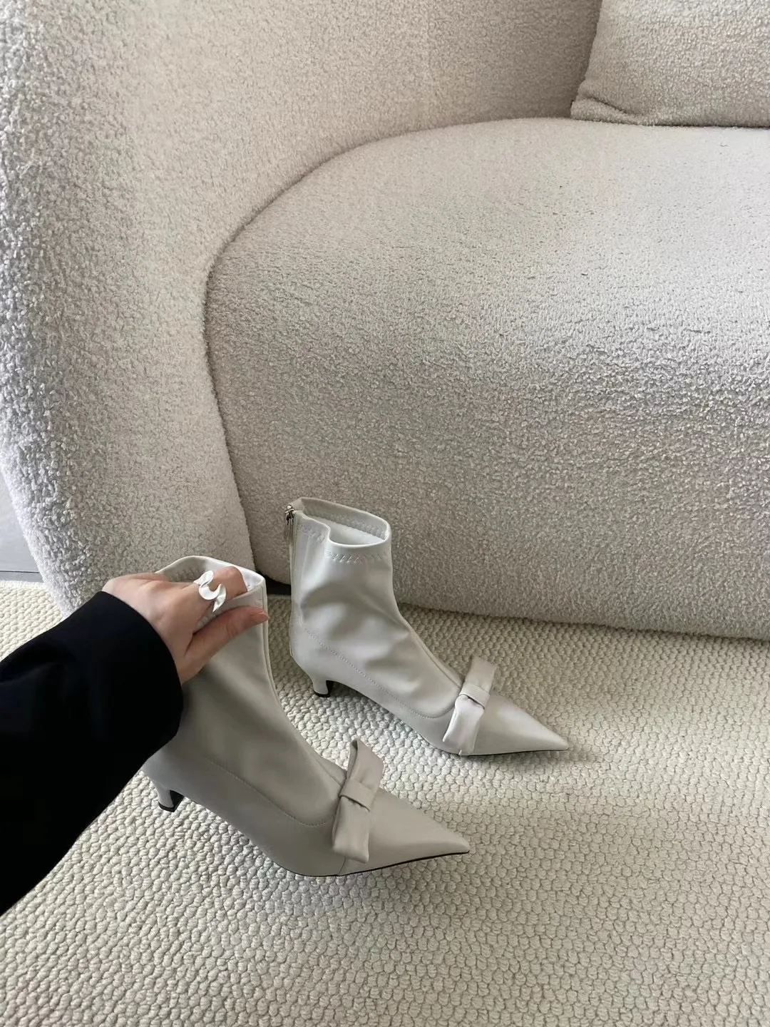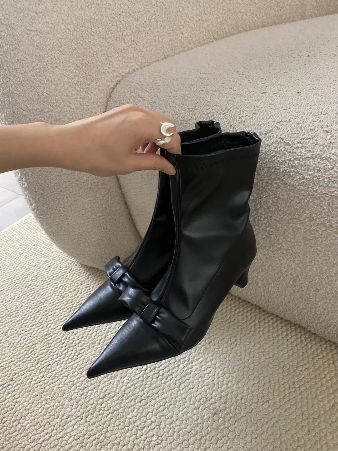 LBSFY - Pointed Toe Women Ankle Boots Bow Design Thick Mid Heels 2024 New Arrivals Party Pumps Fashion Party Pumps Back Zipper Stretch