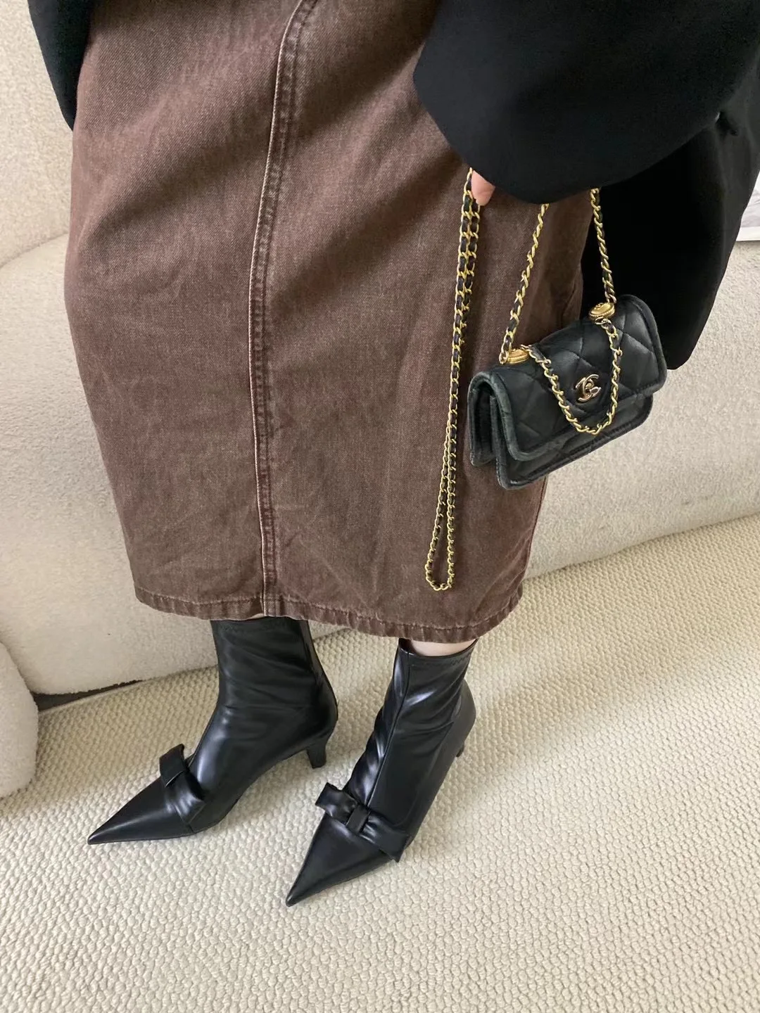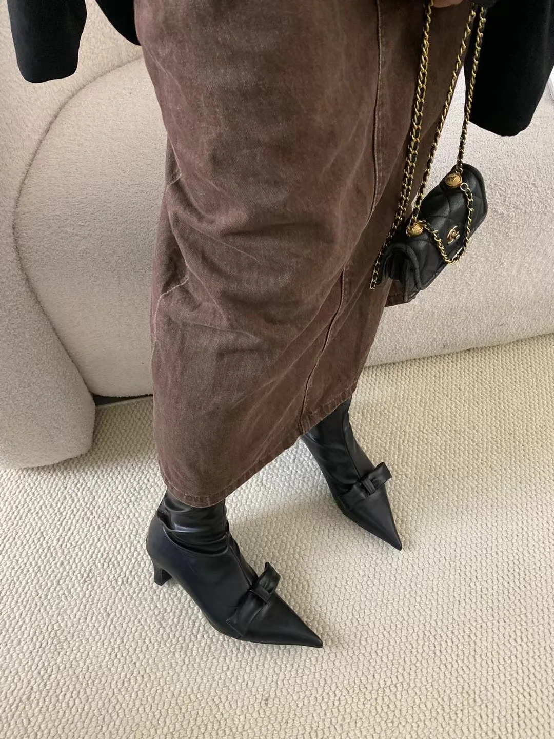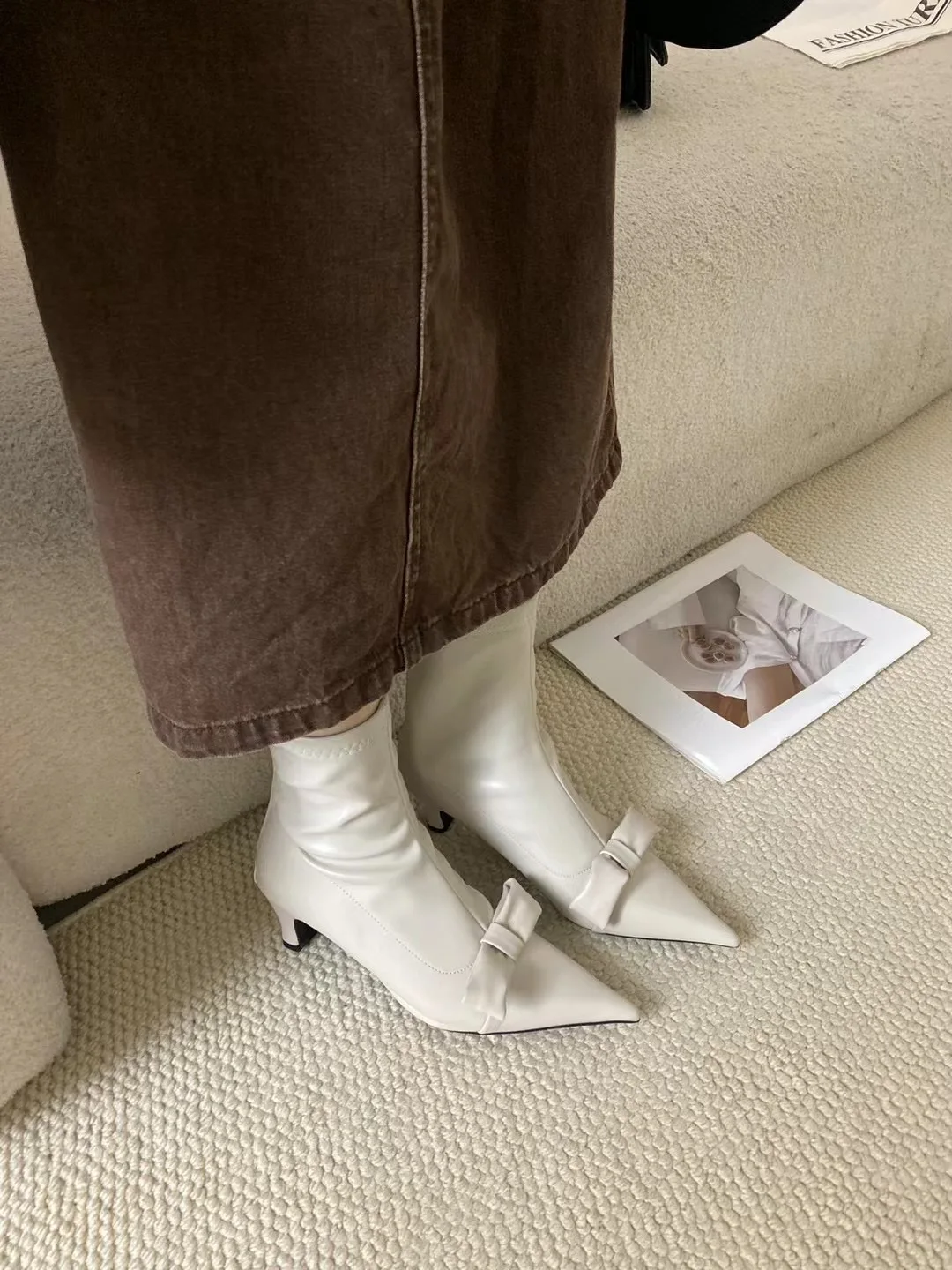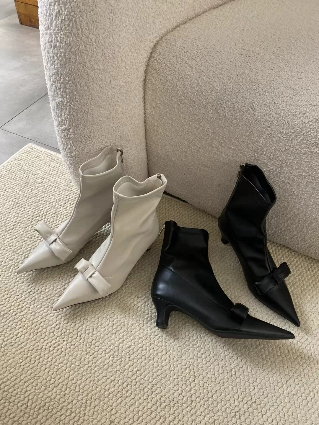 LBSFY - Pointed Toe Women Ankle Boots Bow Design Thick Mid Heels 2024 New Arrivals Party Pumps Fashion Party Pumps Back Zipper Stretch