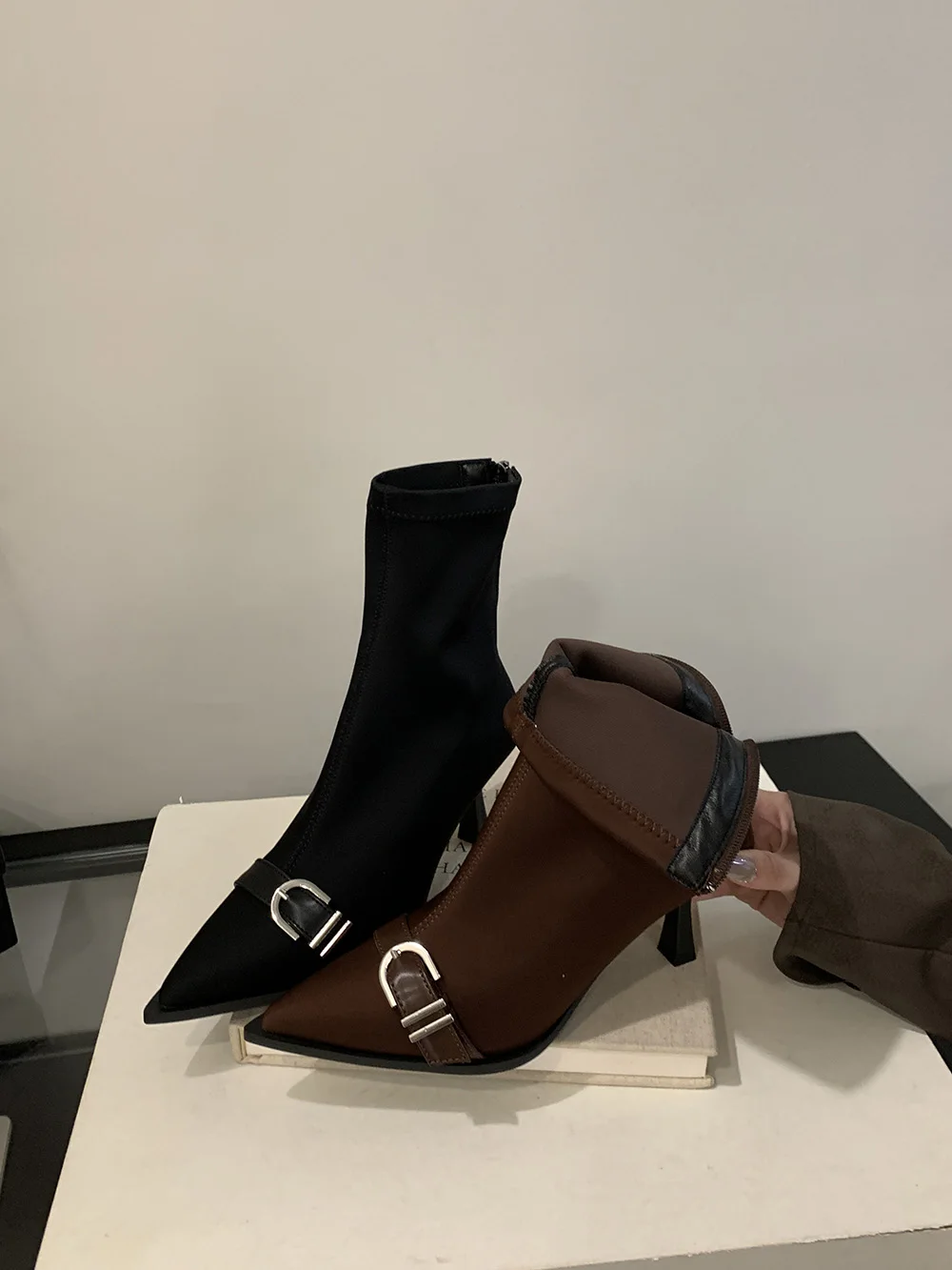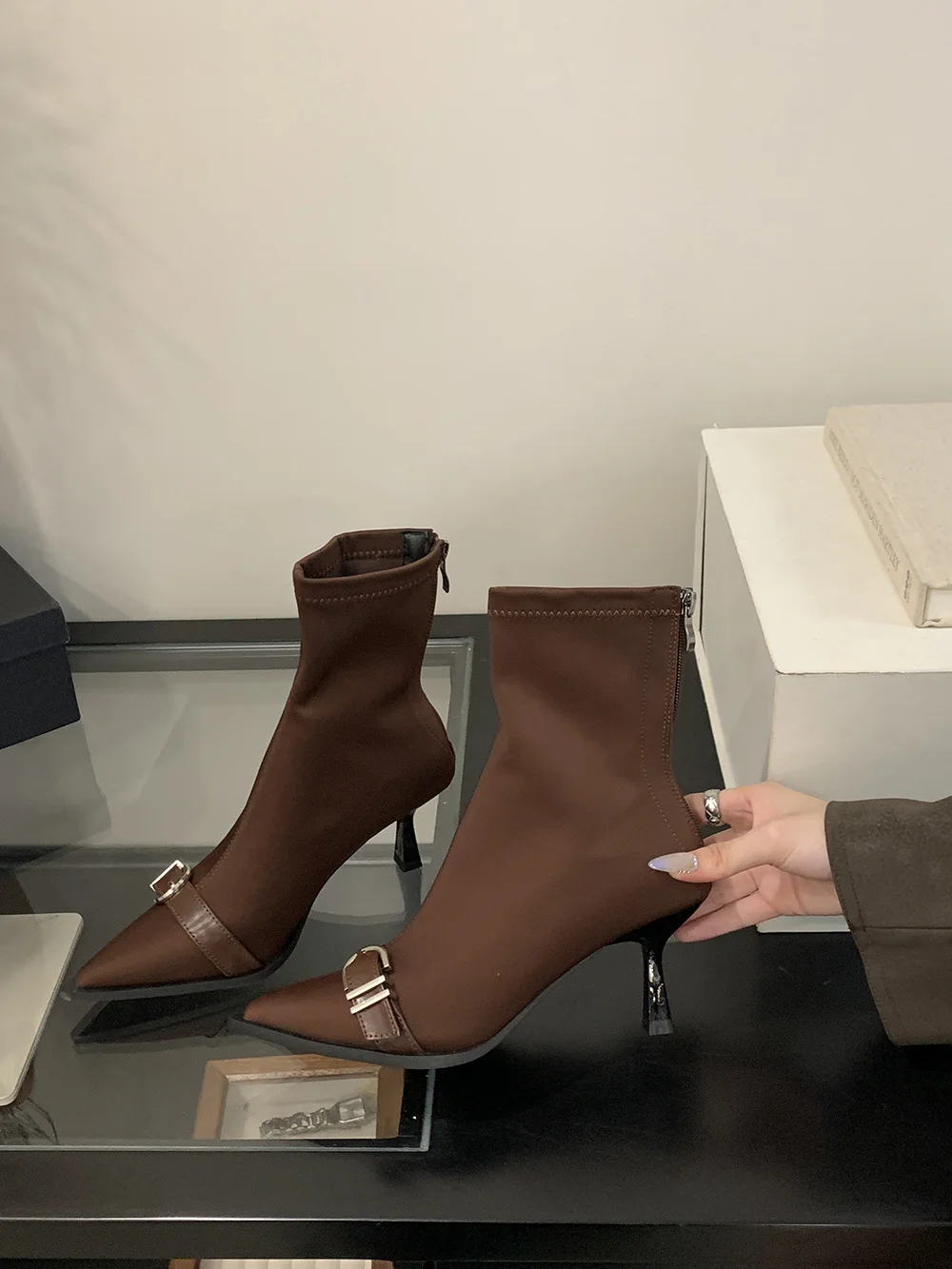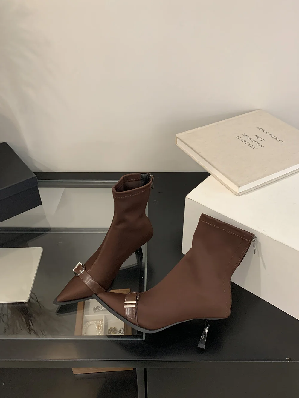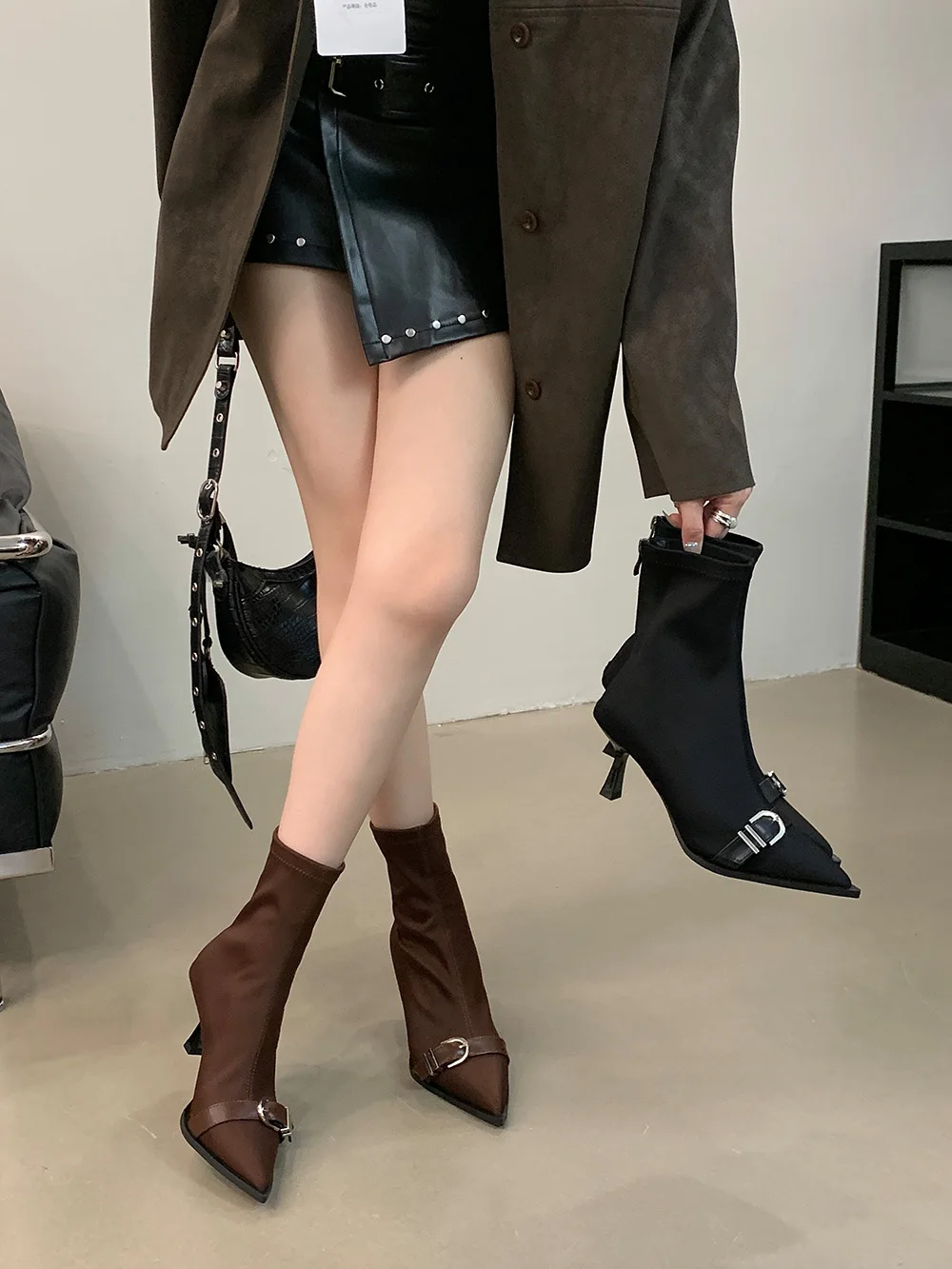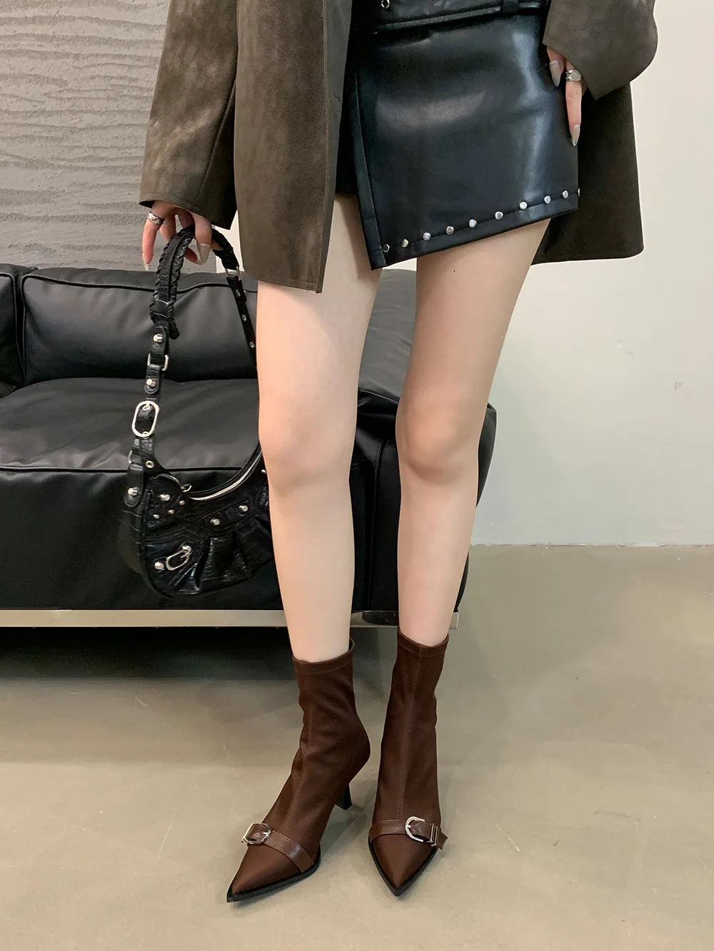LBSFY - Pointed Toe Women Ankle Boots Chelsea Boots Thin High Heels Black Brown Rivet Design Fashion Dress Shoes Woman Size 35-39 Pumps