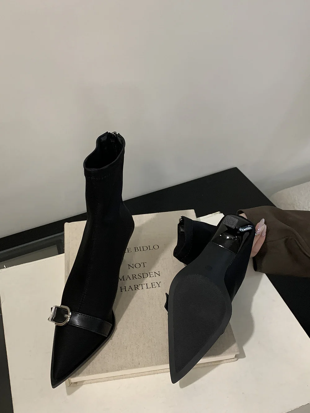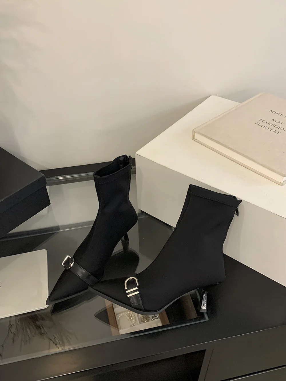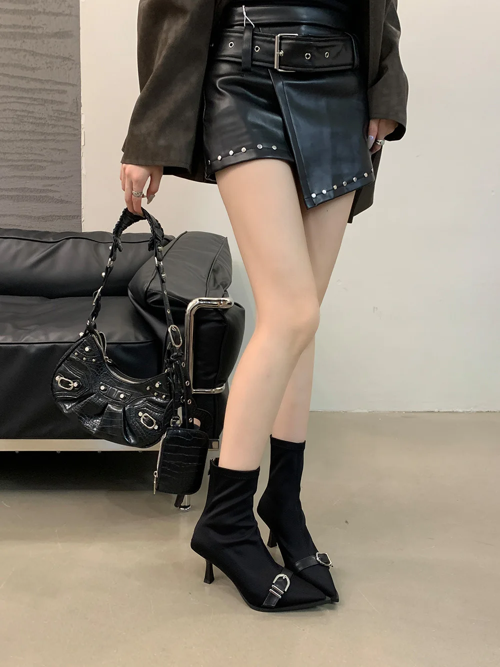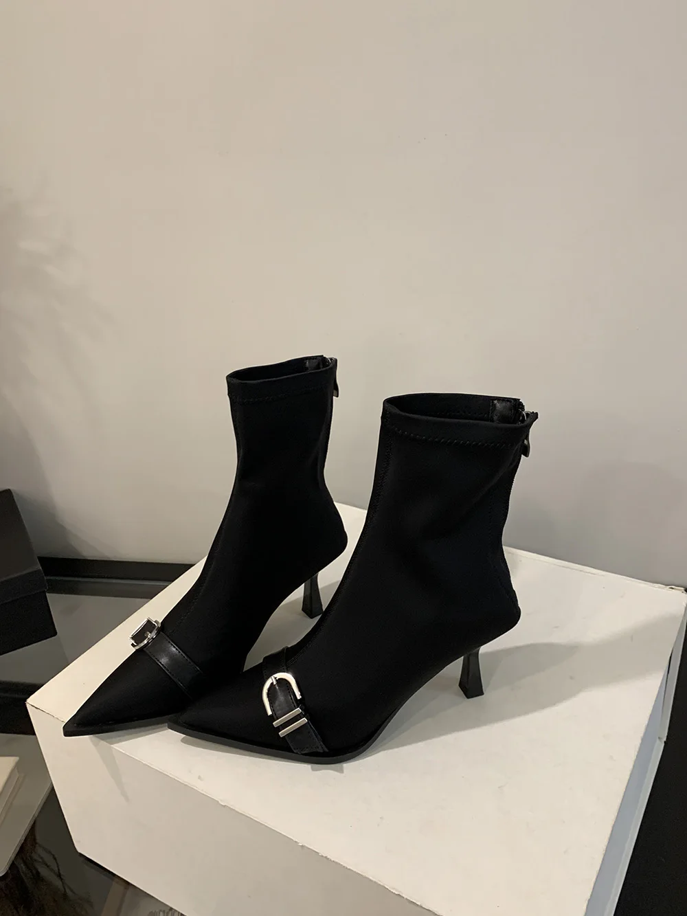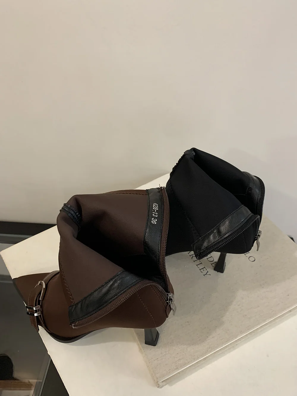 LBSFY - Pointed Toe Women Ankle Boots Chelsea Boots Thin High Heels Black Brown Rivet Design Fashion Dress Shoes Woman Size 35-39 Pumps