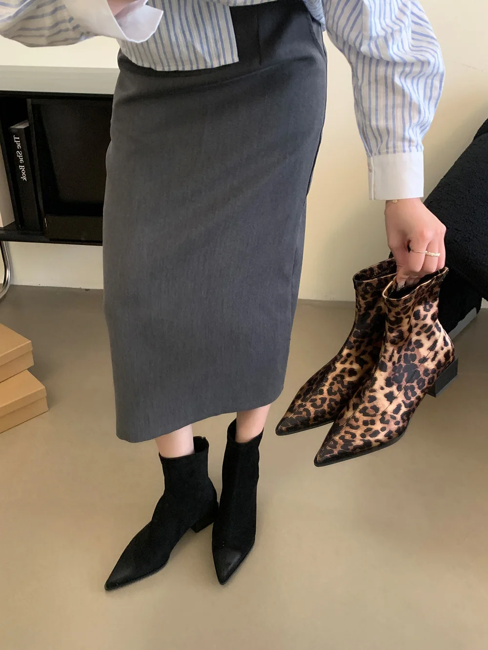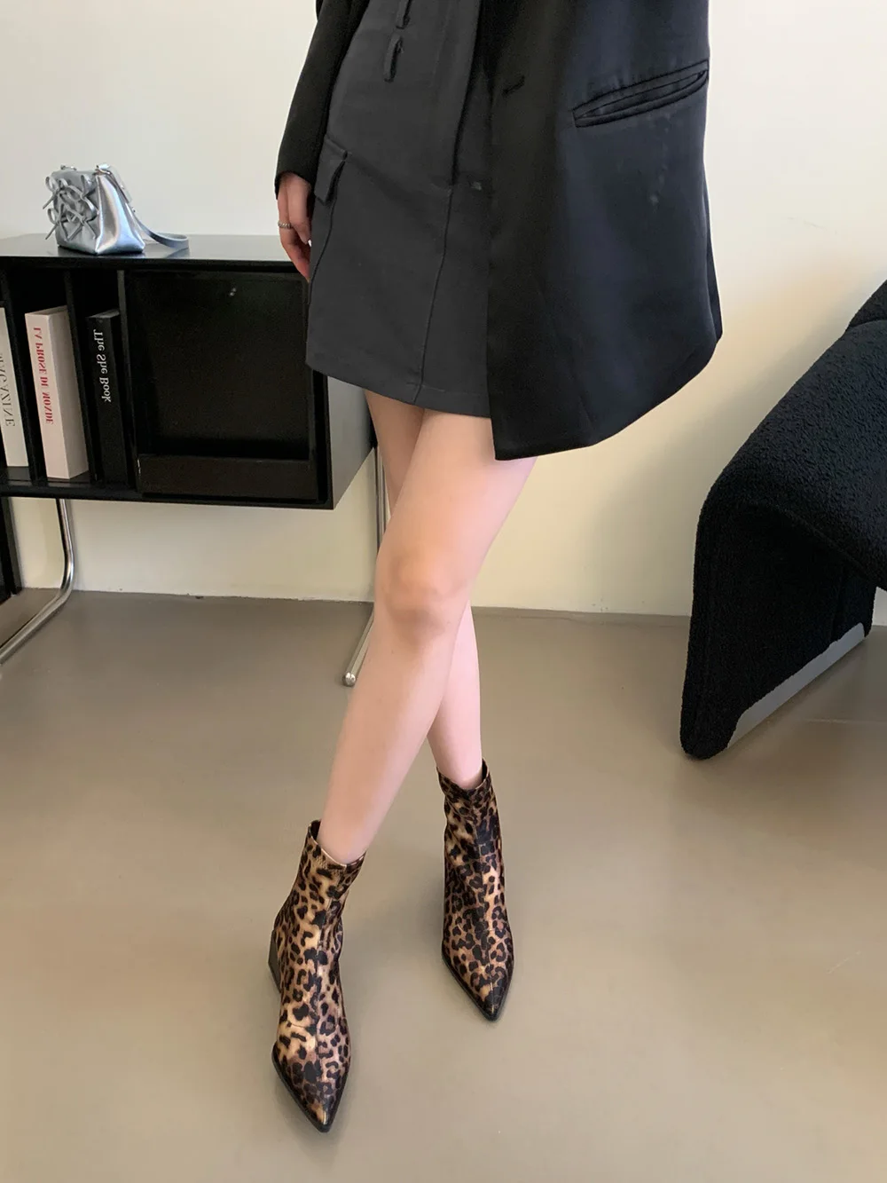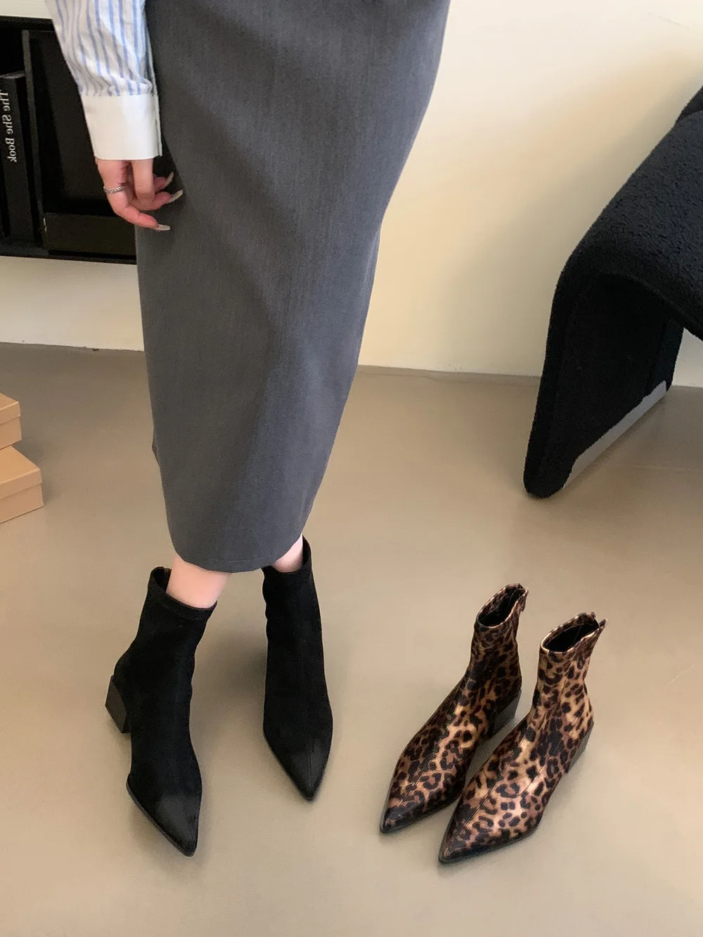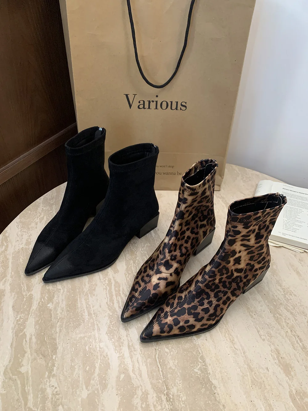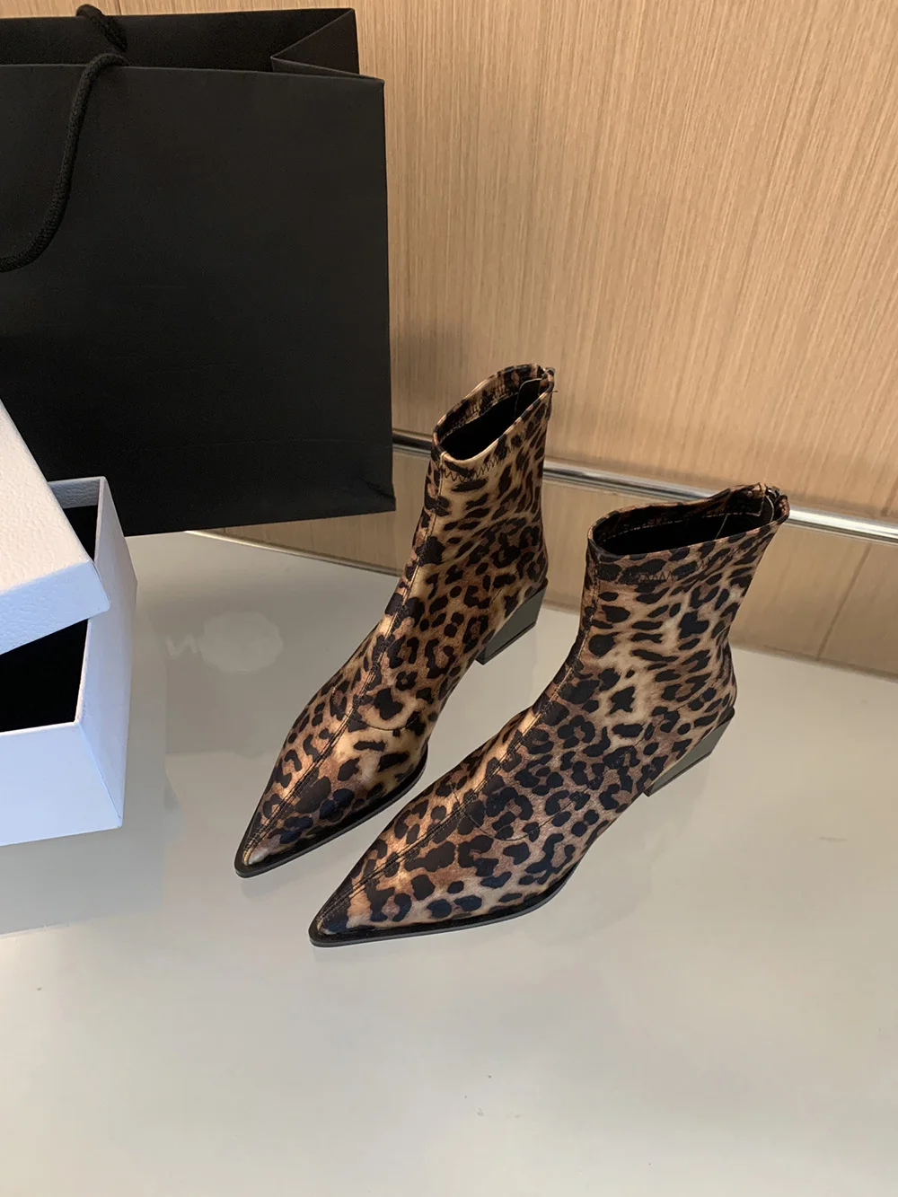 LBSFY - Pointed Toe Women Ankle Boots Leopard Black Beige Winter Chelsea Boots Flat Low Heels Sock Stretch Shoes Woman Size 35-39