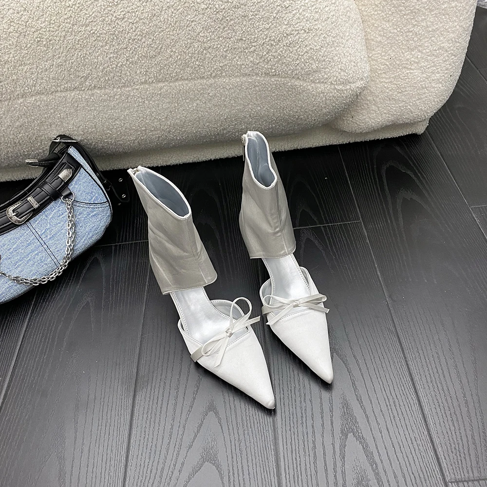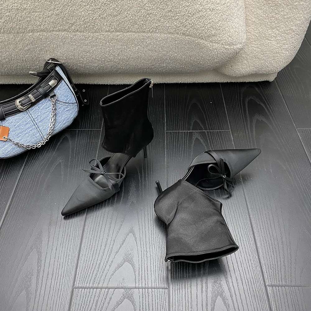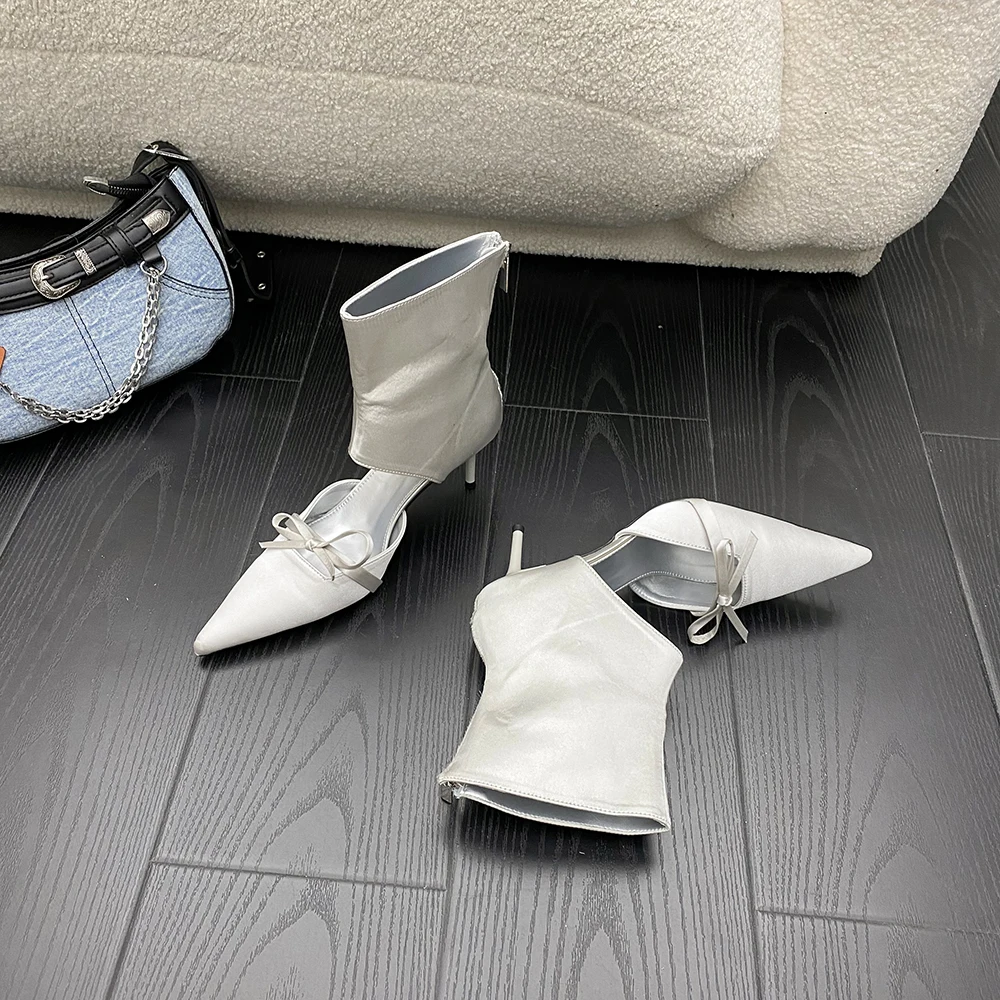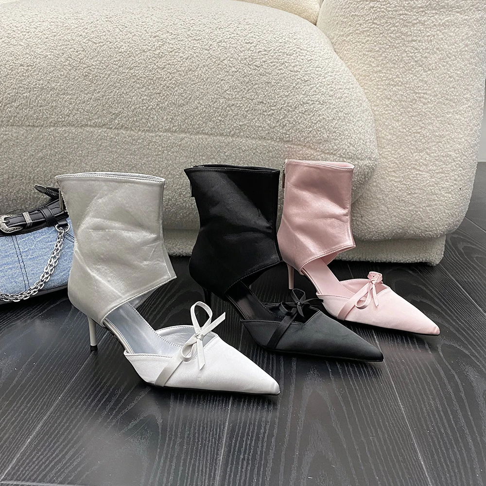 LBSFY - Pointed Toe Women Ankle Boots Silk Summer Chelsea Botas Thin High heels Bow Design Black Pink Grey Back Zipper Sock Botas 35-40