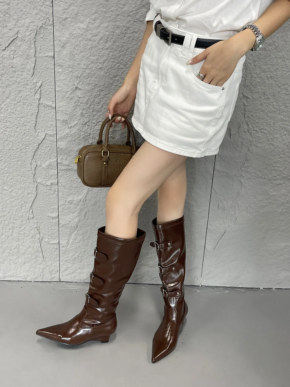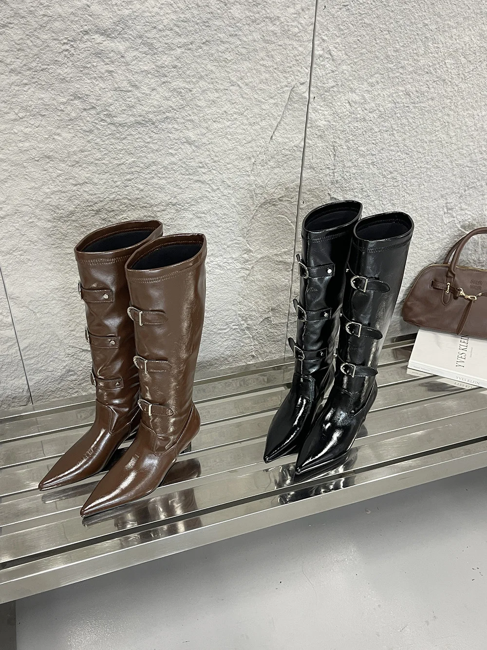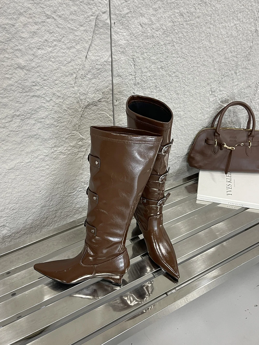 LBSFY - Pointed Toe Women Knee High Boots Belt Buckle Design Black Brown Wedge High heels Slip On Winter Knight Chelsea Botas Sexy Party
