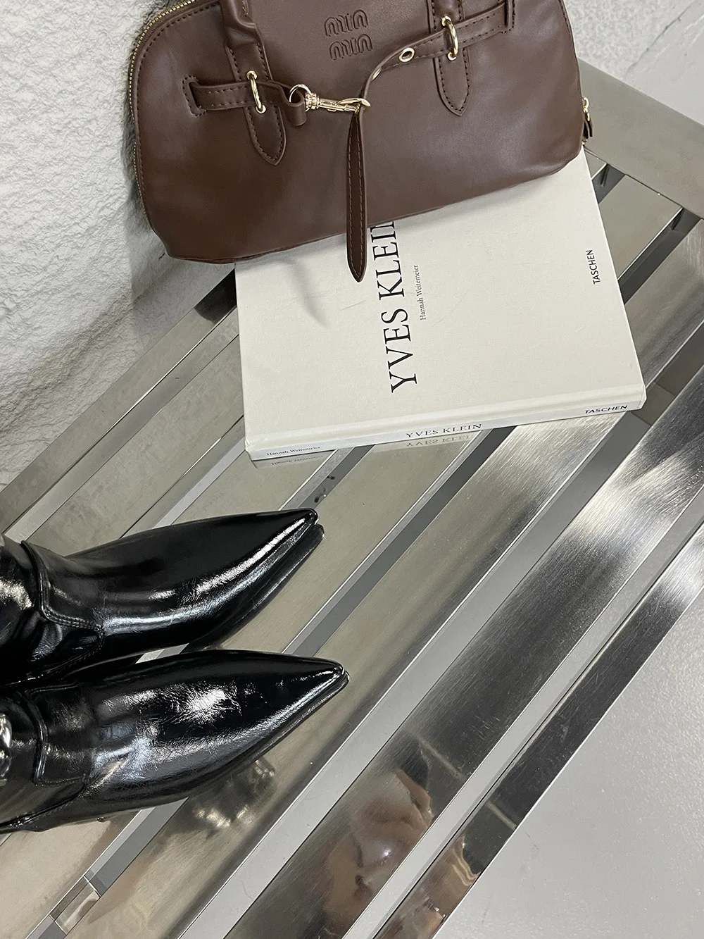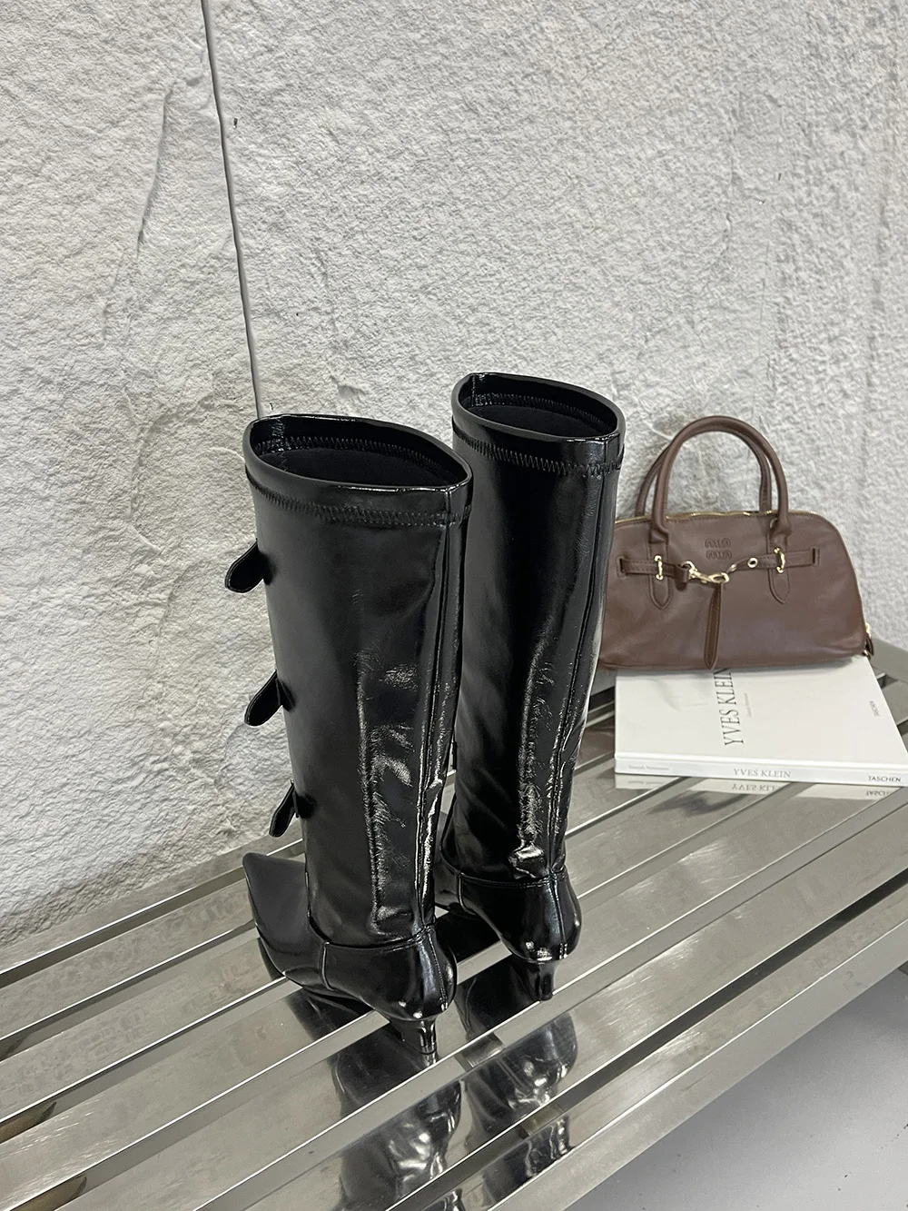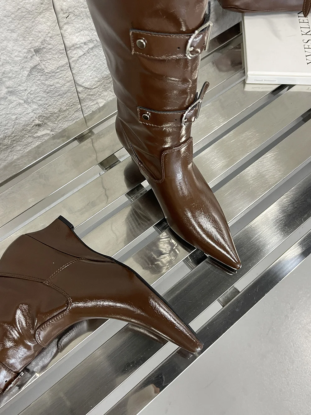 LBSFY - Pointed Toe Women Knee High Boots Belt Buckle Design Black Brown Wedge High heels Slip On Winter Knight Chelsea Botas Sexy Party