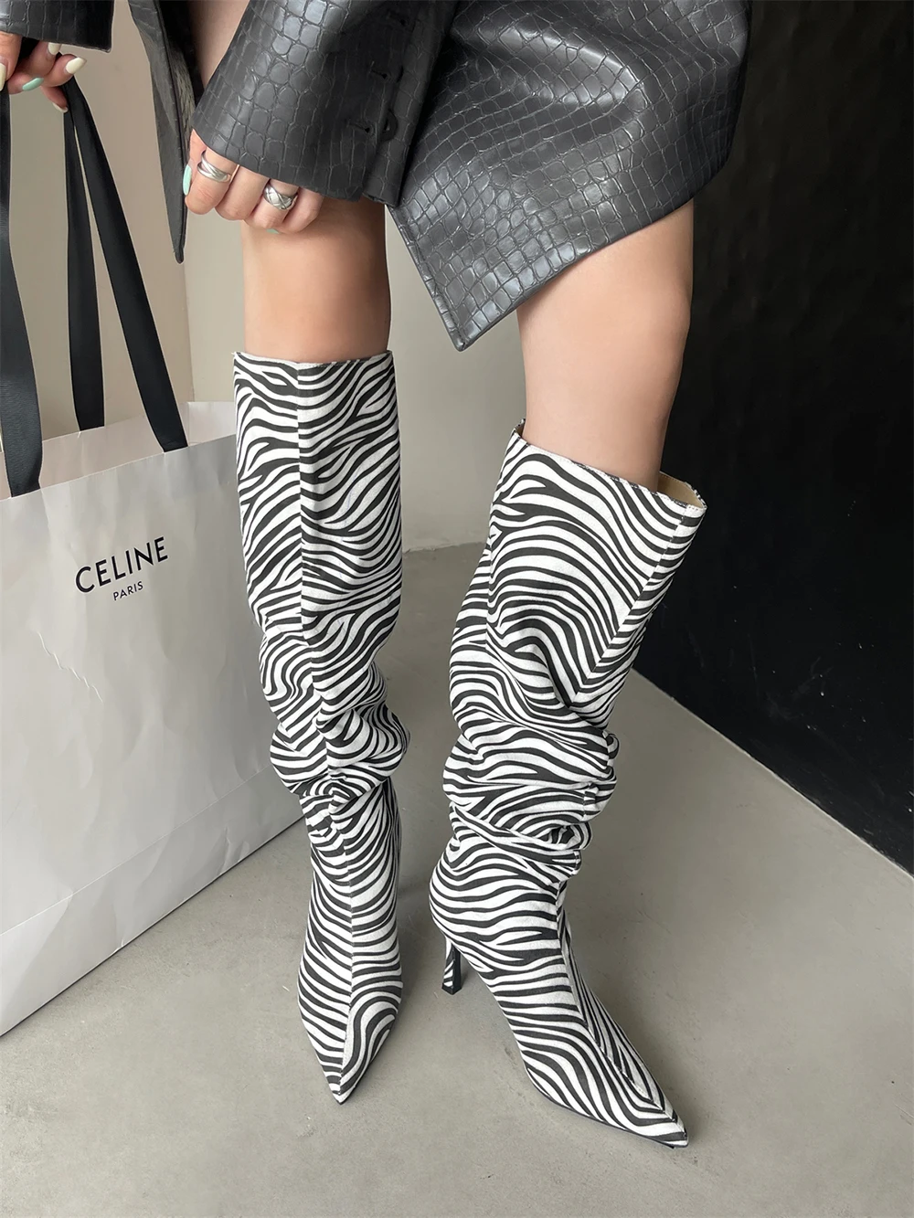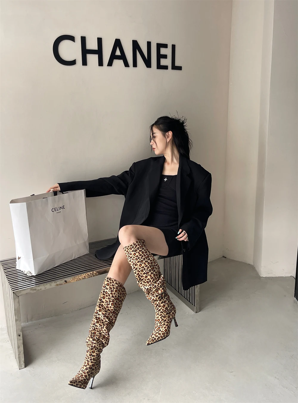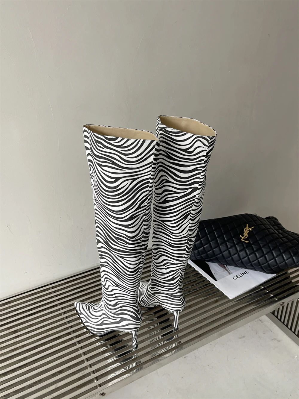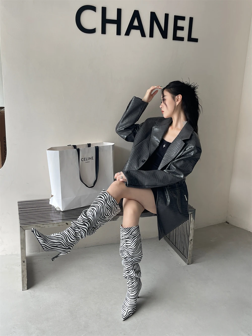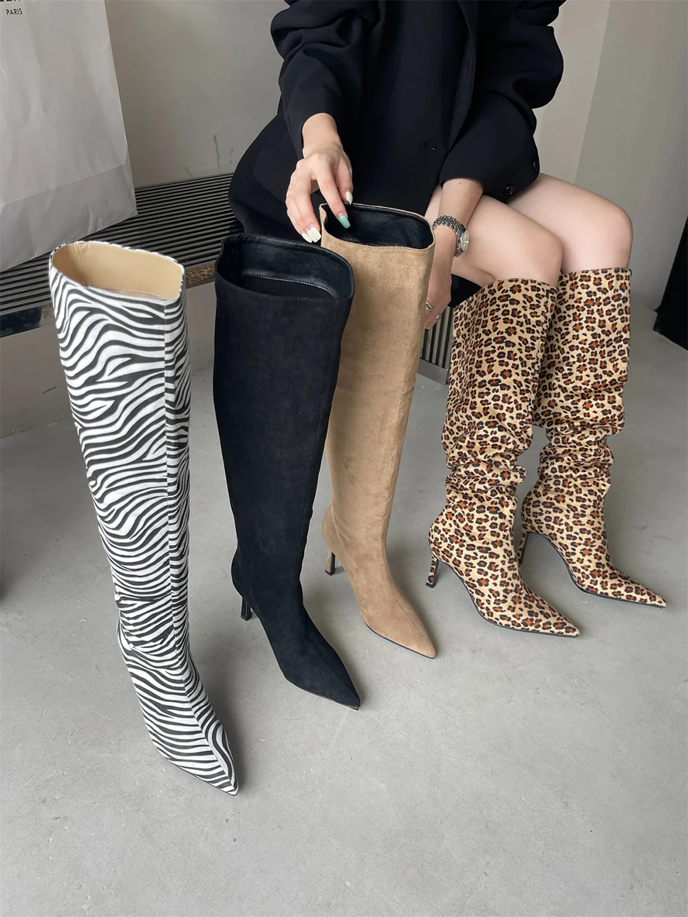 LBSFY - Pointed Toe Women Knee High Boots Chelsea Bootie Black Leopard Beige Zebra Winter Party Pumps Shoes Woman Slip On Size 35-40